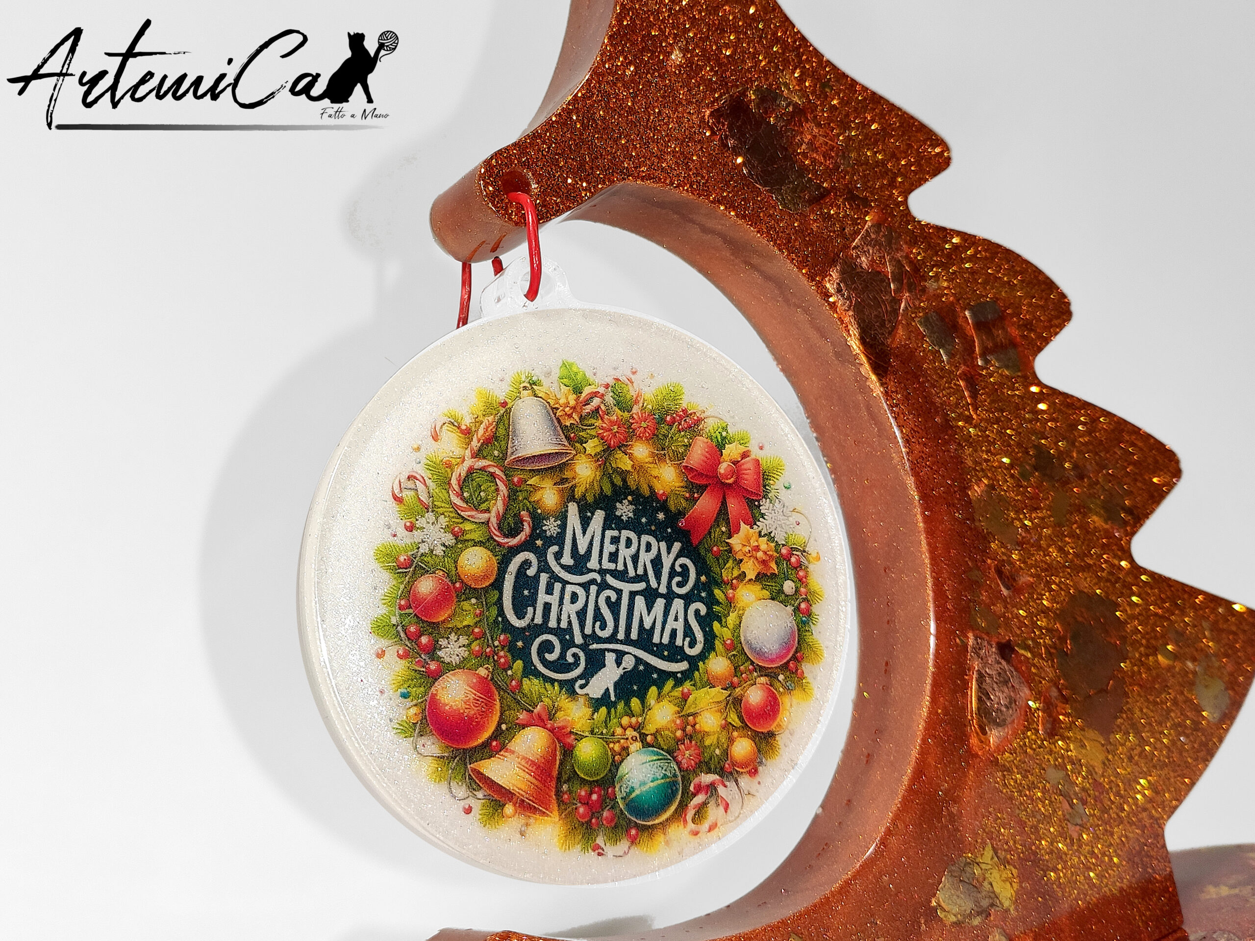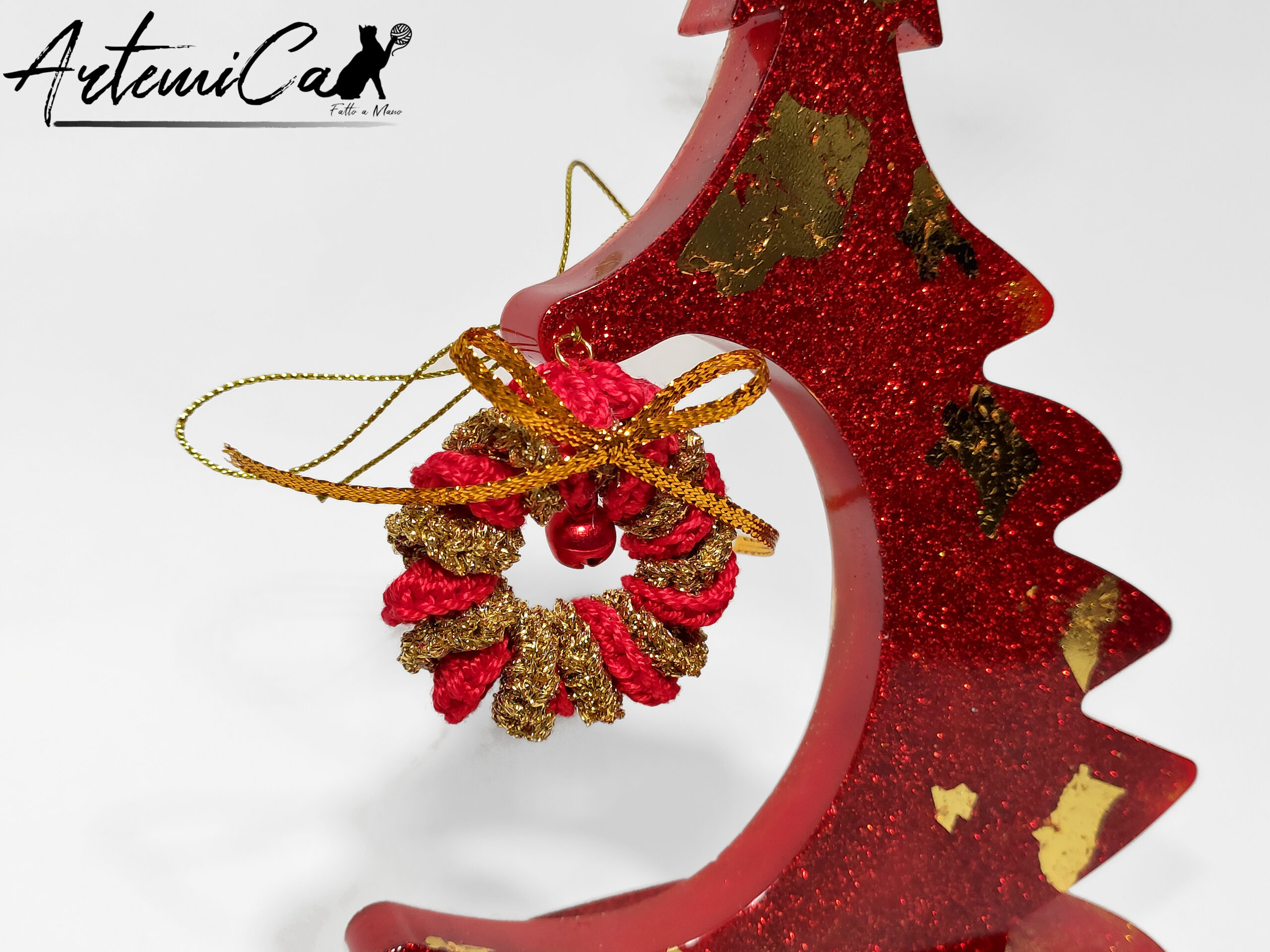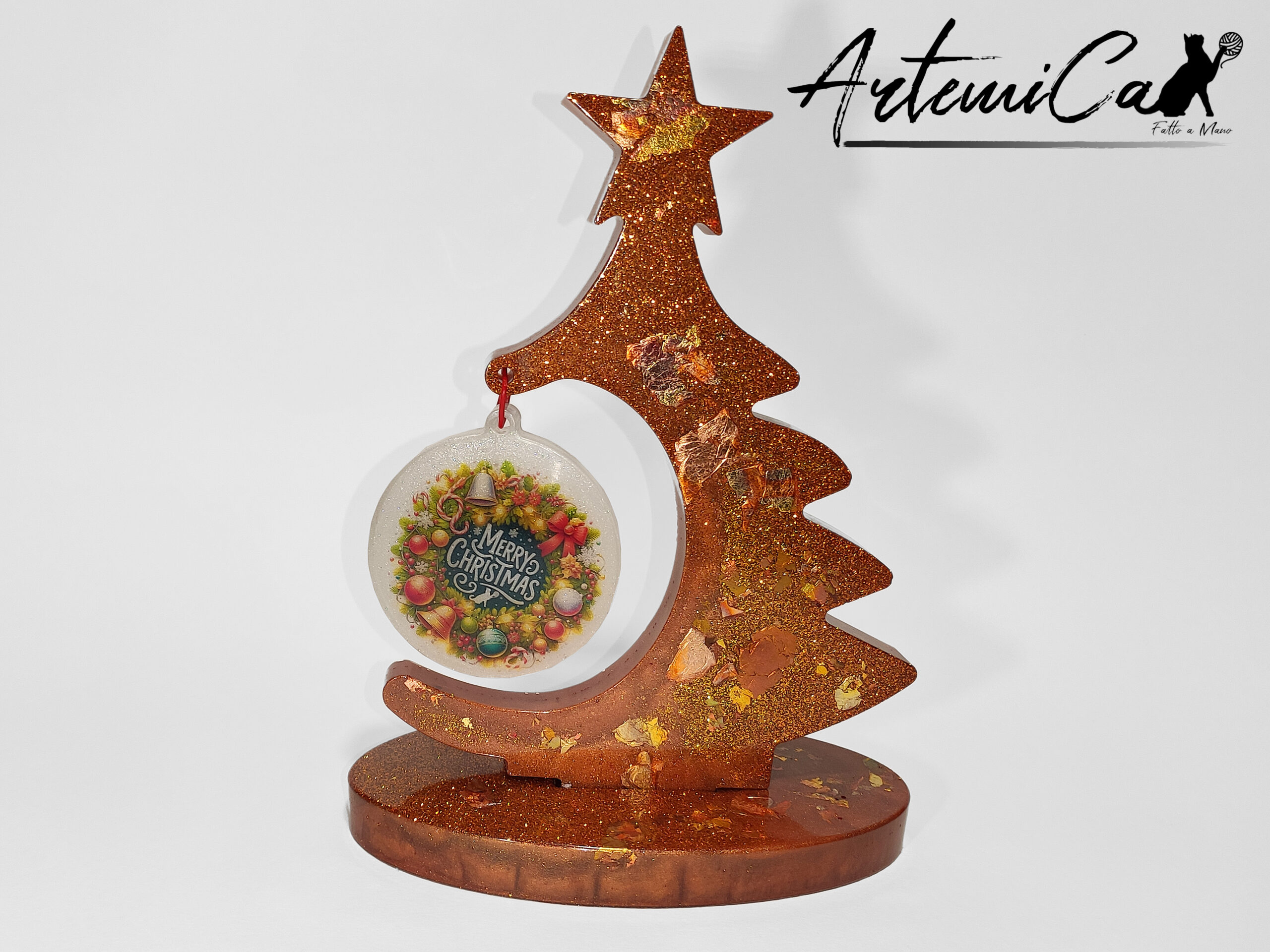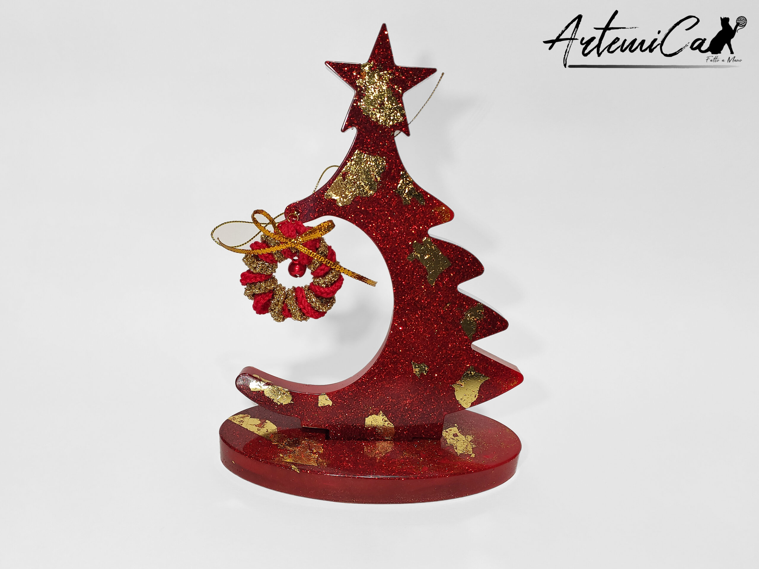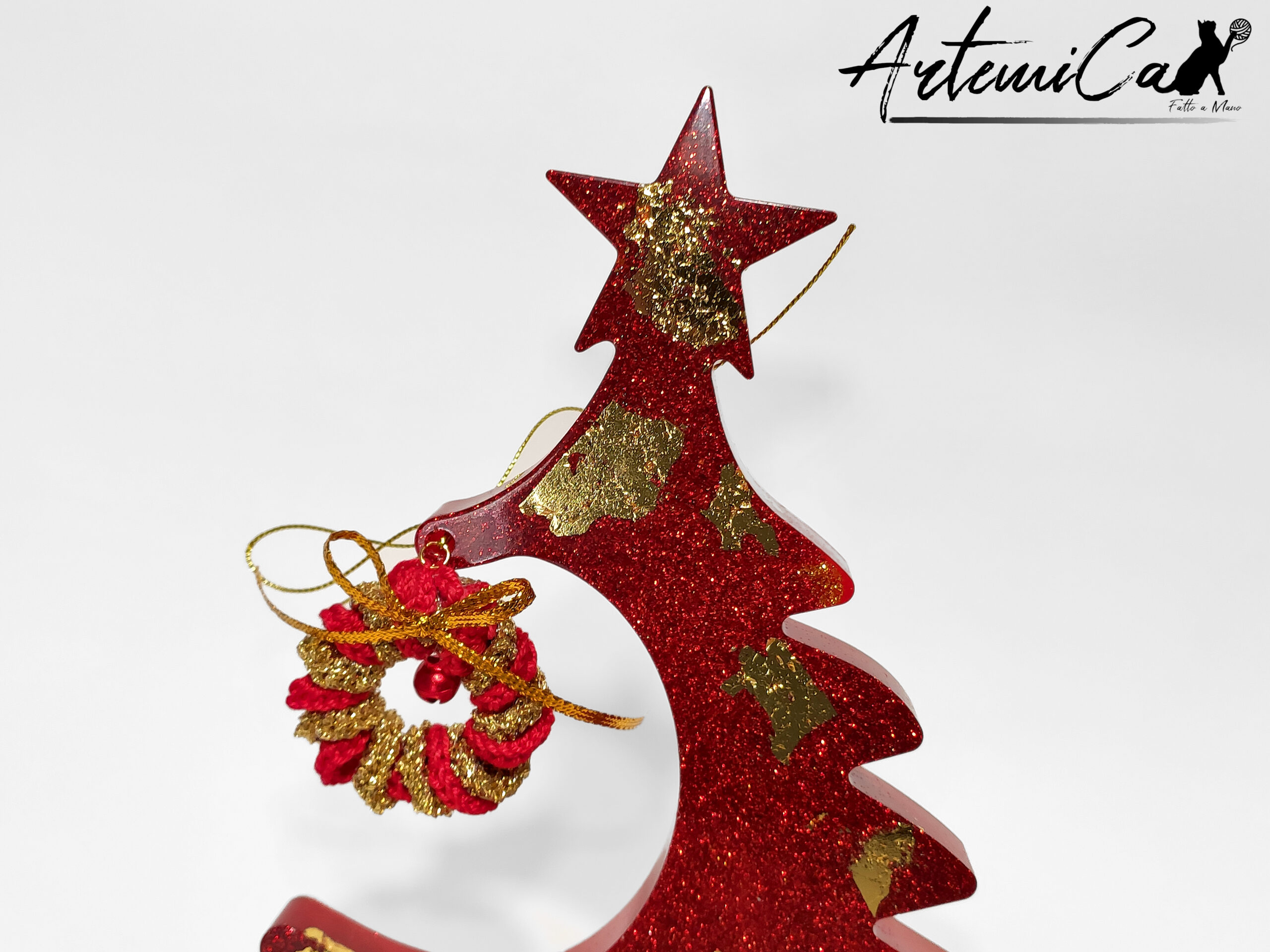 Ogni dettaglio racconta la cura e la passione di un lavoro artigianale: la foglia oro, stesa a mano, creano giochi di luce mozzafiato; la resina è lavorata con precisione per dare forma a curve armoniose e perfette. Toccarlo è come sentire il calore del Natale, mentre osservarlo ti immerge in un viaggio tra la magia delle decorazioni tradizionali e l’eleganza contemporanea.