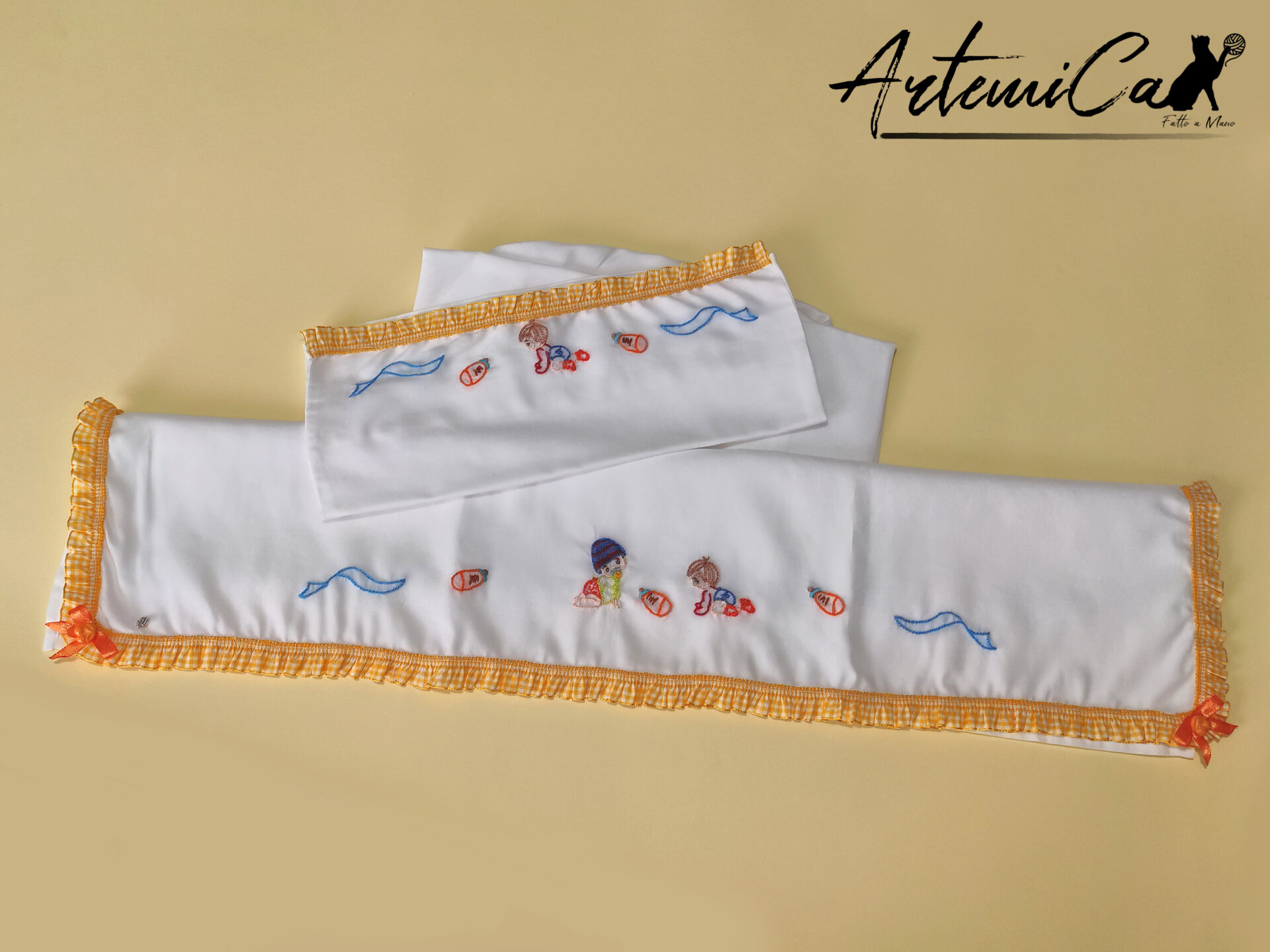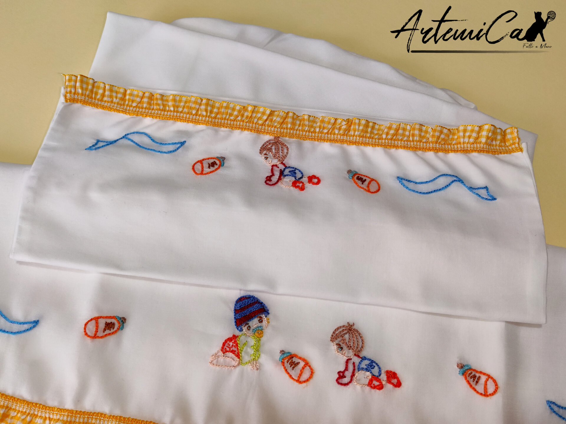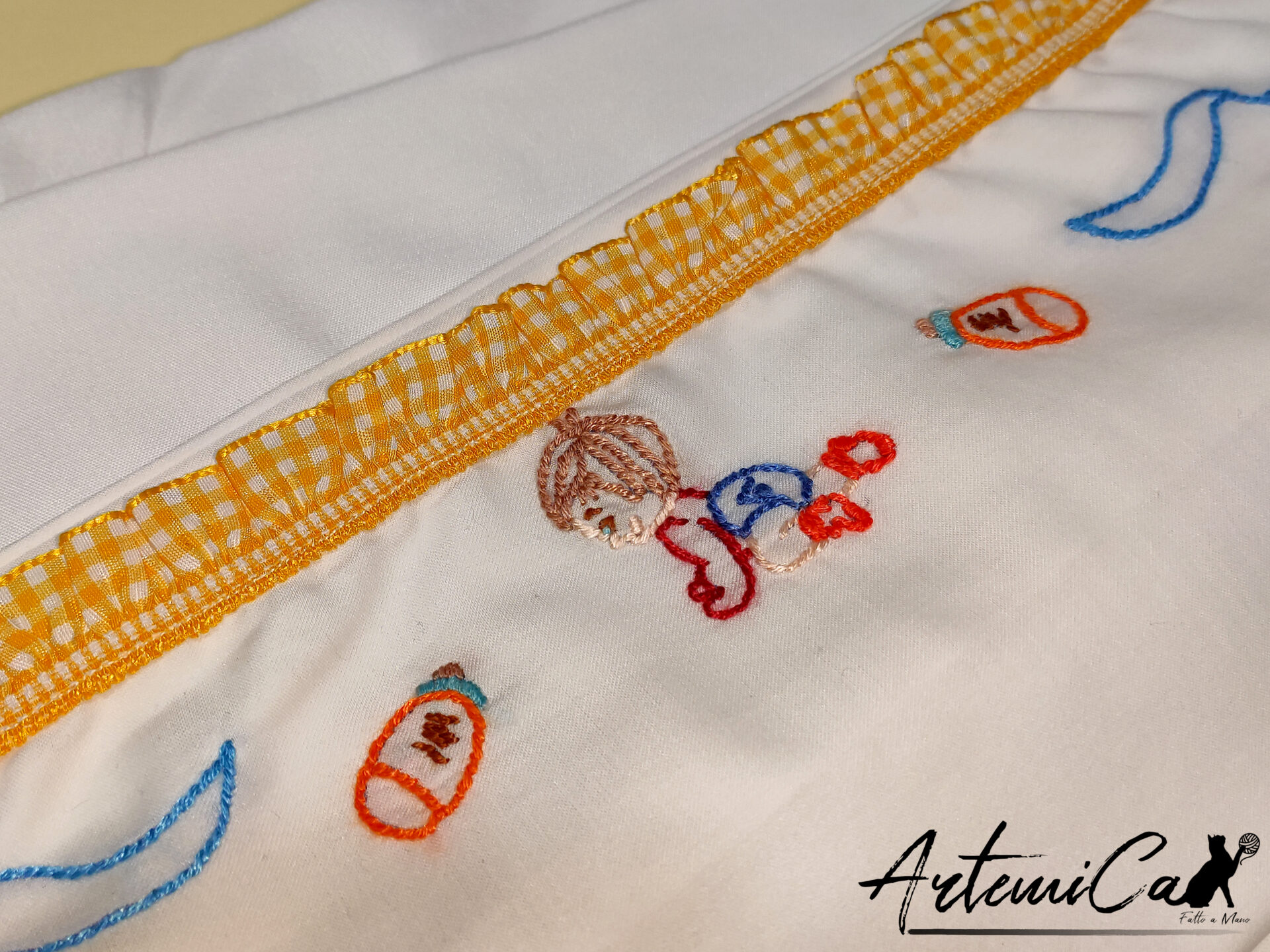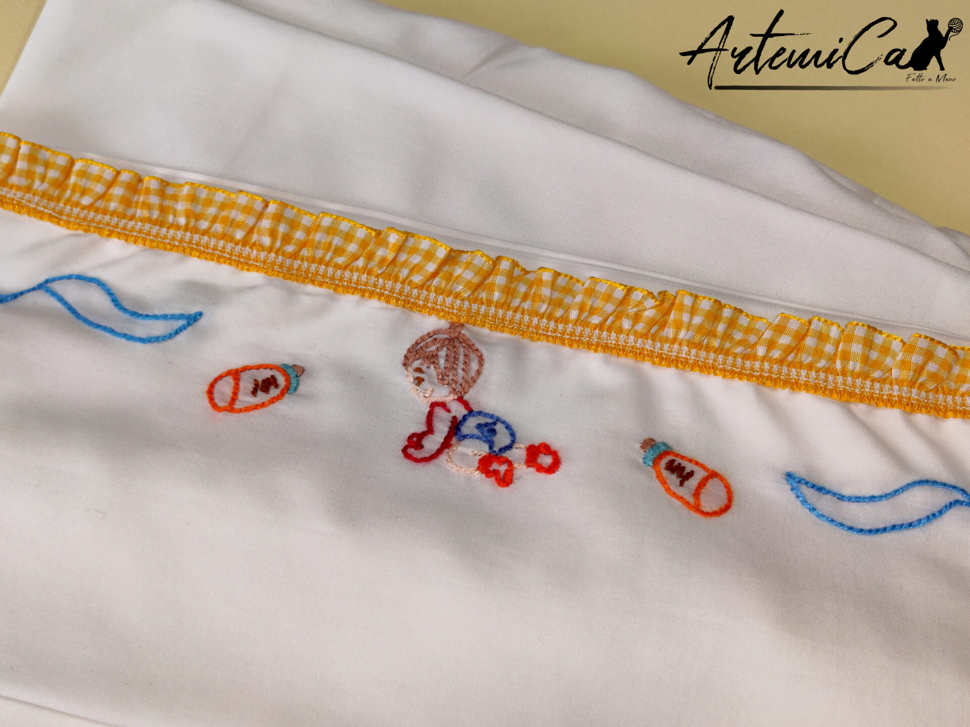 Immagina di avvolgere il tuo piccolo in un abbraccio di puro cotone, adornato con un tocco magico di ricamo fatto a mano! Il nostro Set Lenzuola รจ composto da tre pezzi unici: il sotto, il cuscino e il lenzuolo, insieme sono come una carezza di affetto, con dettagli che catturano l’attenzione. Il ricamo raffigura teneri bimbi che giocano e piccoli biberon, il tutto con colori vivaci e giocosi che sembrano saltare fuori dal lenzuolo.