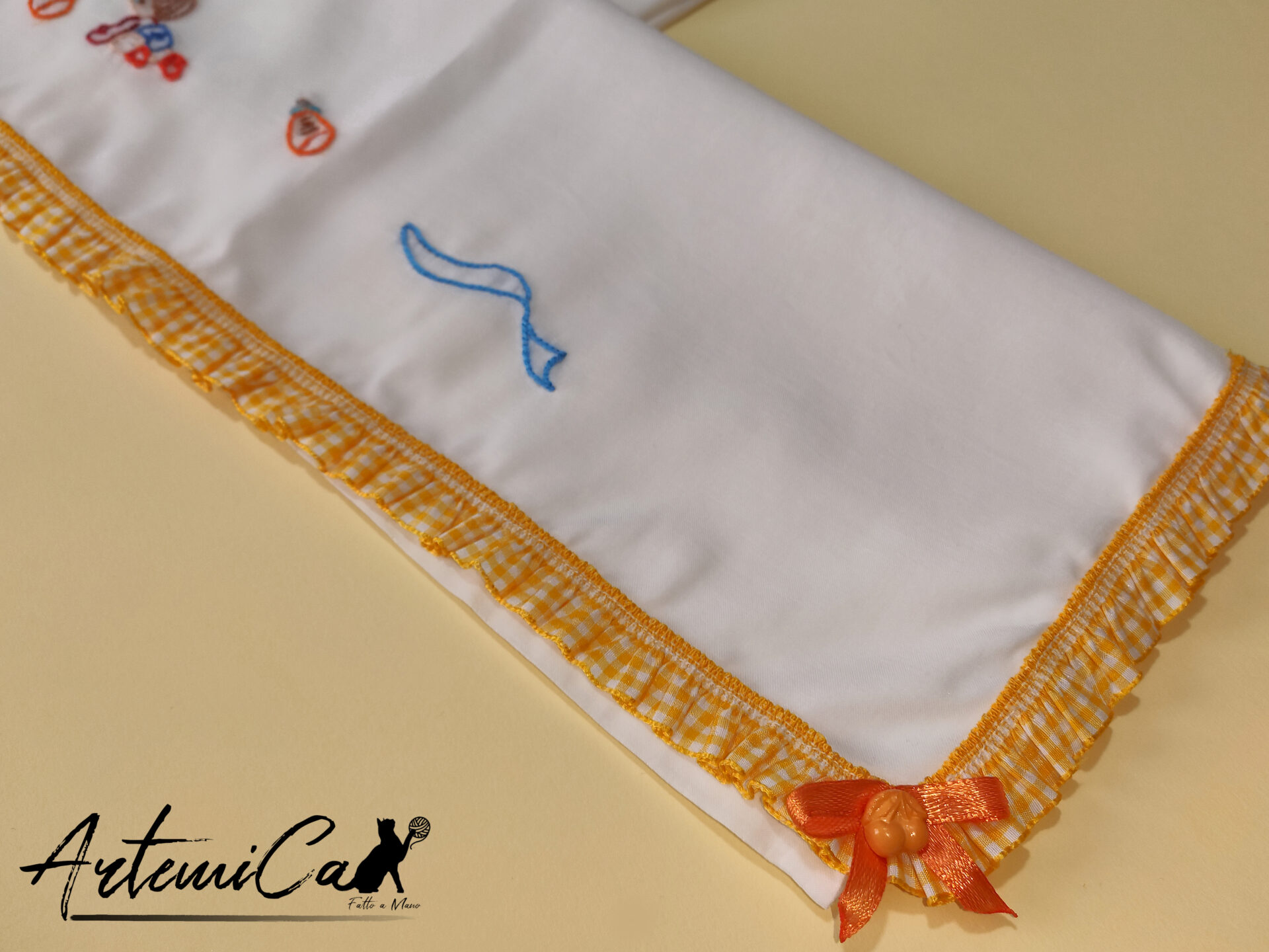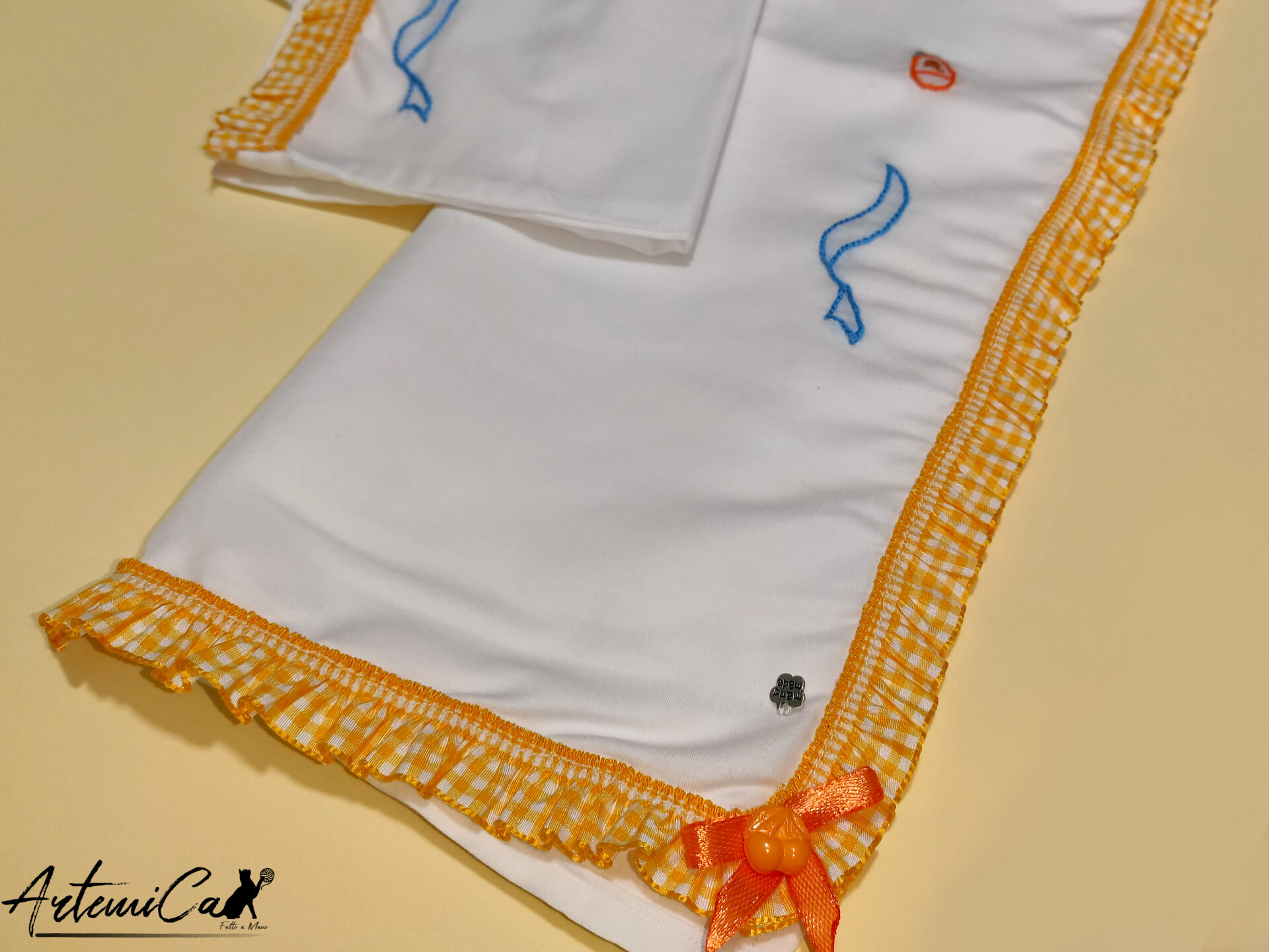 Ma non รจ tutto! Abbiamo arricchito il design con una passamaneria bordino volant arancione, che aggiunge un tocco di eleganza e allegria. Gli angoli del lenzuolo sono decorati con graziosi fiocchetti arancioni, regalando un ulteriore tocco di dolcezza al tuo piccolo mondo.