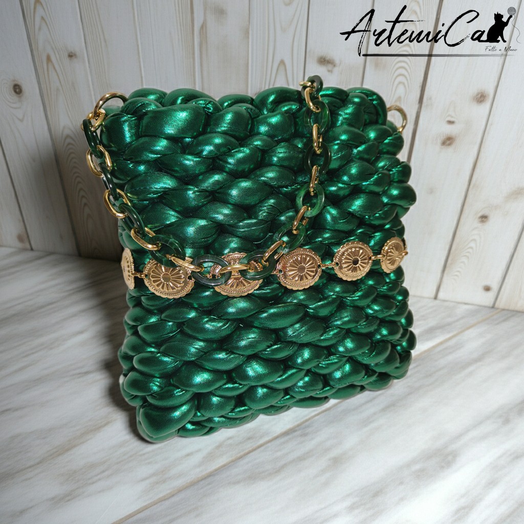 Realizzata con filato chunky effetto pelle, la borsa verde smeraldo artigianale Emerald Glow incarna il perfetto equilibrio tra morbidezza e struttura.