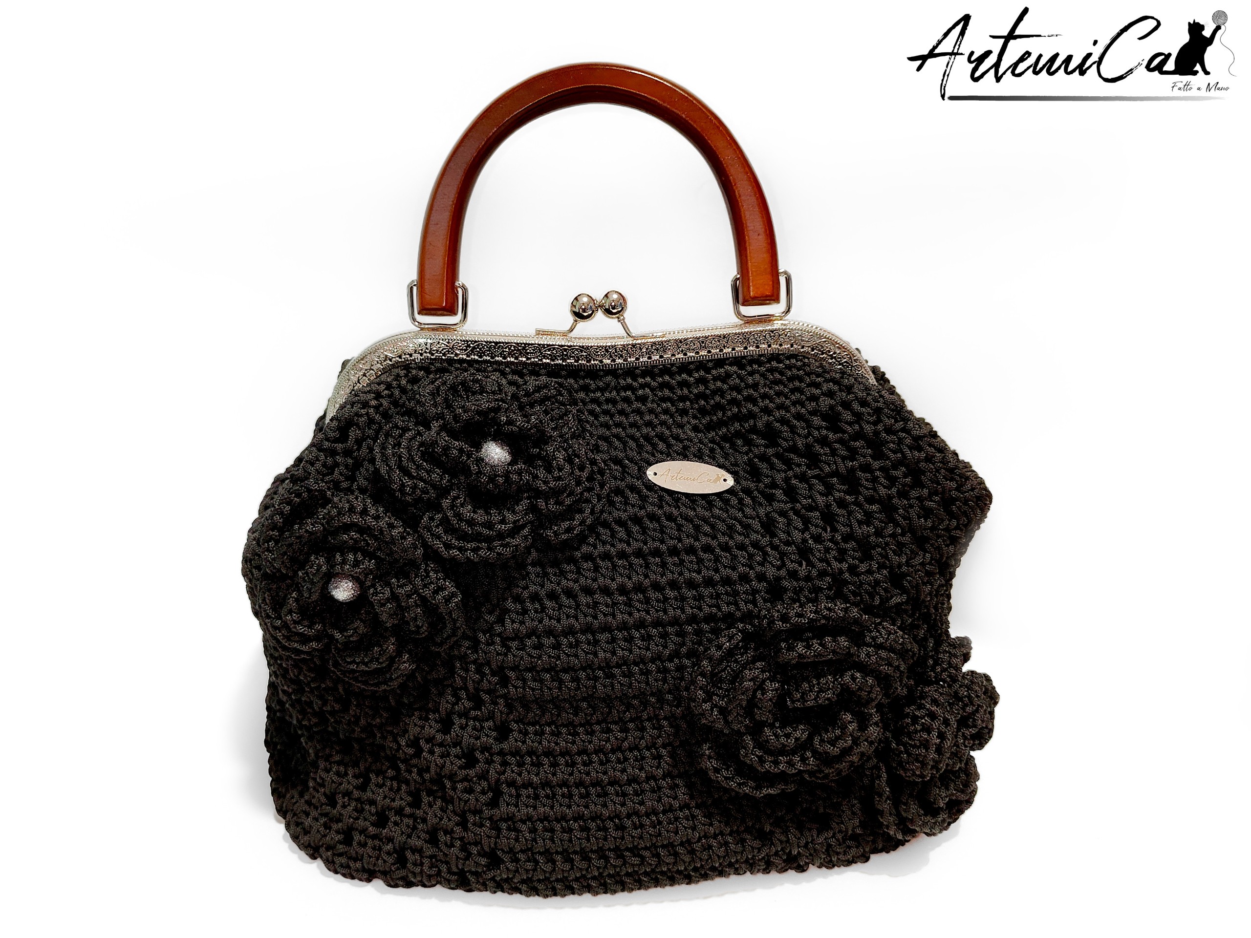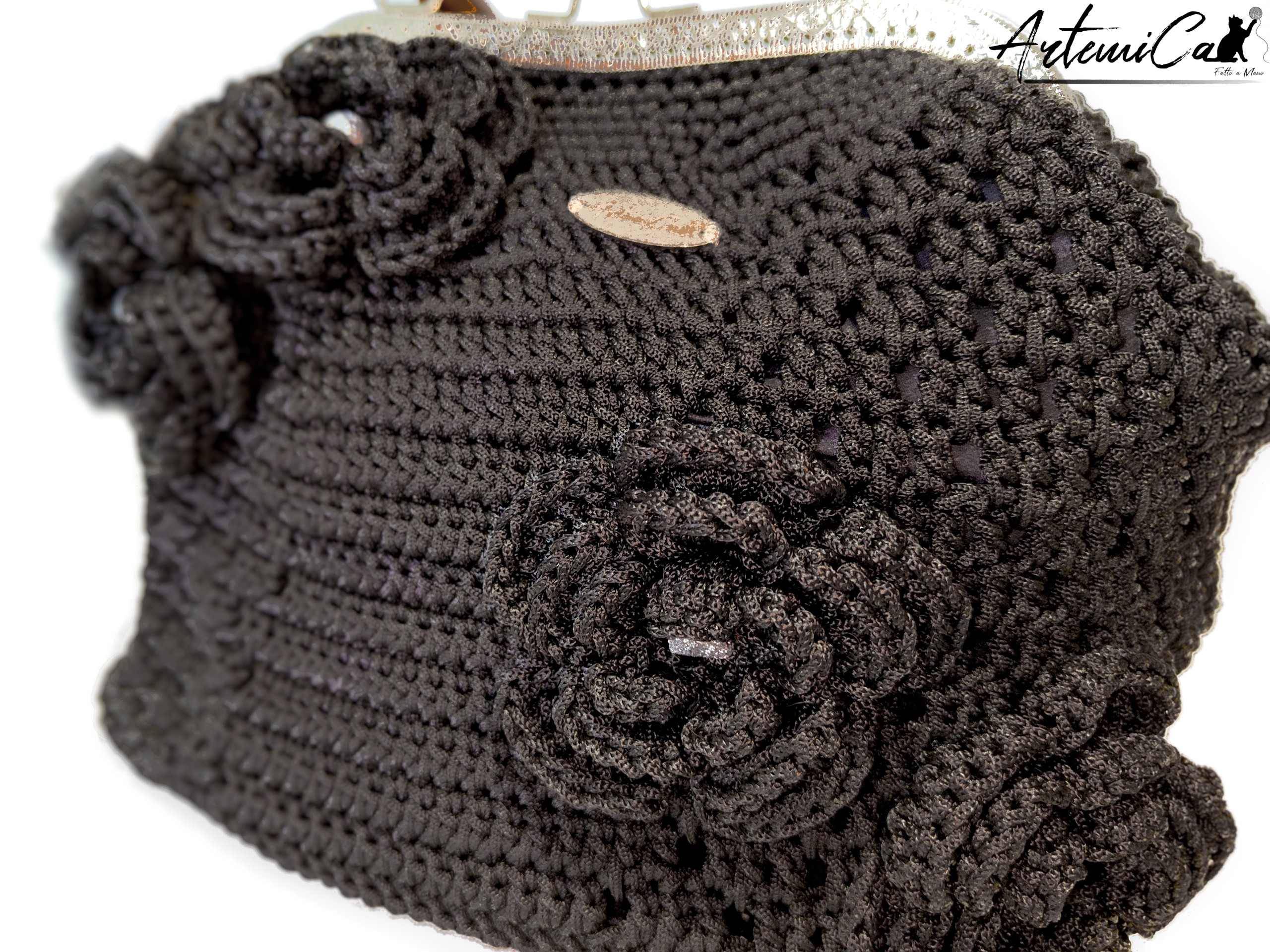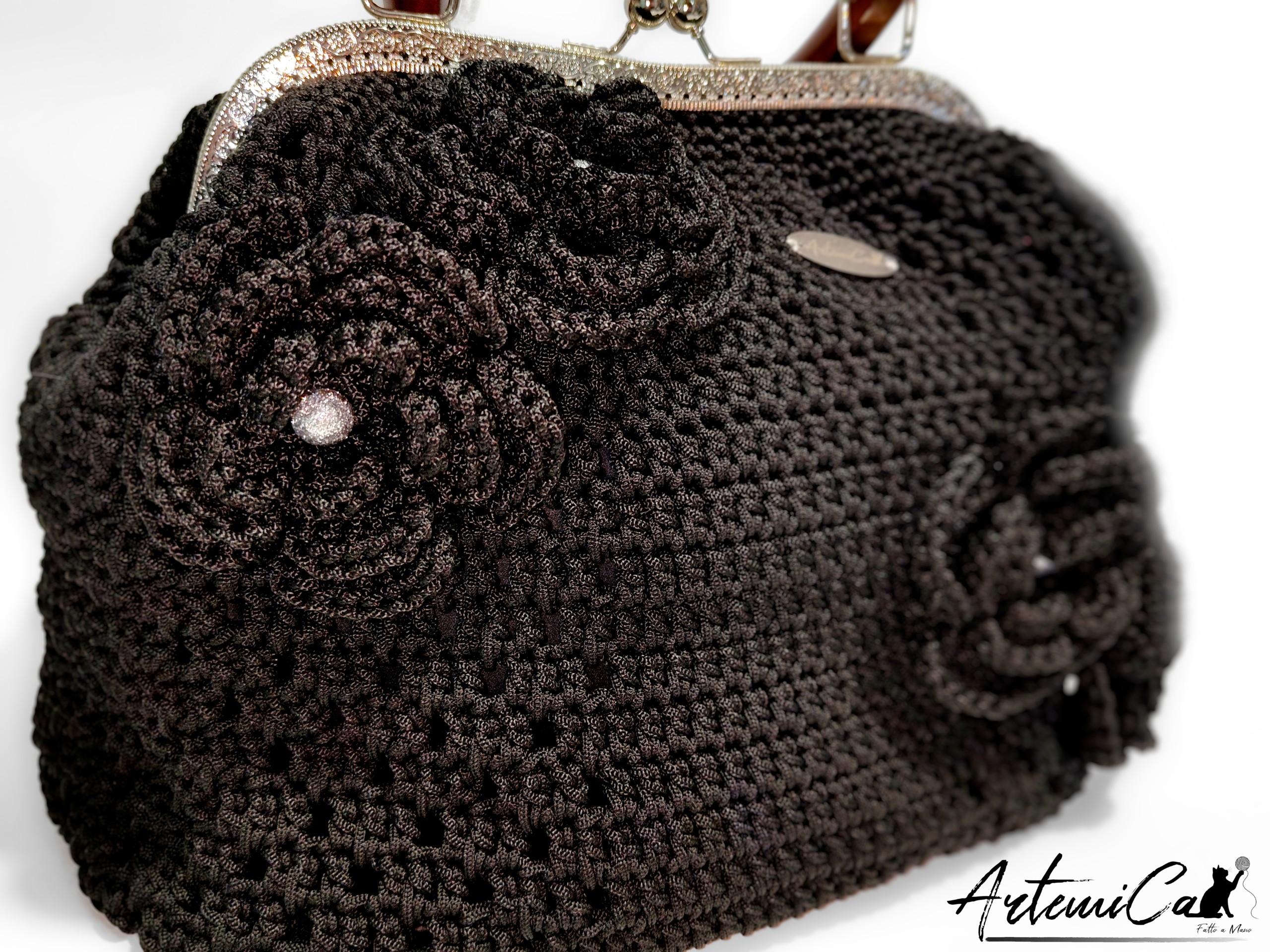Borsa Incanto Nero: Clic Clac Fatta a Mano all’Uncinetto in Cordino Nero con Fiori – Indossa l’Arte