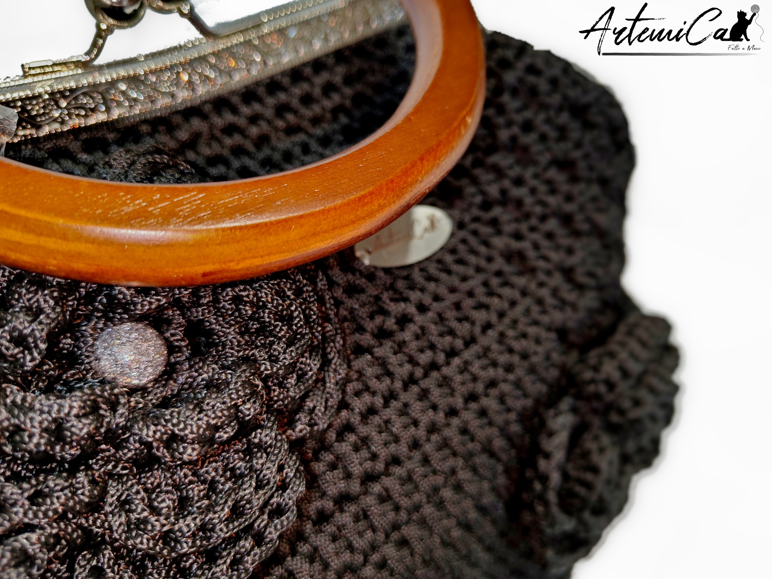 L’esperienza di questa borsa passa anche attraverso i sensi. Il nero profondo del cordino è la tela perfetta per far risaltare il bagliore dell’argento dei punti luce e il calore naturale del legno del manico. È un trio cromatico sofisticato e versatile, che parla di eleganza senza tempo. Toccando la superficie lavorata all’uncinetto senti la texture artigianale e la solidità del cordino; guardando i punti luce percepisci un tocco di brillantezza inattesa; tenendo il manico in legno avverti la levigatezza e il calore di un materiale naturale. È un’esperienza sensoriale completa che rende ogni volta che la indossi un piacere.