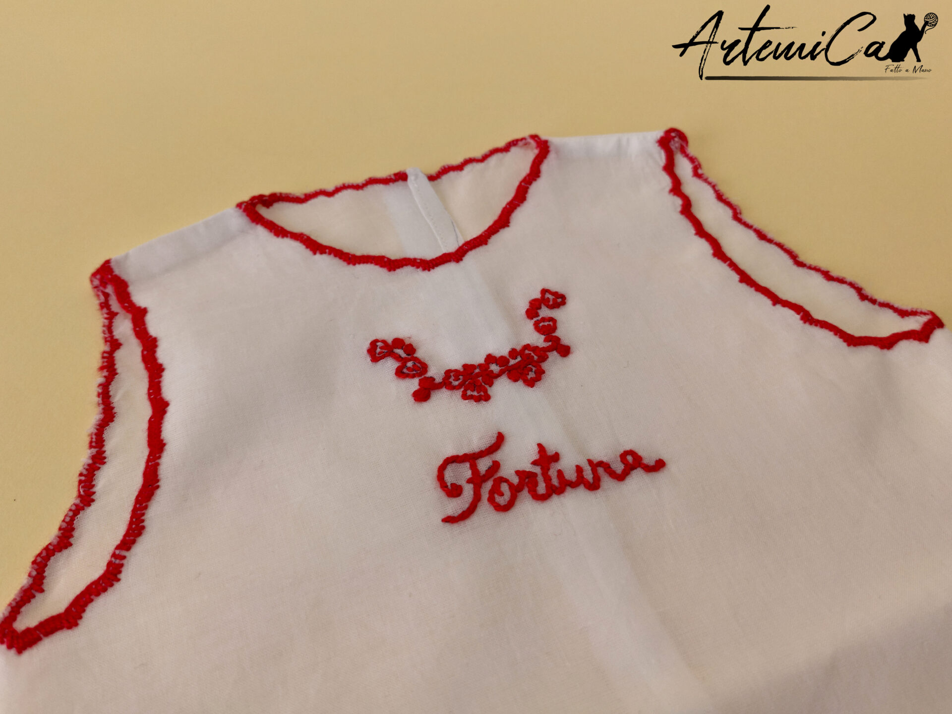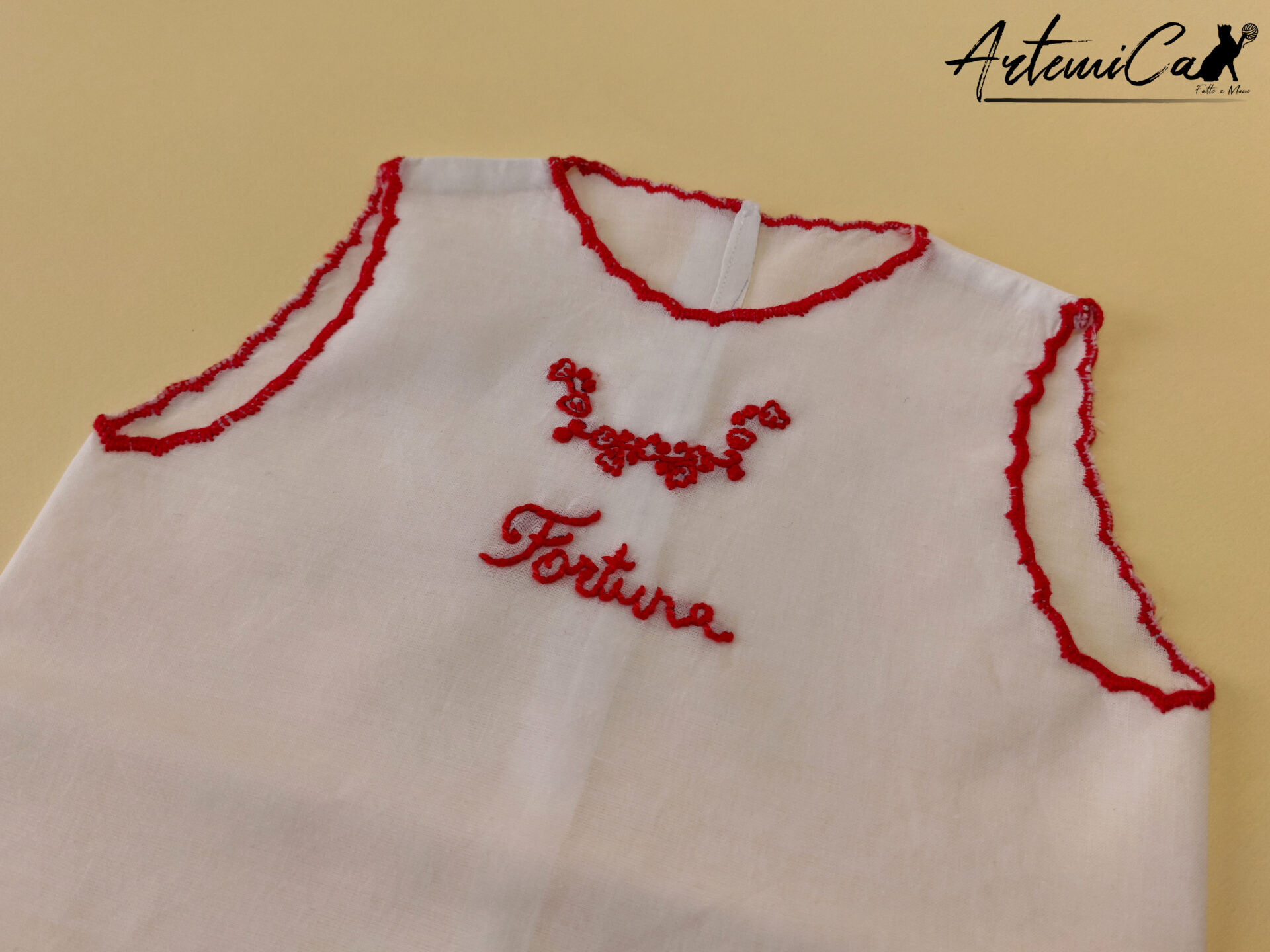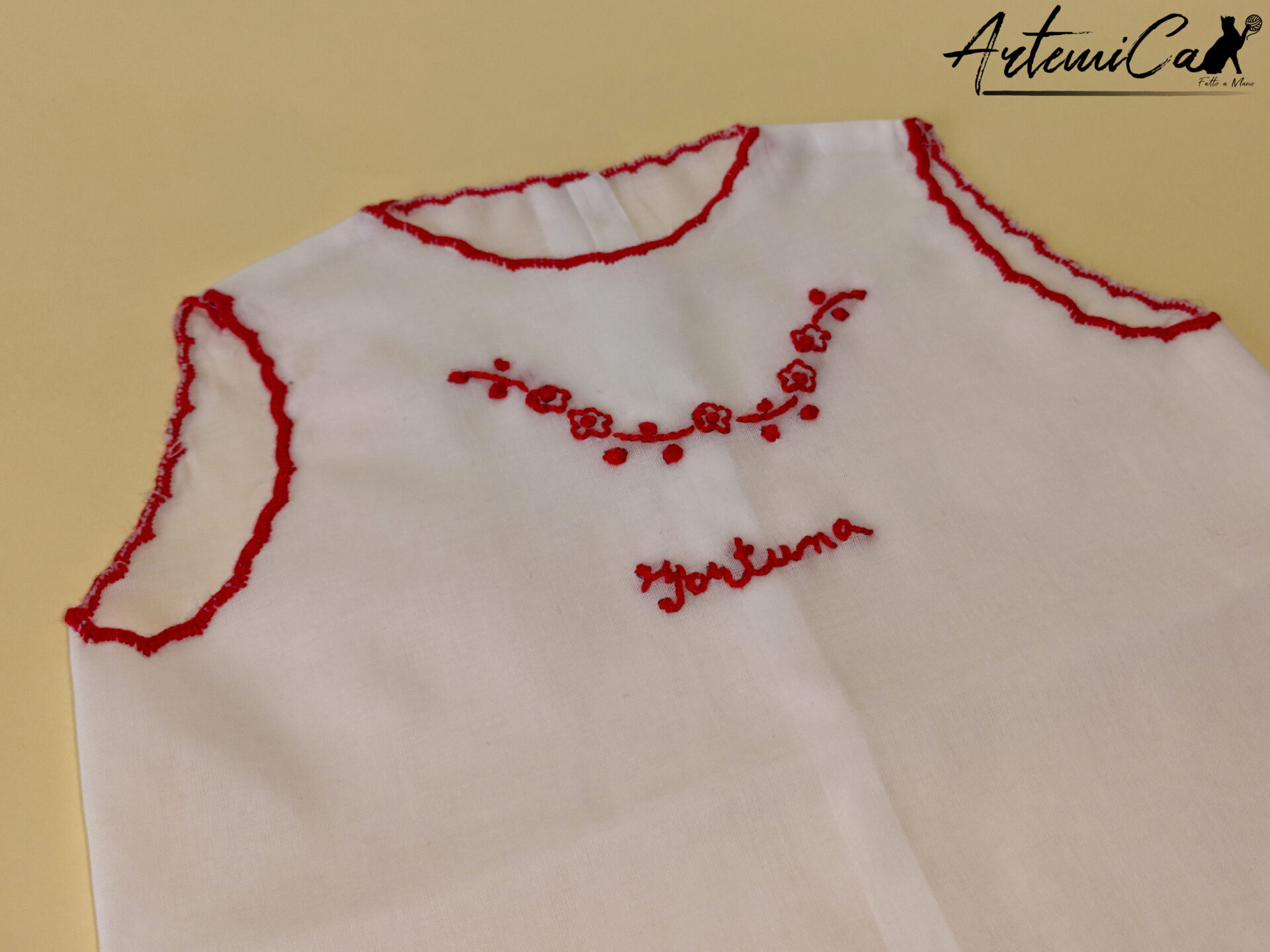 Ogni Camicina della Fortuna è un capolavoro fatto a mano, unico nel suo genere. Immagina la tenerezza della batista bianca che avvolge il tuo bimbo, arricchita dai ricami a mano rossi che trasmettono amore e calore. La parola “fortuna”, tradizionalmente intessuta, è più di un augurio; è un abbraccio di buon auspicio per la vita del tuo piccolo.