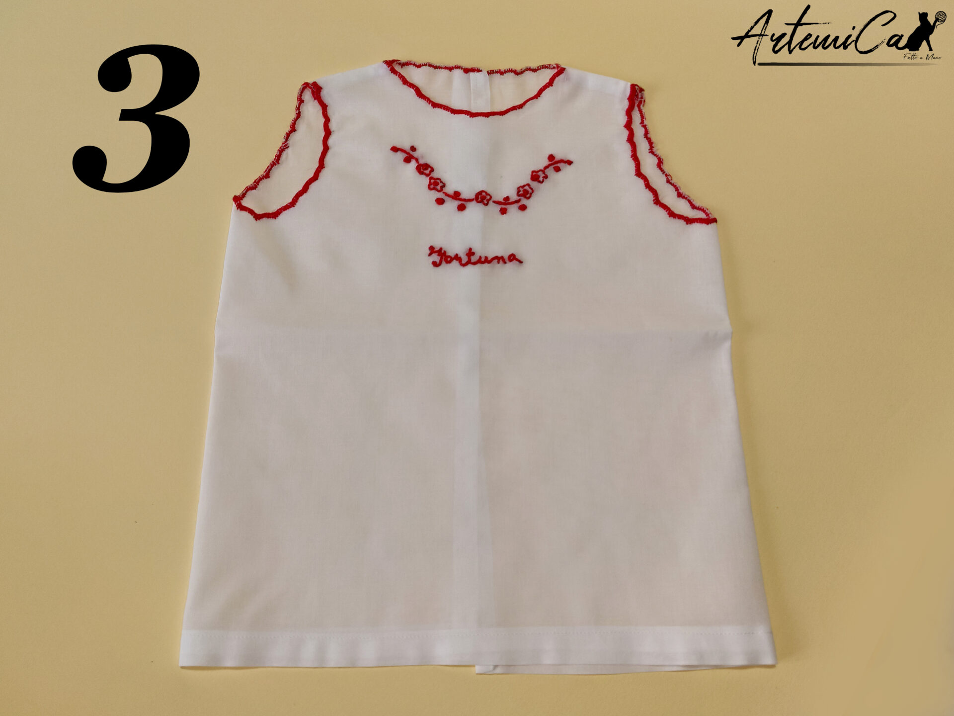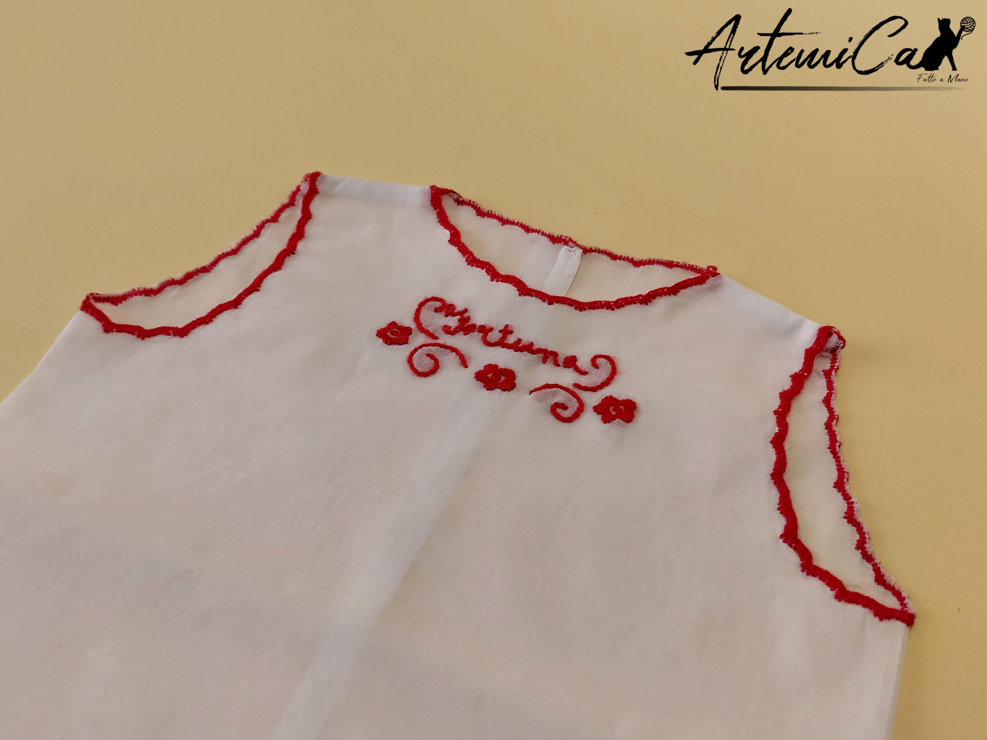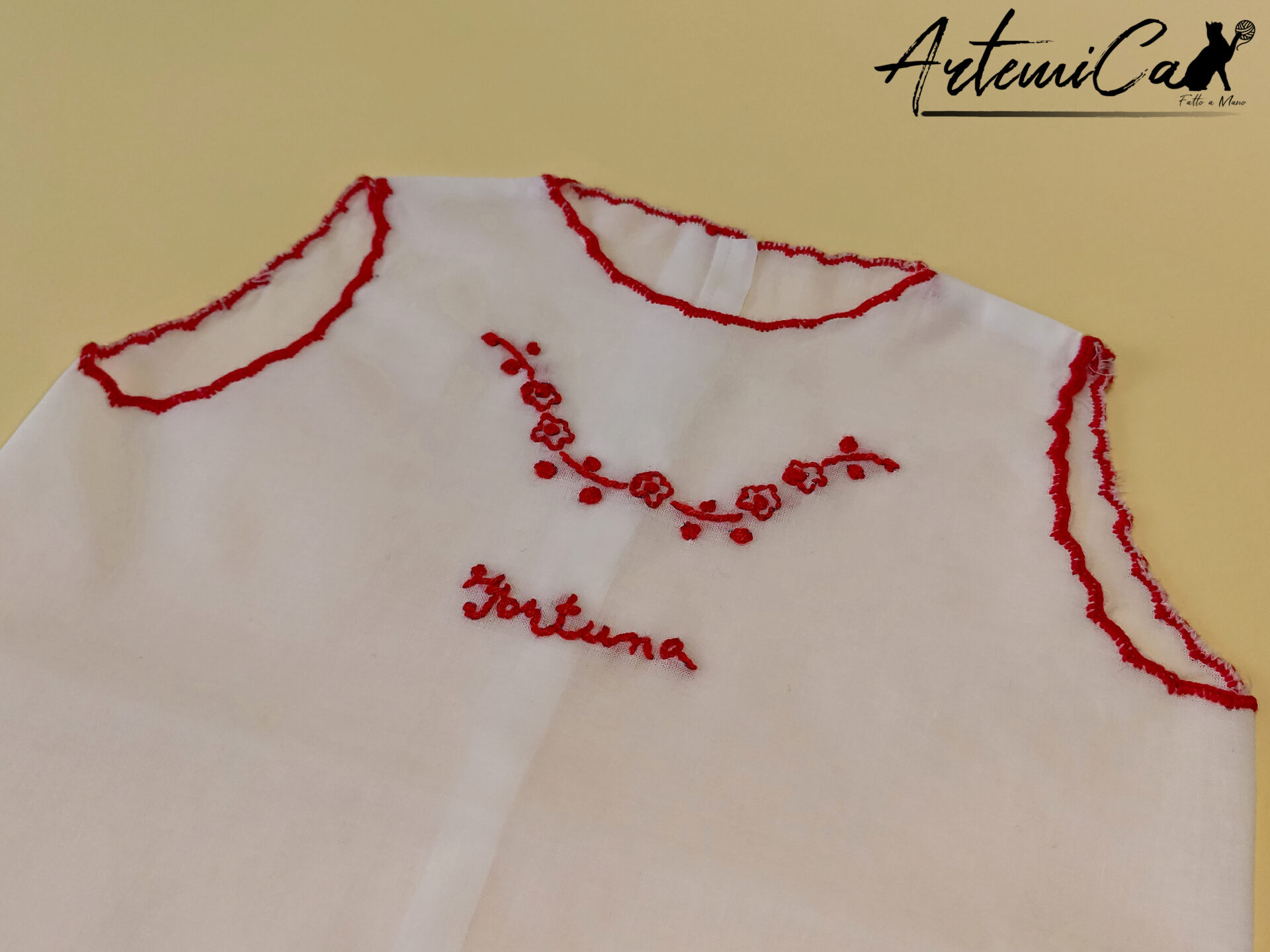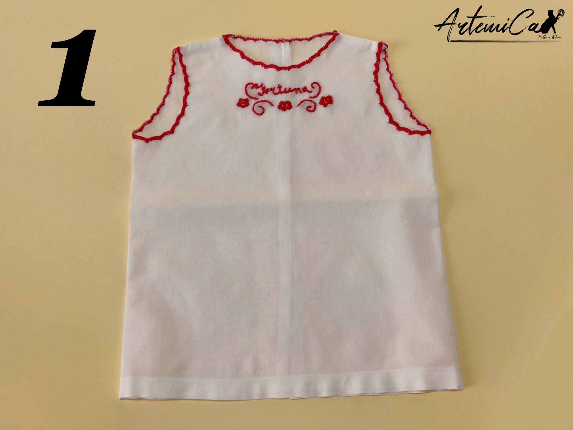 Ogni Camicina della Fortuna è un capolavoro fatto a mano, unico nel suo genere. Immagina la tenerezza della batista bianca che avvolge il tuo bimbo, arricchita dai ricami a mano rossi che trasmettono amore e calore. La parola “fortuna”, tradizionalmente intessuta, è più di un augurio; è un abbraccio di buon auspicio per la vita del tuo piccolo.