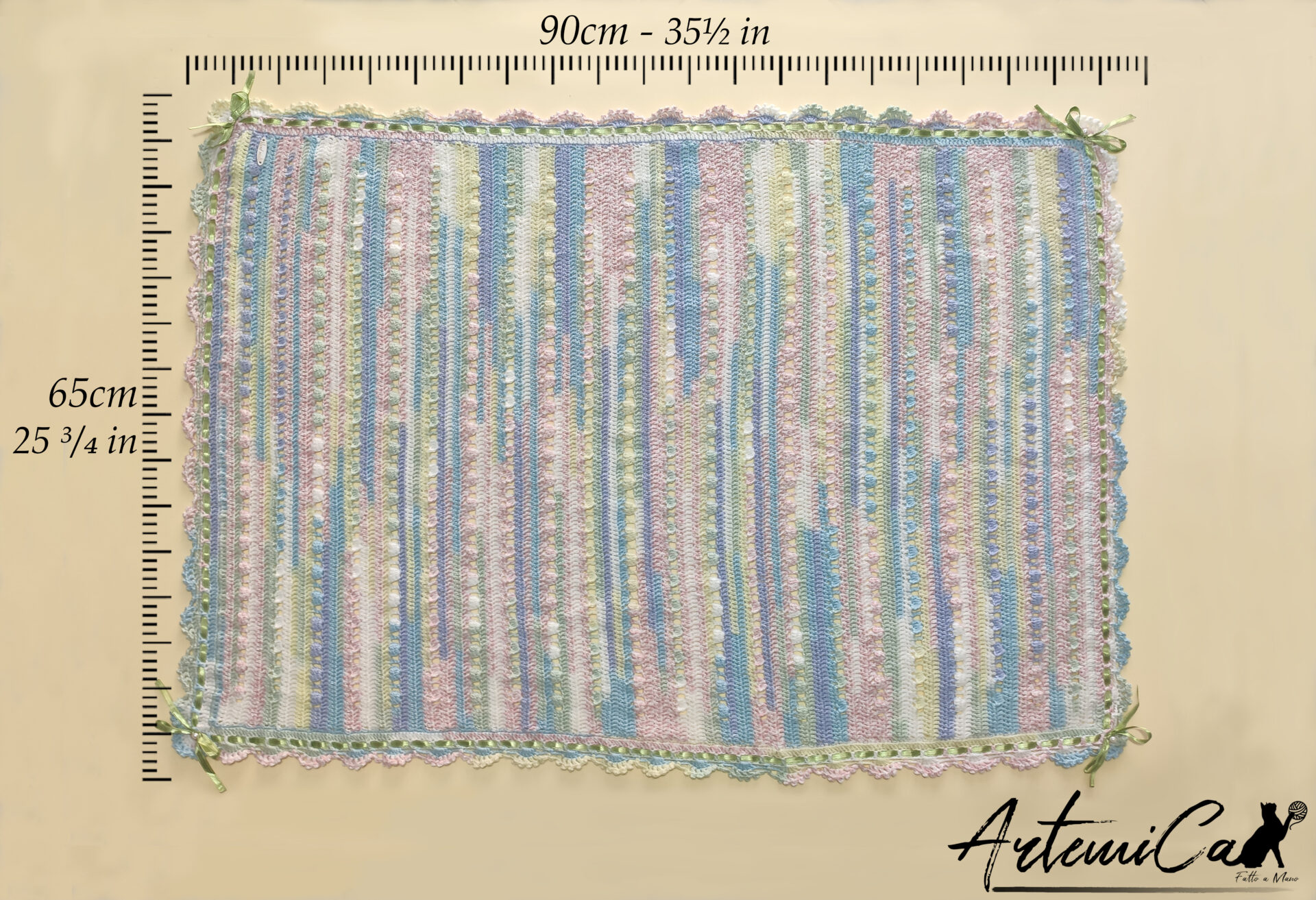 Ogni punto è stato lavorato con cura, creando un tessuto morbido e avvolgente, ideale per la pelle delicata del tuo piccolo. Questo non è solo un oggetto, ma una coccola, un compagno di giochi e un portatore di dolci sogni. Che si tratti di un pomeriggio al parco o di una nanna tranquilla, questa copertina renderà ogni momento speciale.