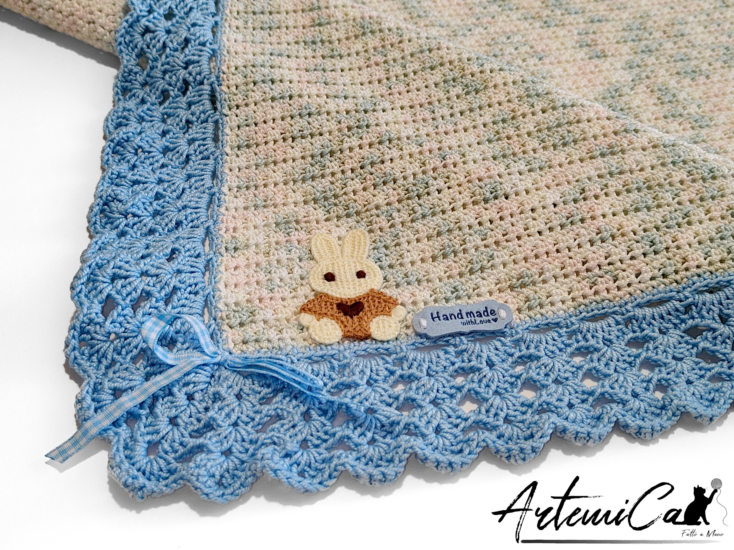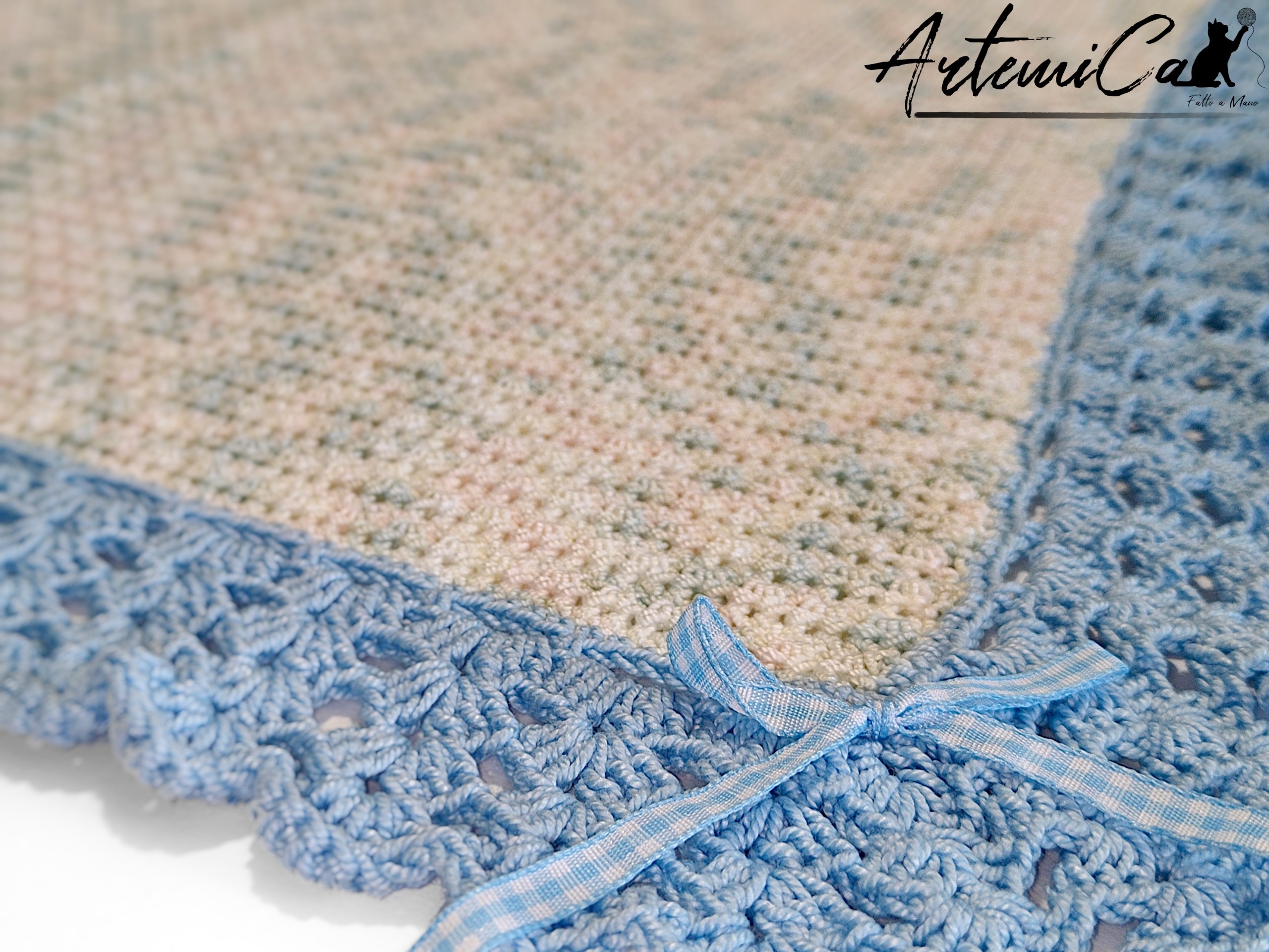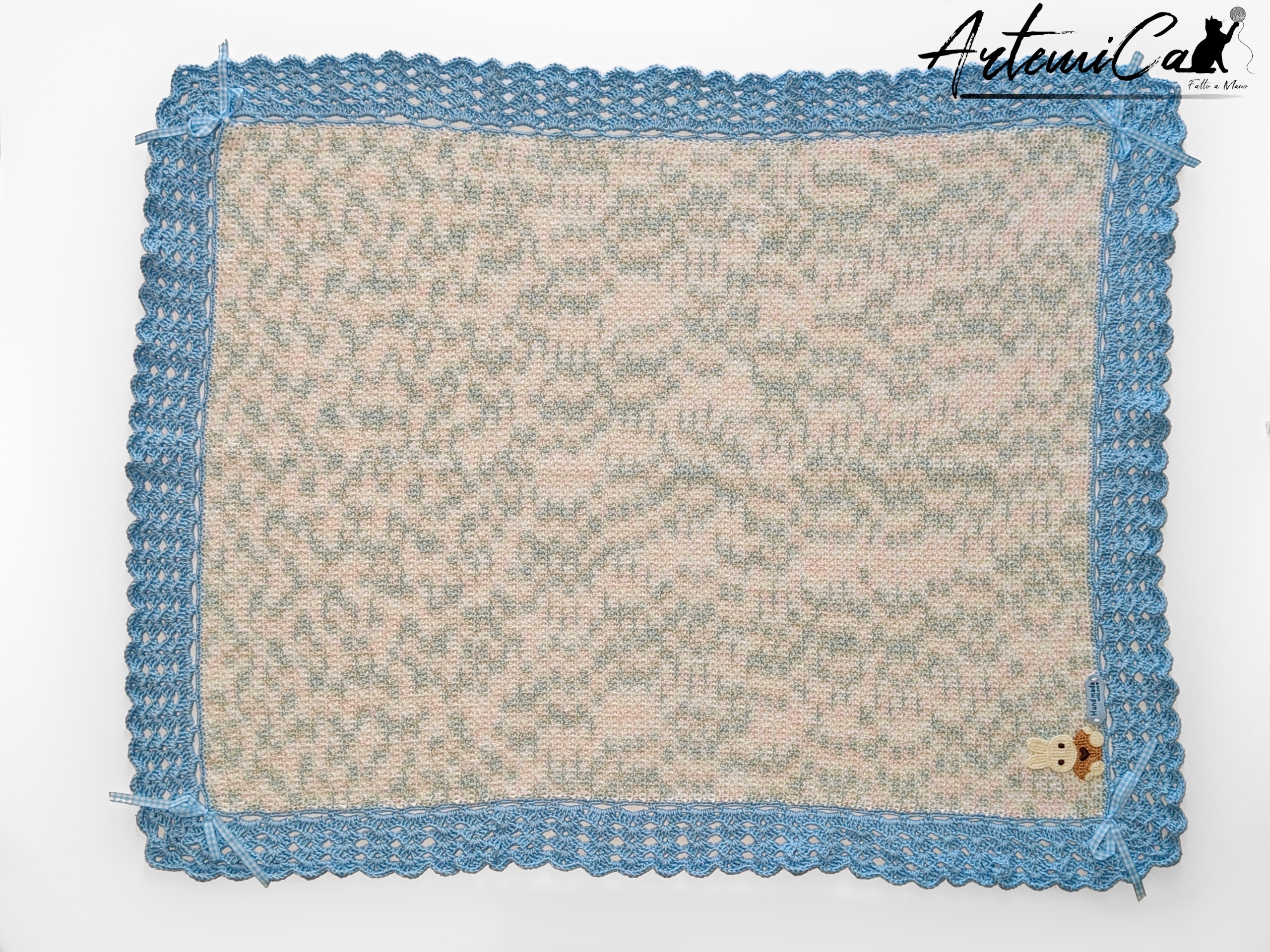Immagina la copertina stesa sul lettino: il centro a fantasia, punteggiato di tenui tonalitĆ pastello, crea un piccolo paesaggio soffice su cui spicca il bordo azzurro lavorato allāuncinetto. Ogni dettaglio ĆØ fatto a mano, dalla bordatura al fiocchetto in cotone che aggiunge un tocco giocoso e raffinato.