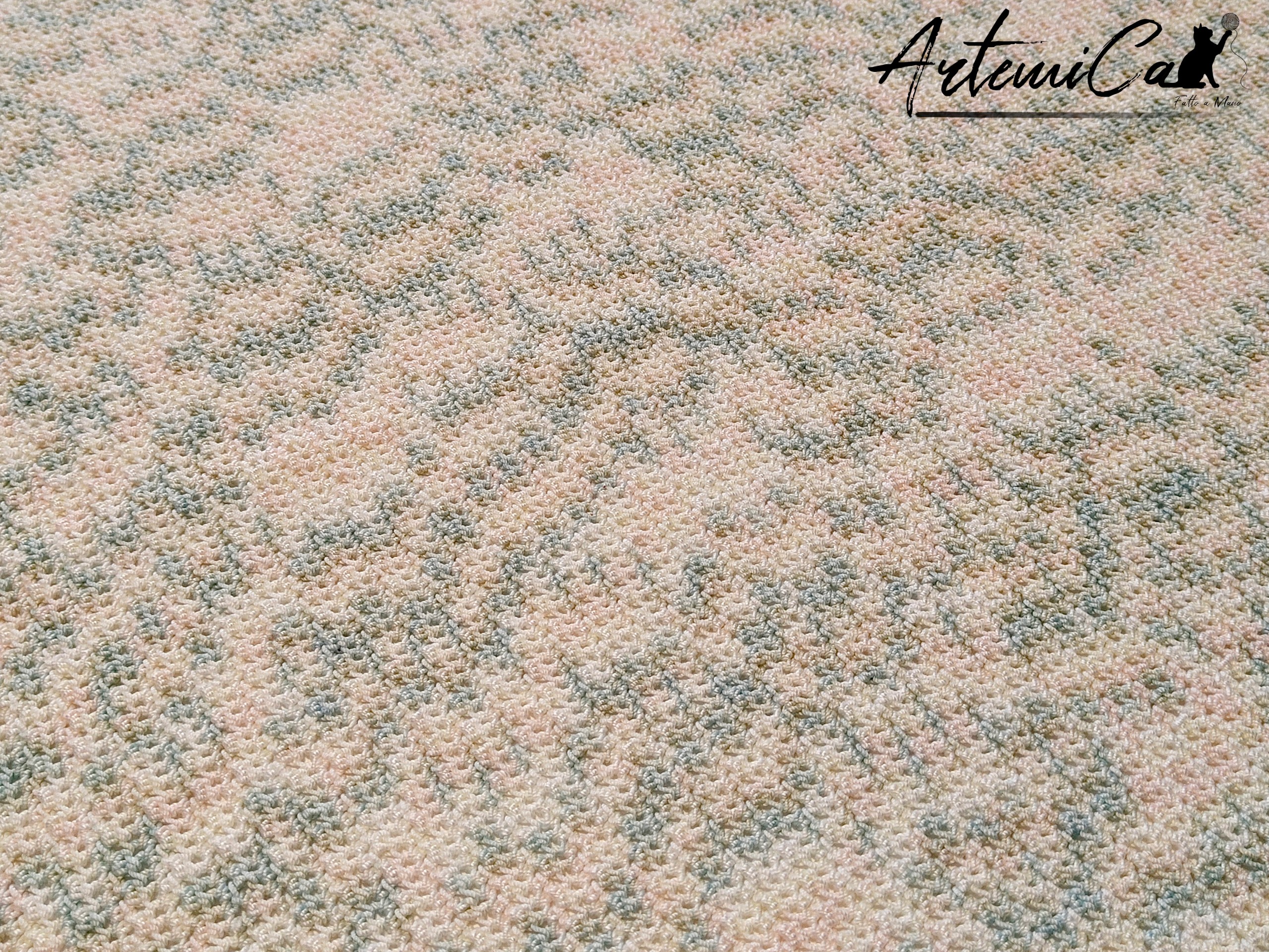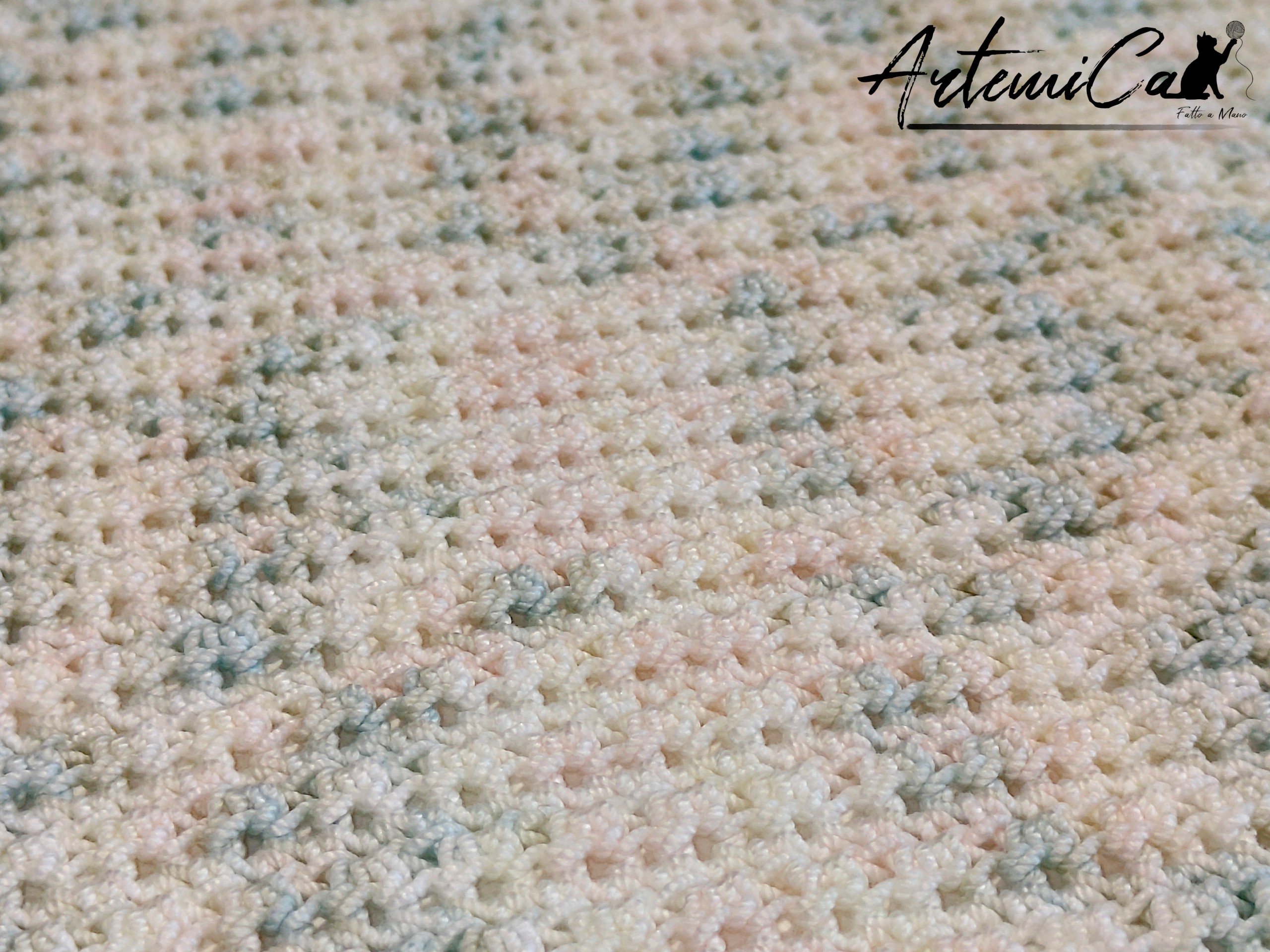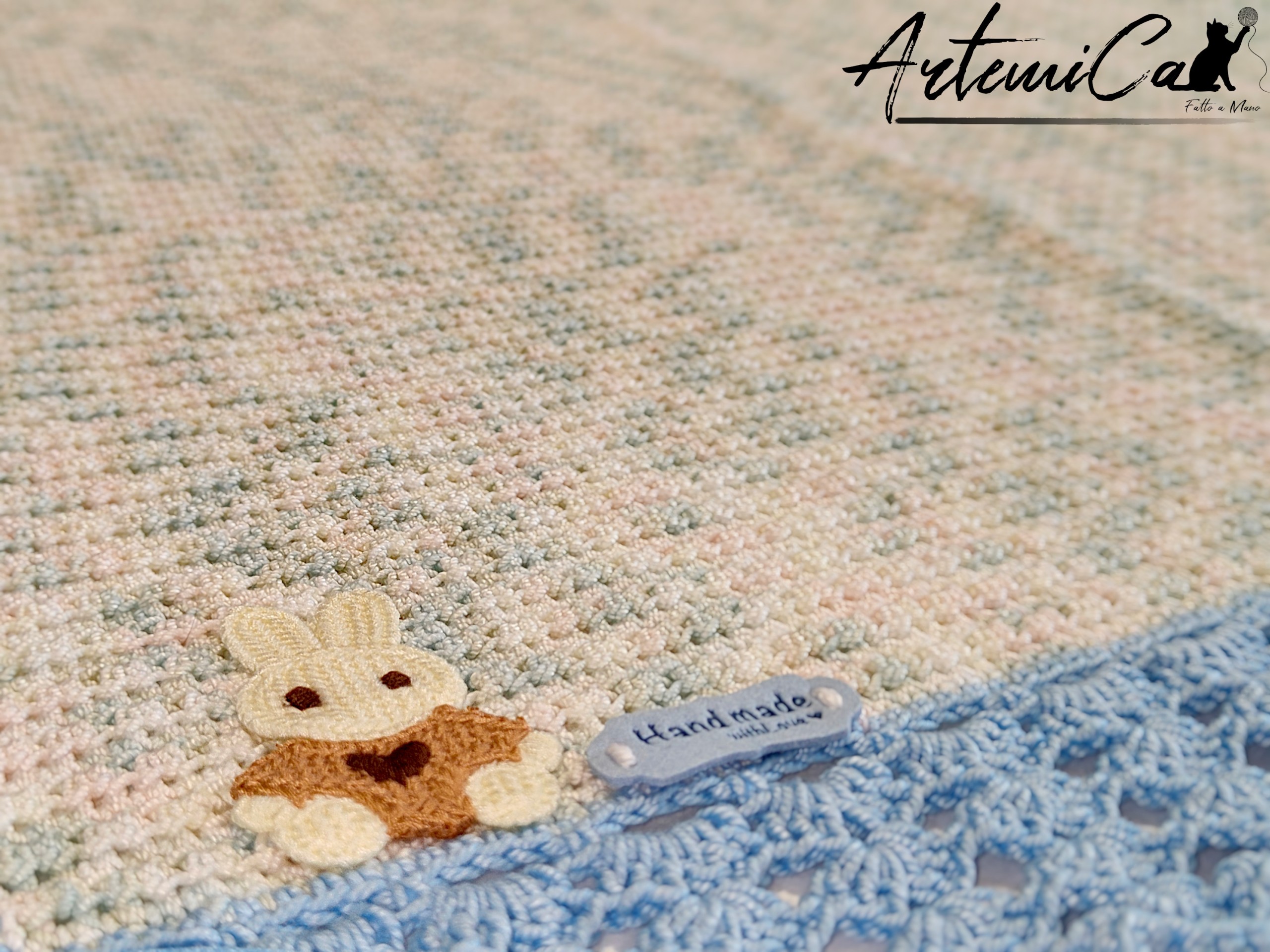 Immagina la copertina stesa sul lettino: il centro a fantasia, punteggiato di tenui tonalitĆ pastello, crea un piccolo paesaggio soffice su cui spicca il bordo azzurro lavorato allāuncinetto. Ogni dettaglio ĆØ fatto a mano, dalla bordatura al fiocchetto in cotone che aggiunge un tocco giocoso e raffinato.