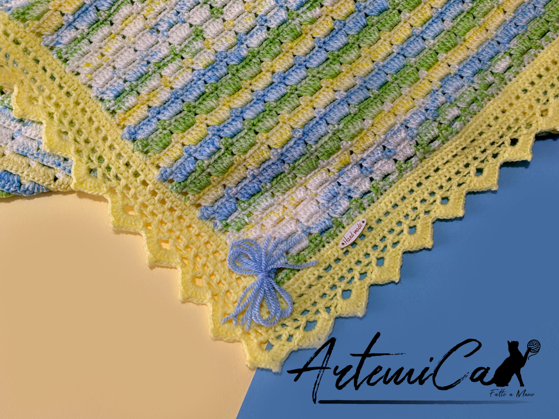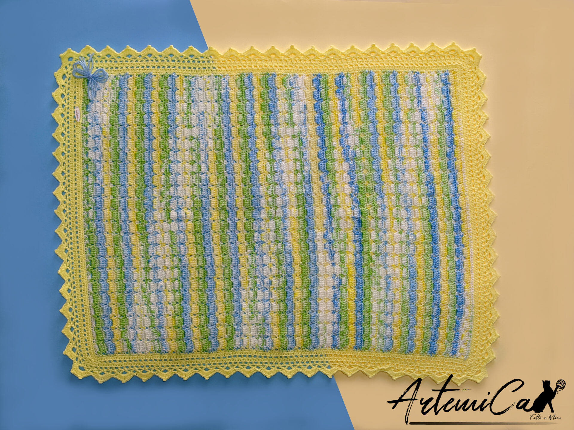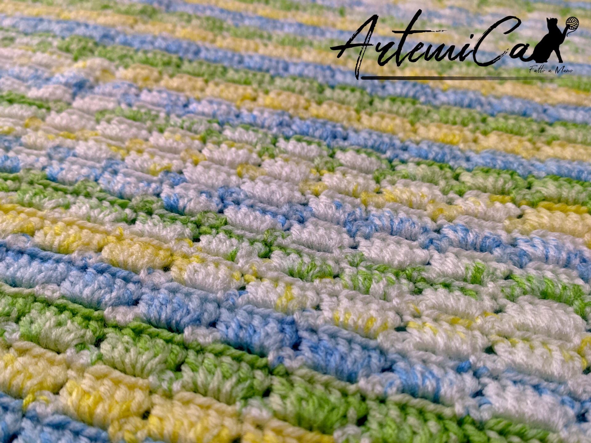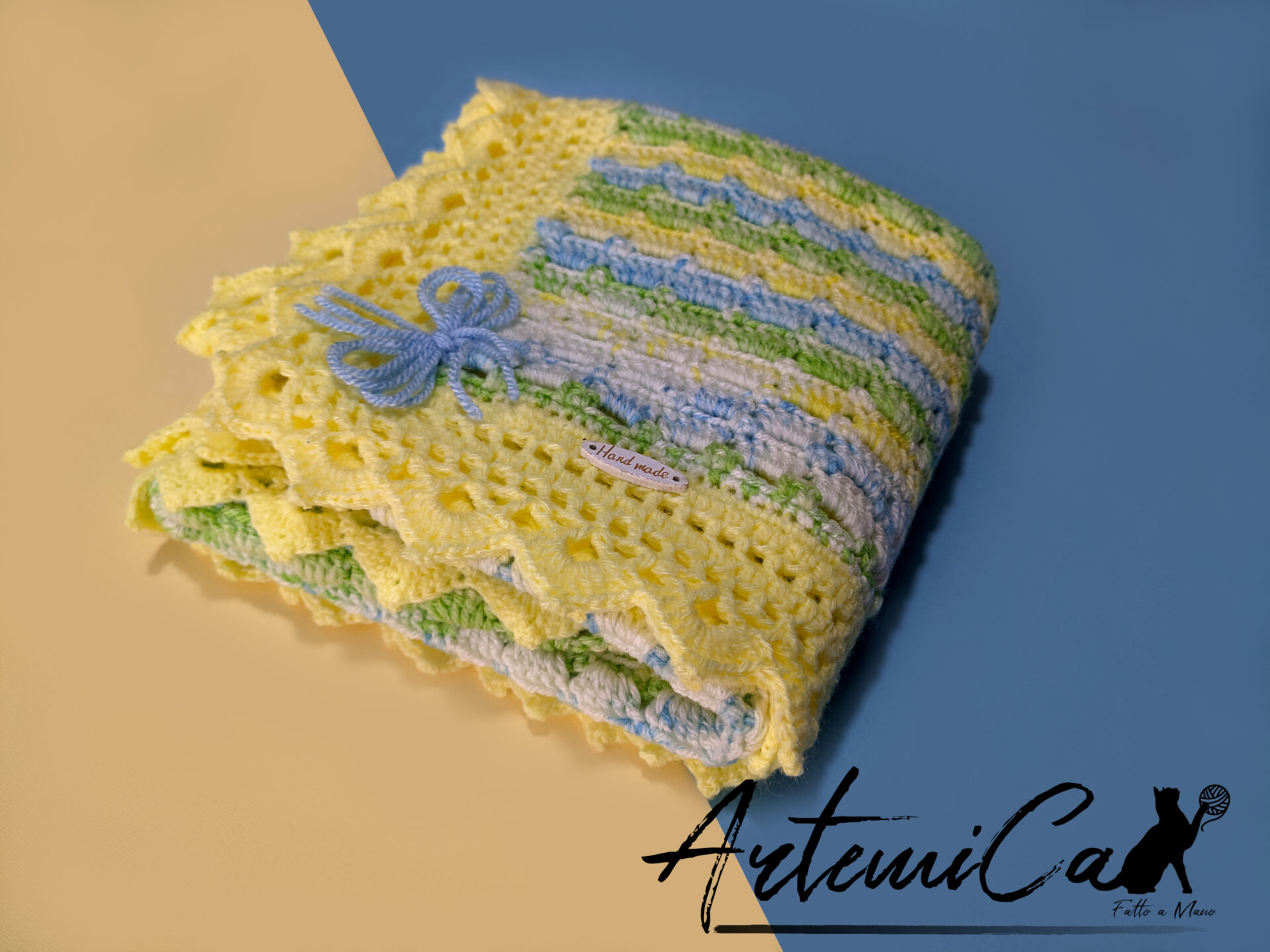 Regala al tuo bambino il calore e il colore di questa copertina per carrozzina in lana arcobaleno, fatta a mano con amore.