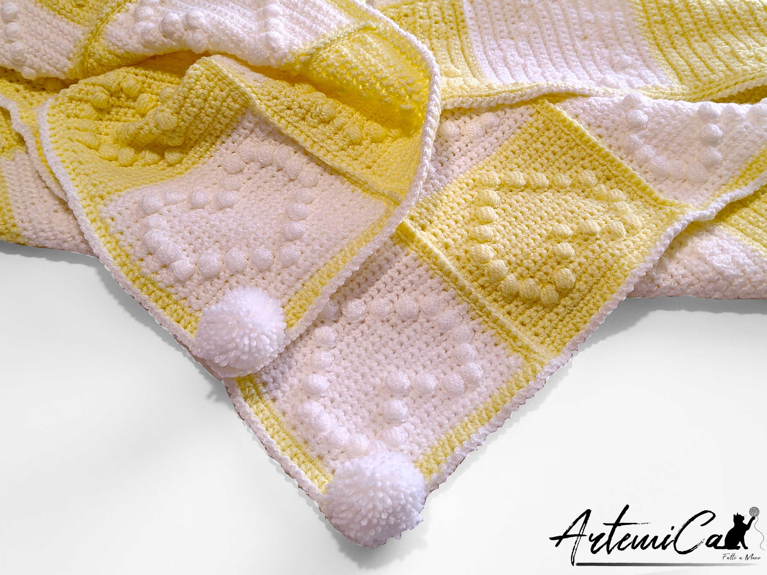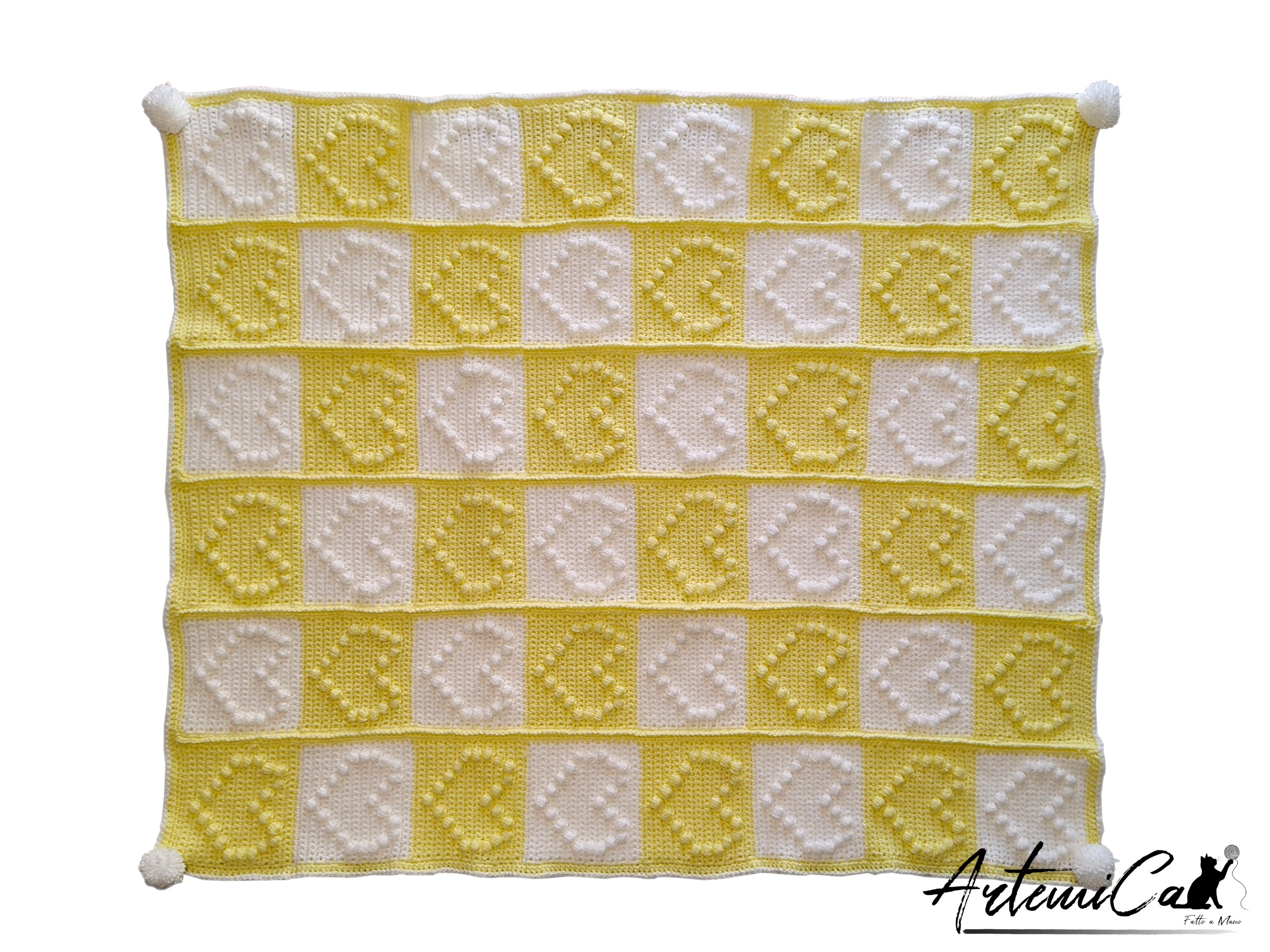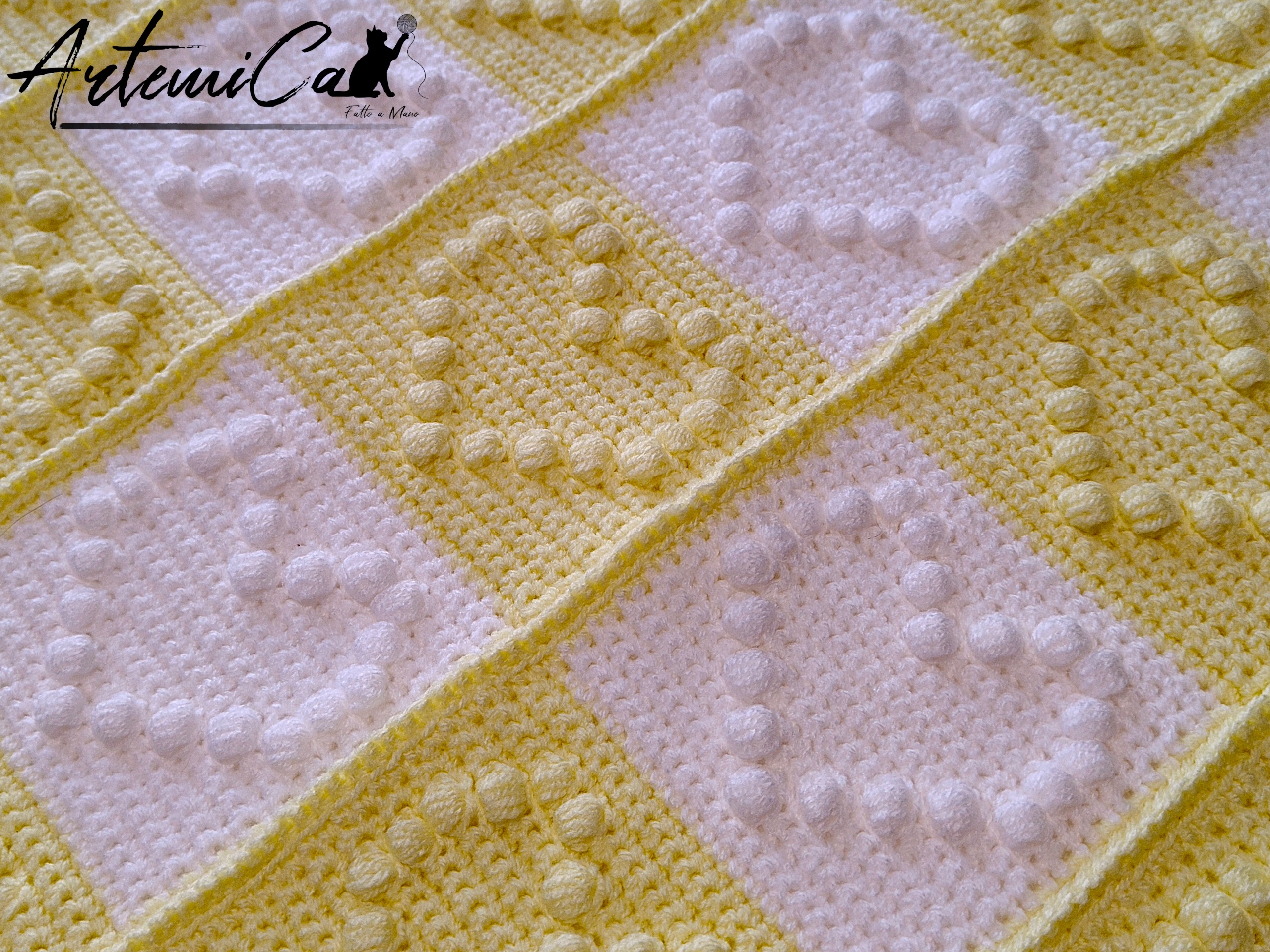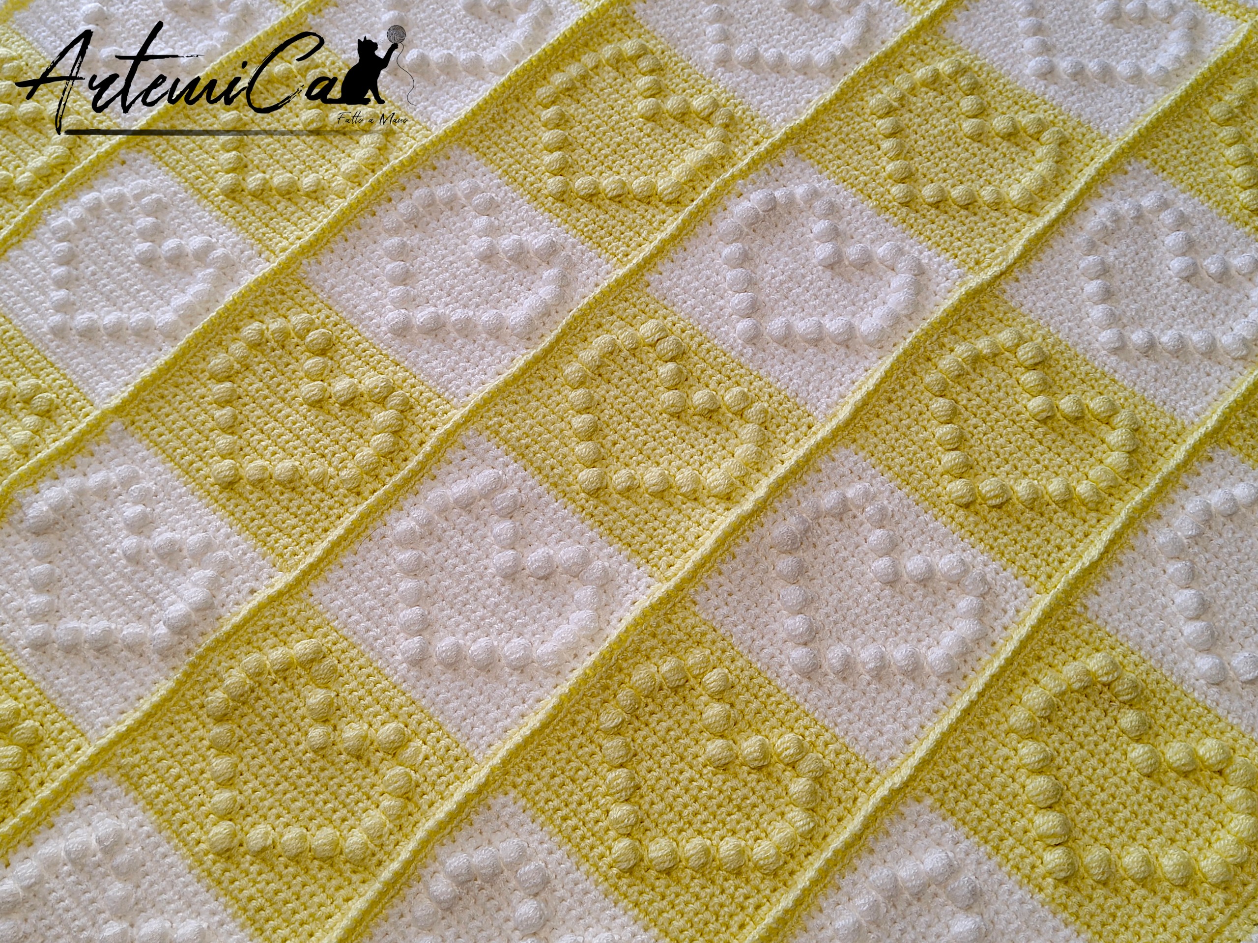 Lasciati trasportare dalla texture: ogni quadrato è il risultato di una lavorazione interamente all’uncinetto, unito a un delicato effetto patchwork creato con la tecnica granny. Dimensioni: circa 92 cm × 80 cm. Materiale: filato acrilico, scelto per la sua morbidezza, calore e facilità di manutenzione. Il motivo a scacchiera alterna bianco e giallo pastello, e su ogni quadrato i punti puf disegnano in rilievo un cuore morbido e tridimensionale: non è solo un disegno, è un invito a sfiorare con le dita quelle “bobbles” che giocano con la luce.