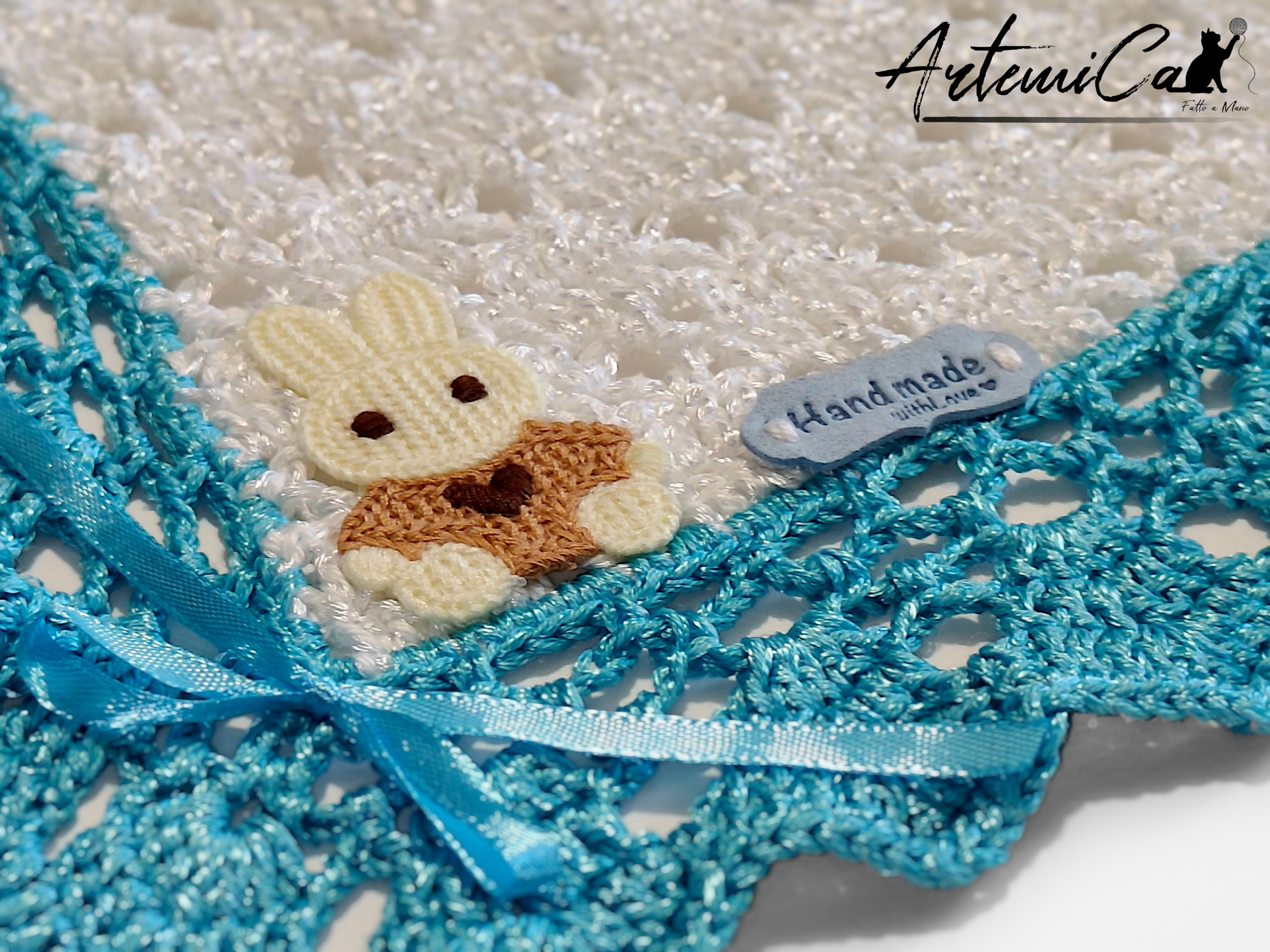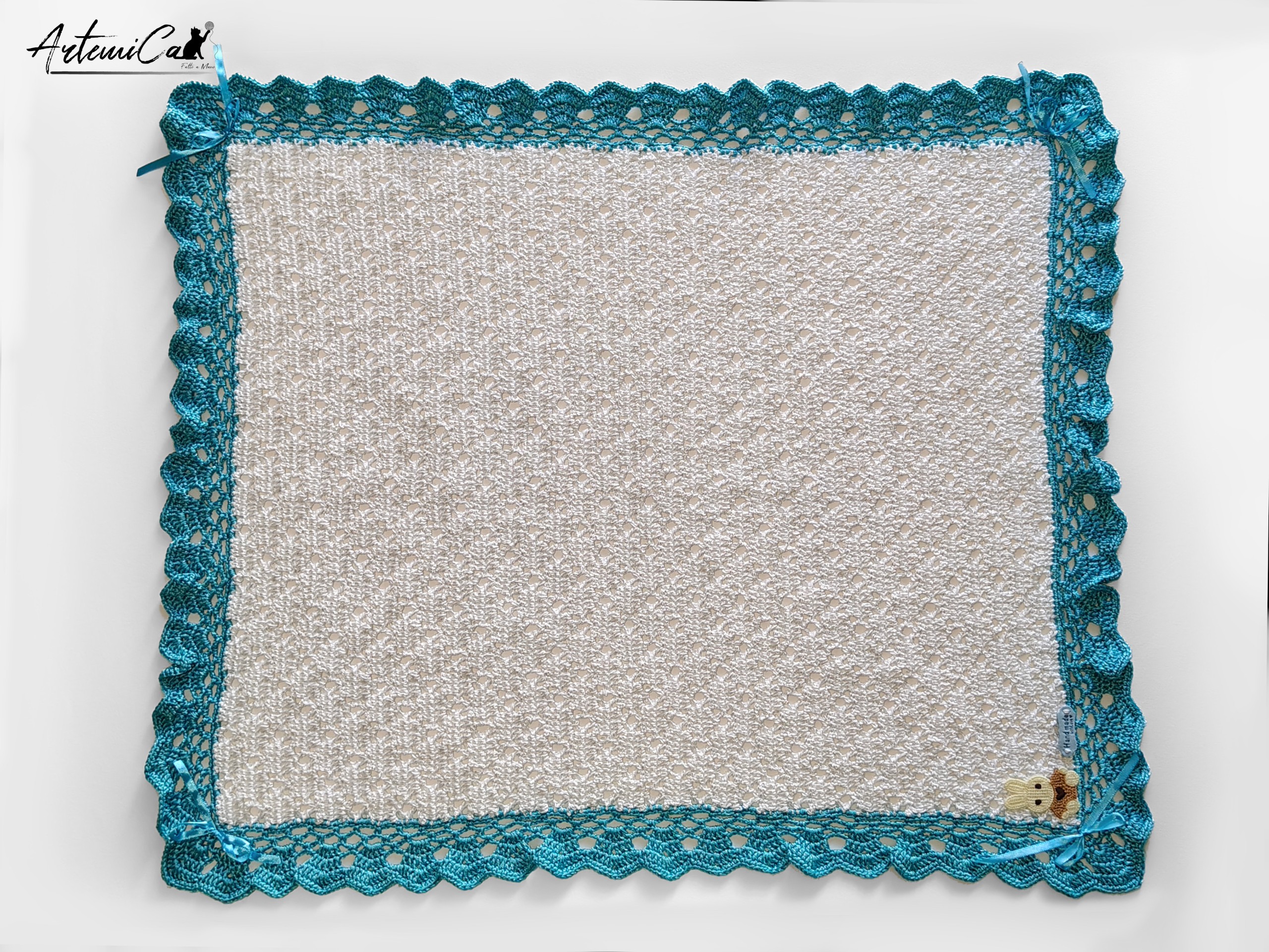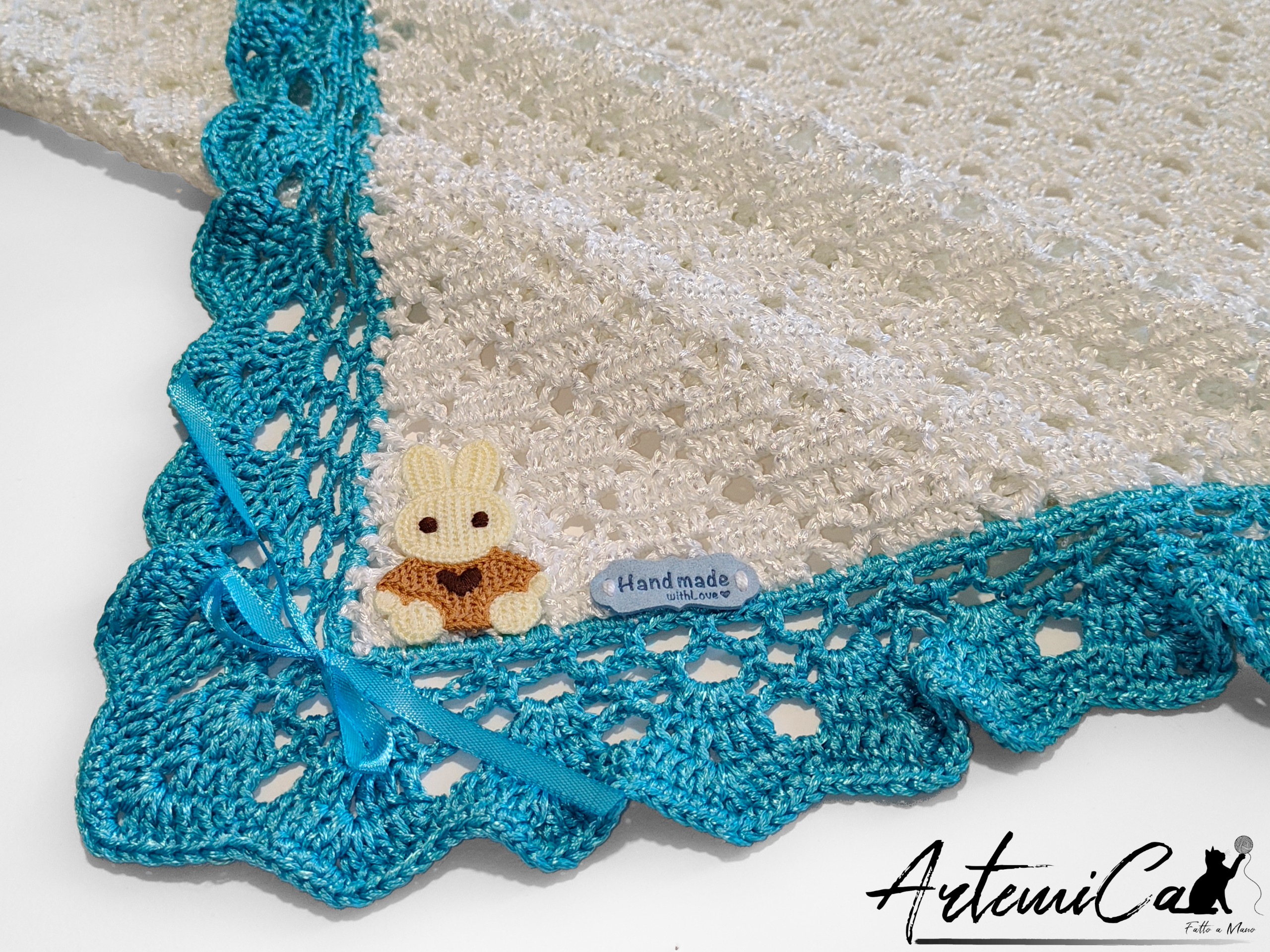 Entra nel dettaglio: dimensioni 80Ć65 cm, perfetta per la carrozzina o per le prime nanna; materiale centrale in viscosa che dona una lieve lucentezza e una caduta morbida al tatto; lavorazione all’uncinetto con un punto traforato e arioso che regala una sensazione di leggerezza e freschezza sulla pelle. Il bordo perimetrale turchese brillante ĆØ lavorato a ventaglio creando archetti raffinati che incorniciano il centro bianco con un contrasto elegante e vivace. Ai quattro angoli, fiocchetti di raso turchese aggiungono un tocco di lucentezza e movimento, mentre l’angolo inferiore ĆØ arricchito da un piccolo coniglietto applicato e dallāetichetta āHand made with loveā che certifica lāanima artigianale del pezzo.
