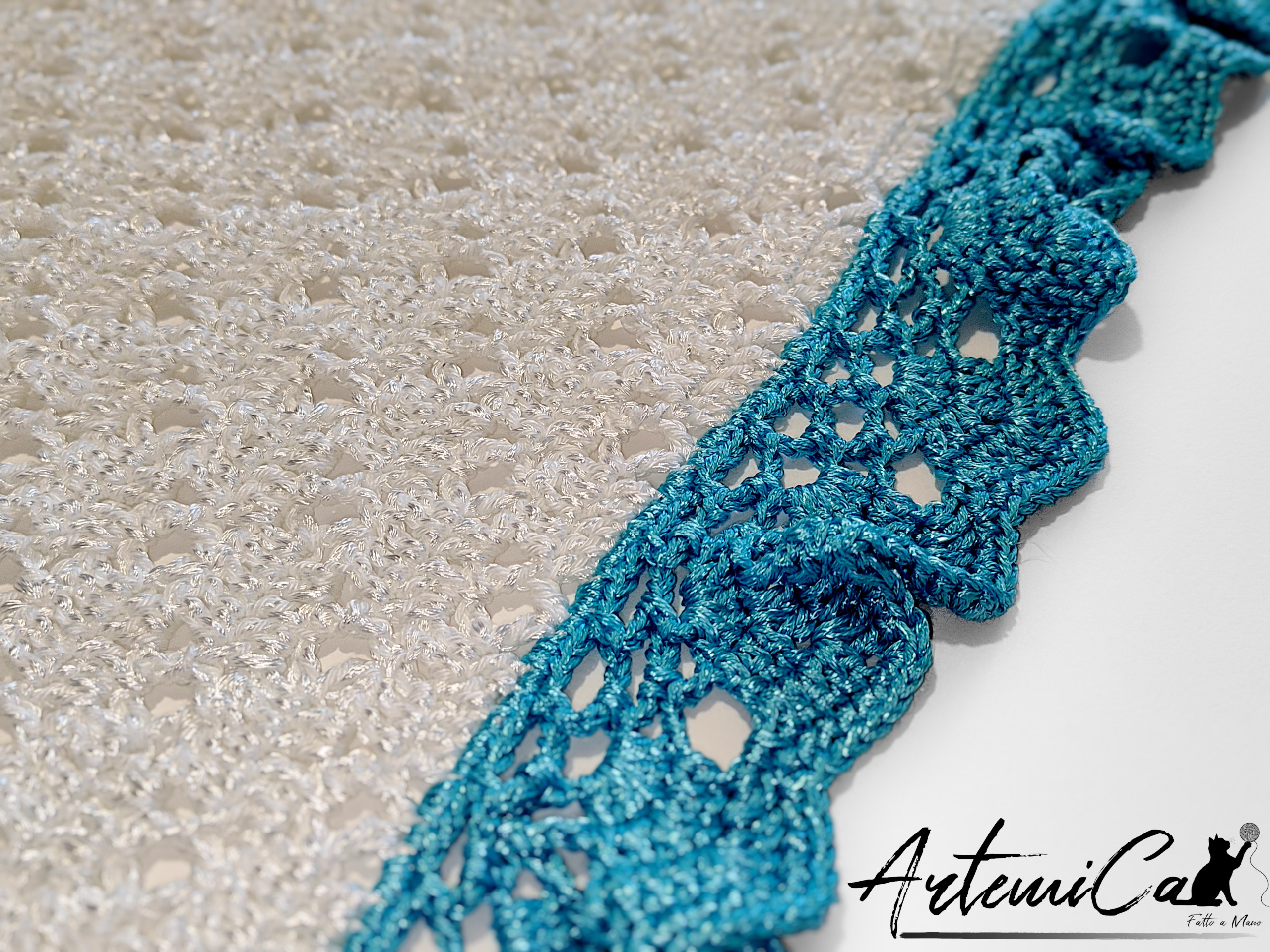 La combinazione cromatica funziona cosƬ: il bianco puroĀ del corpo centrale enfatizza la trama traforata e lascia respirare il design, mentre il turchese brillante del bordo crea un accento moderno e rinfrescante ā un equilibrio perfetto tra dolcezza infantile e carattere. Al tatto noterai subito la morbidezza setosa della viscosa e la definizione strutturata del bordo allāuncinetto: ĆØ una texture che invita a toccare e a coccolare.