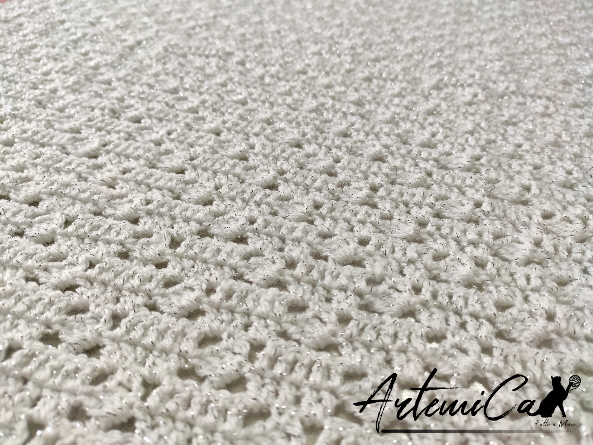 Il bianco puro della lana si abbina splendidamente con il bordo rosa, donando un tocco di femminilitƠ e dolcezza. Ma la vera magia sta nei dettagli! La lana ha dei delicati riflessi argento che la fanno risplendere come una stella nel cielo notturno. ƈ come avere un pezzo di cielo stellato a portata di mano!
