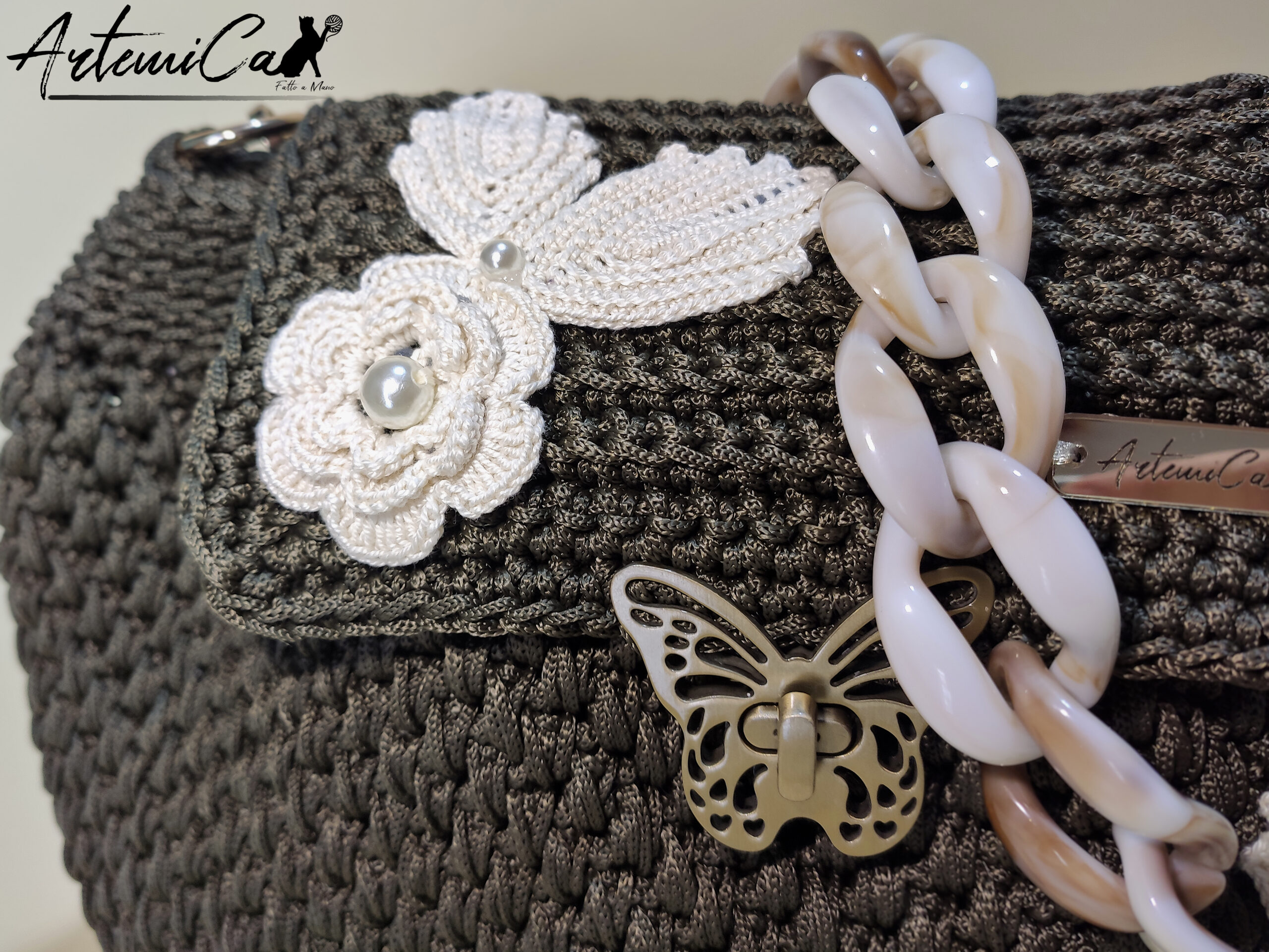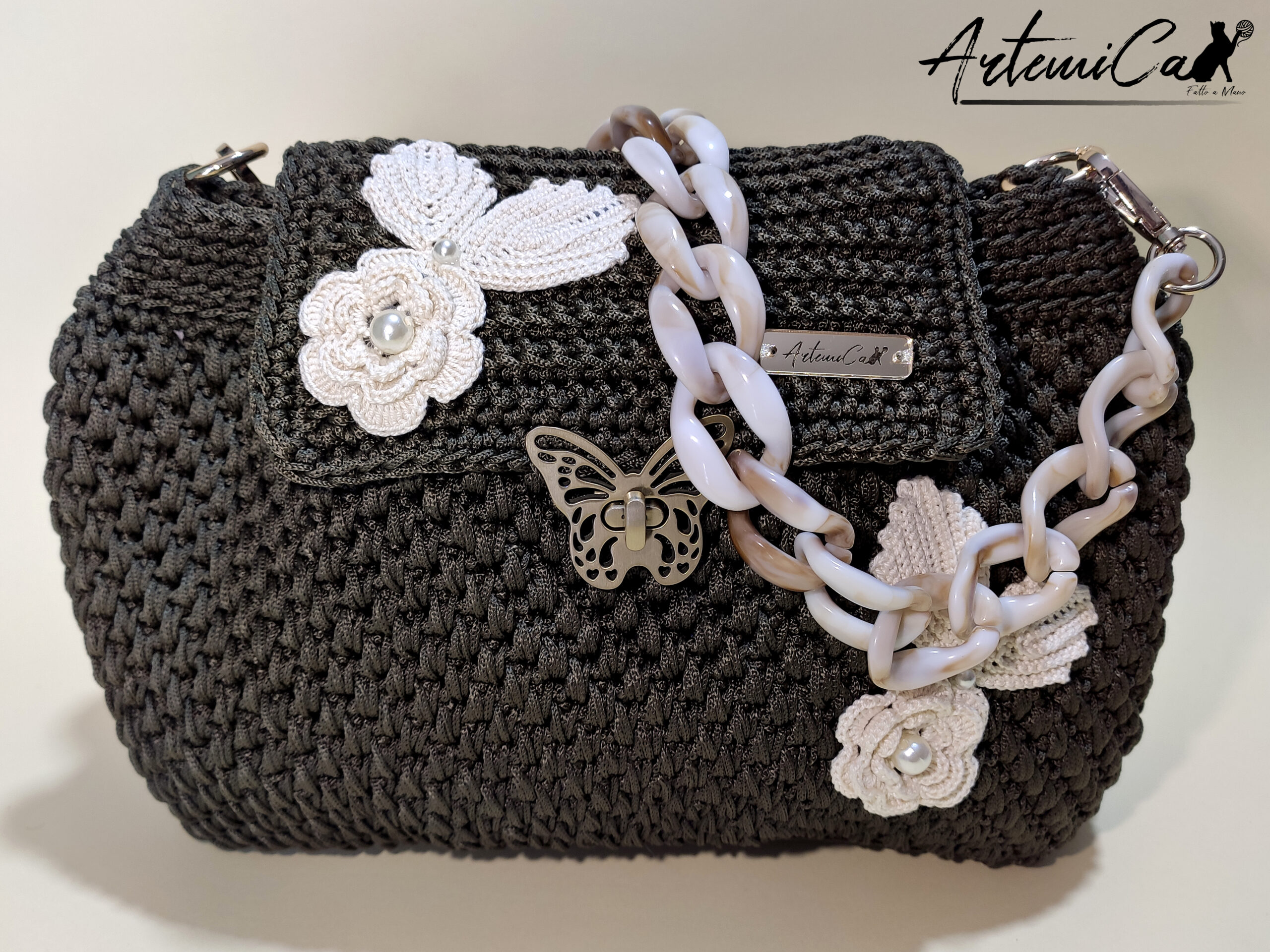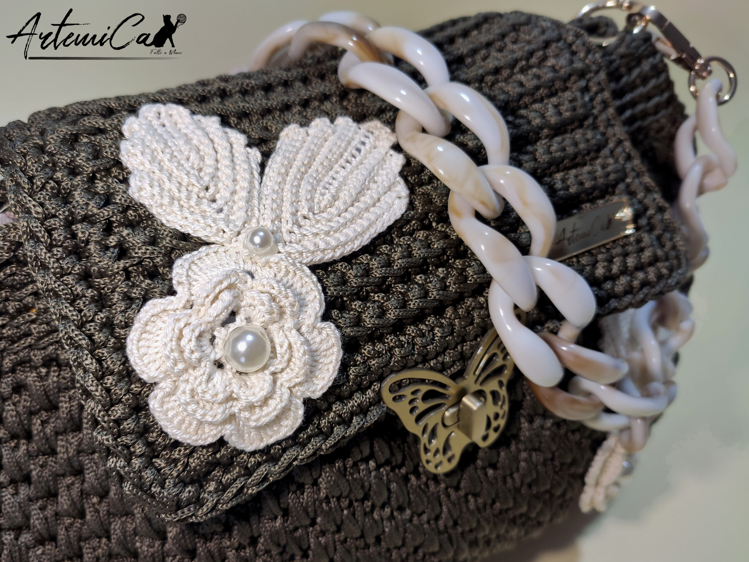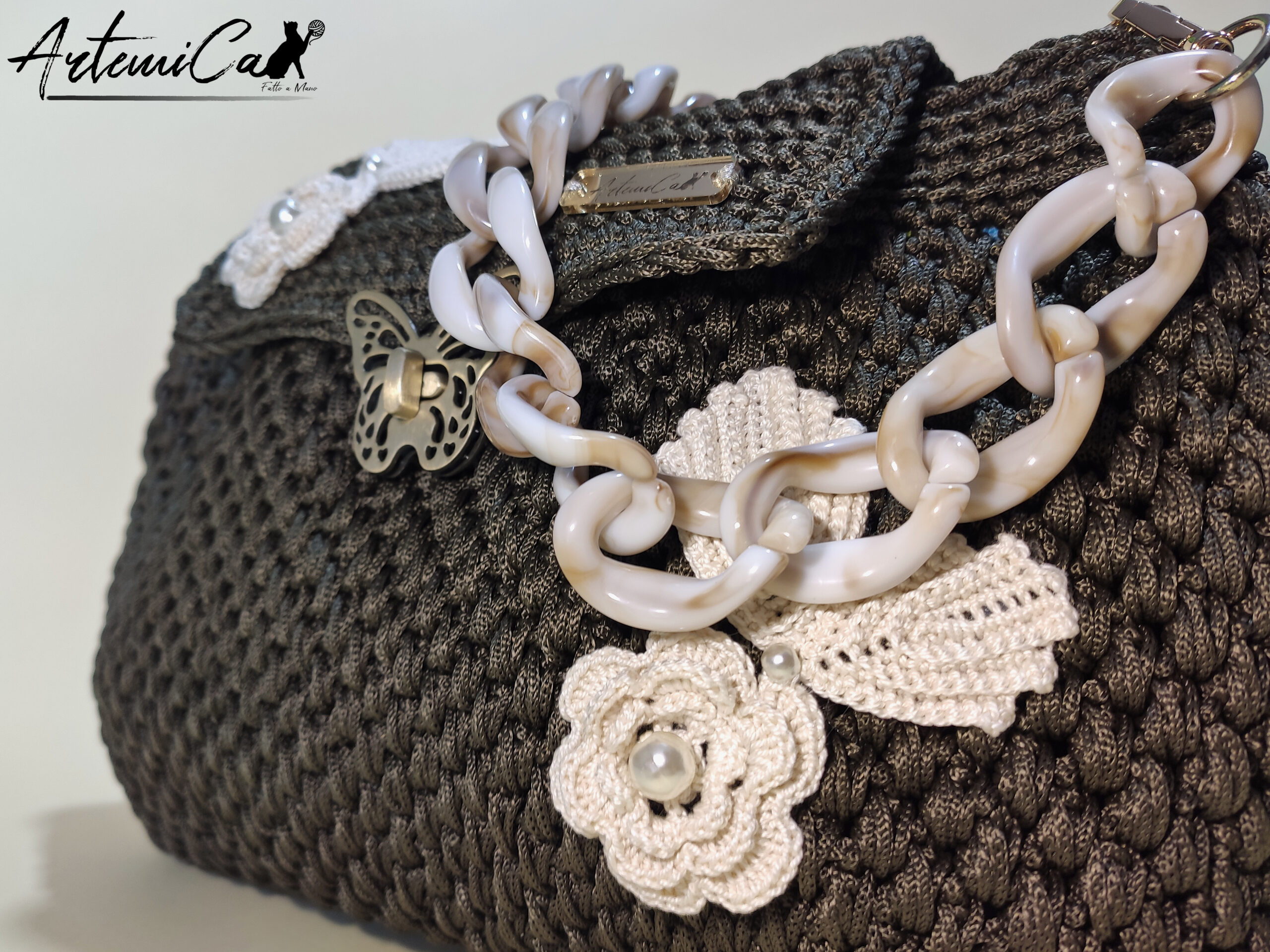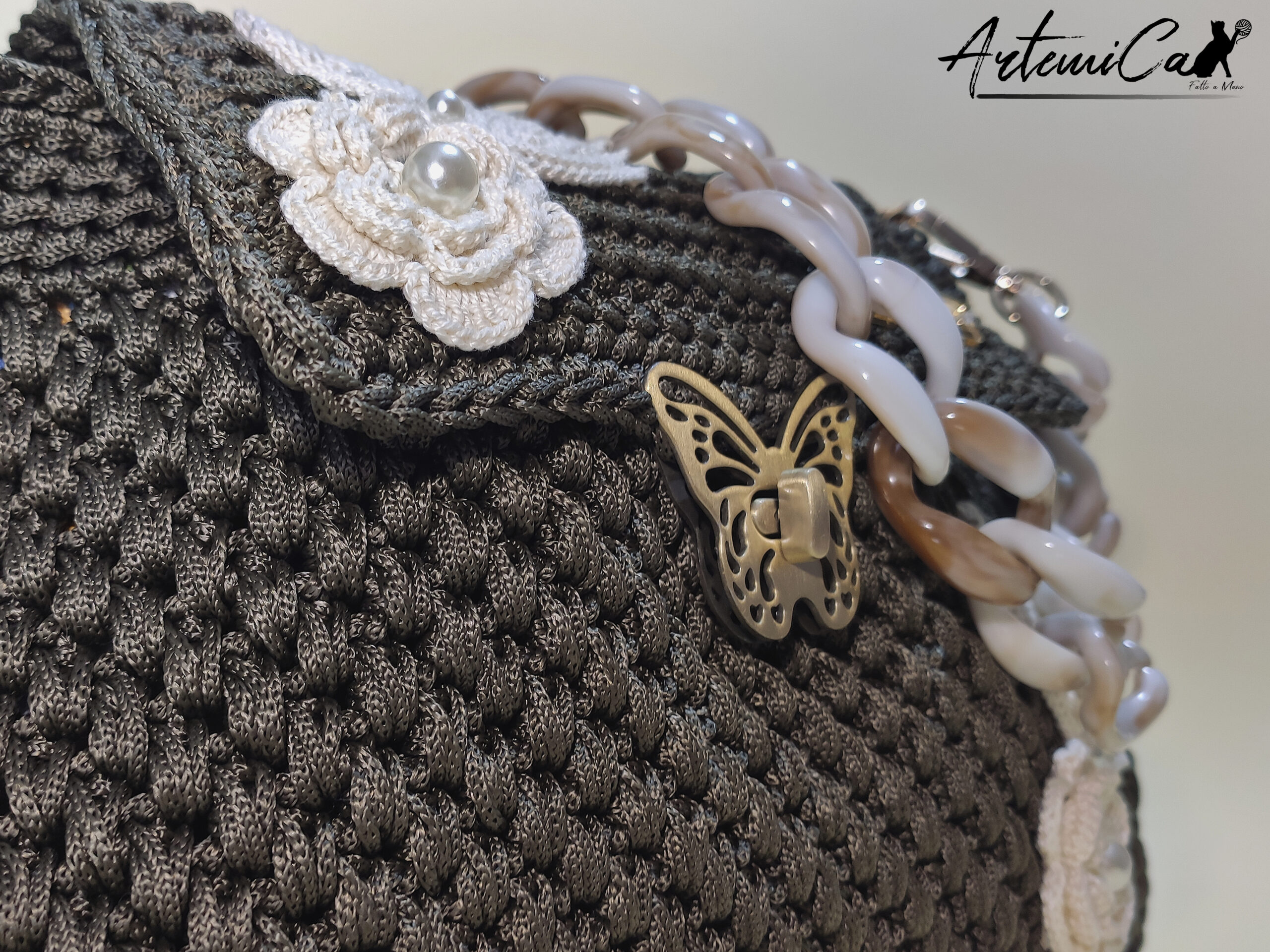 - Lavorazione artigianale all’uncinetto: Ogni “Danza di Rose” รจ un pezzo unico, frutto di passione e dedizione artigianale. Un’opera d’arte realizzata a mano con maestria e attenzione ai dettagli, che rende ogni borsa un piccolo capolavoro di stile e originalitร .