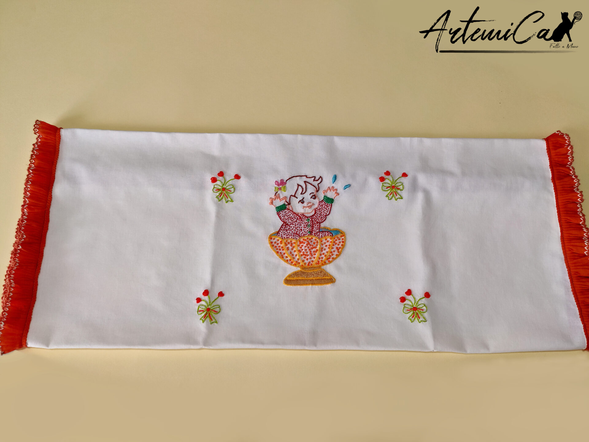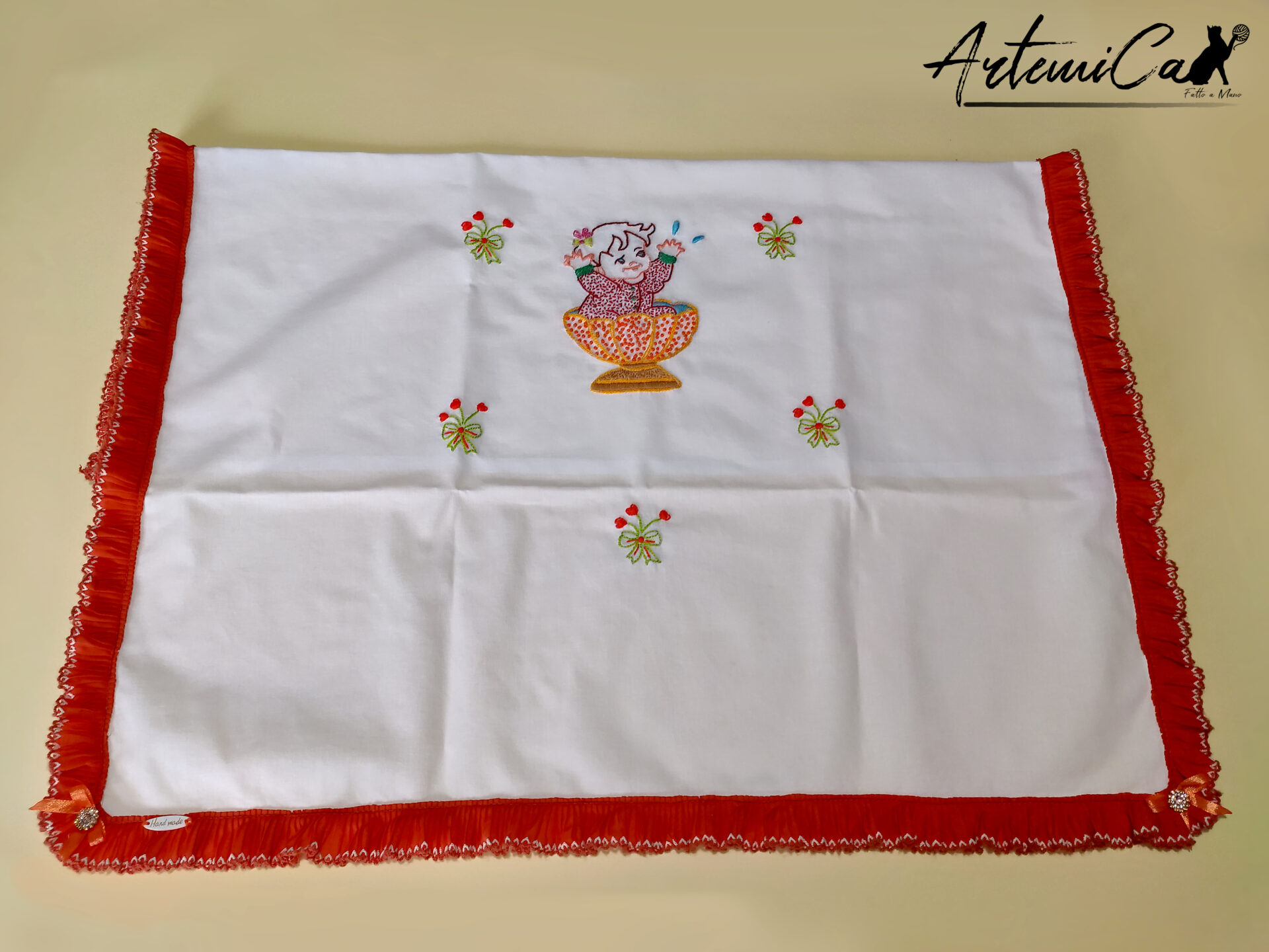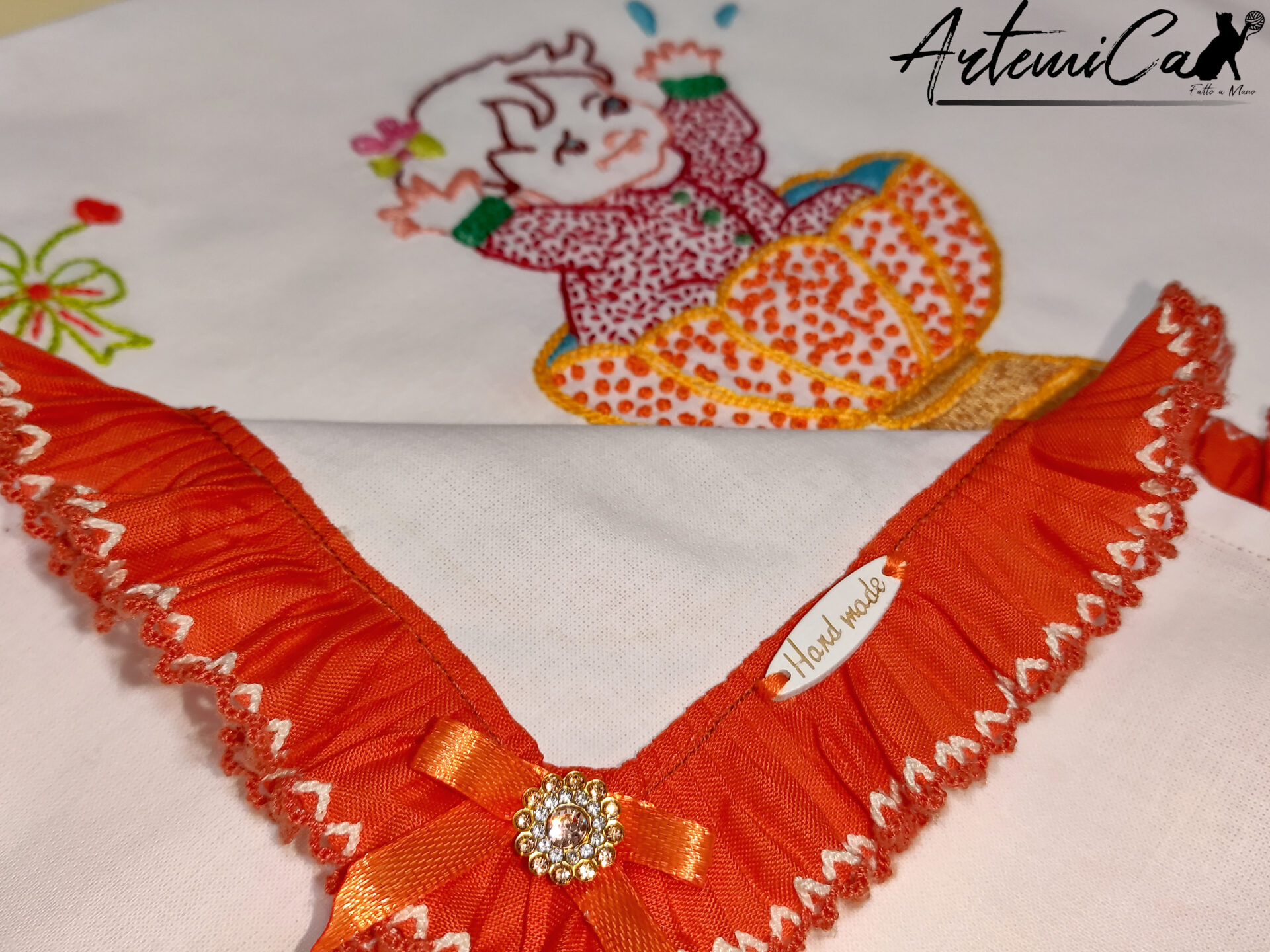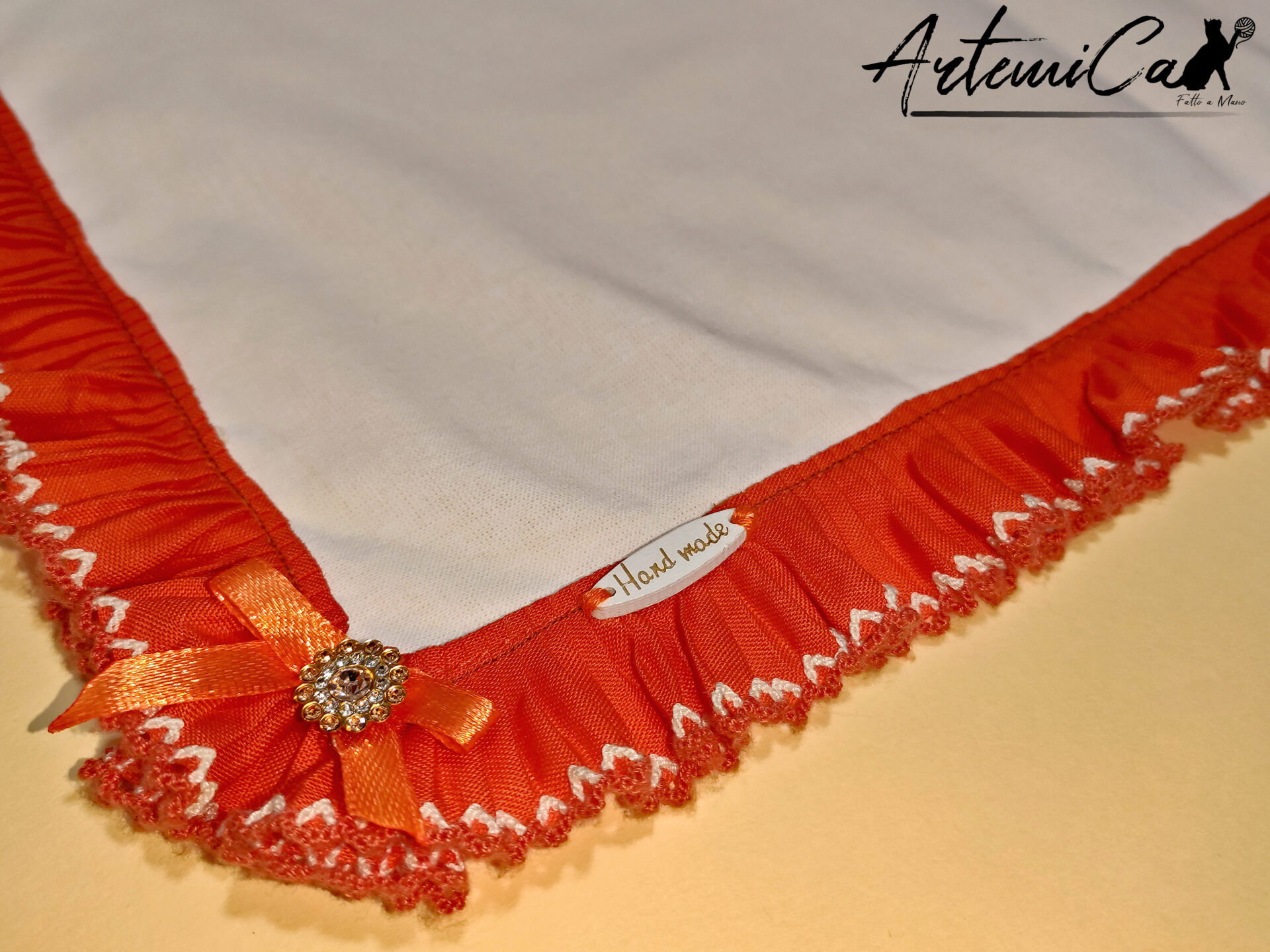 Il bordo plissettato color arancione aggiunge un tocco di vivacità e gioia, mentrle i fiocchetti agli angoli regalano un dolce sorriso. I punti luce sono come stelline che illuminano questo capolavoro fatto a mano, conferendo un tocco di magia che solo il lavoro artigianale può regalare.