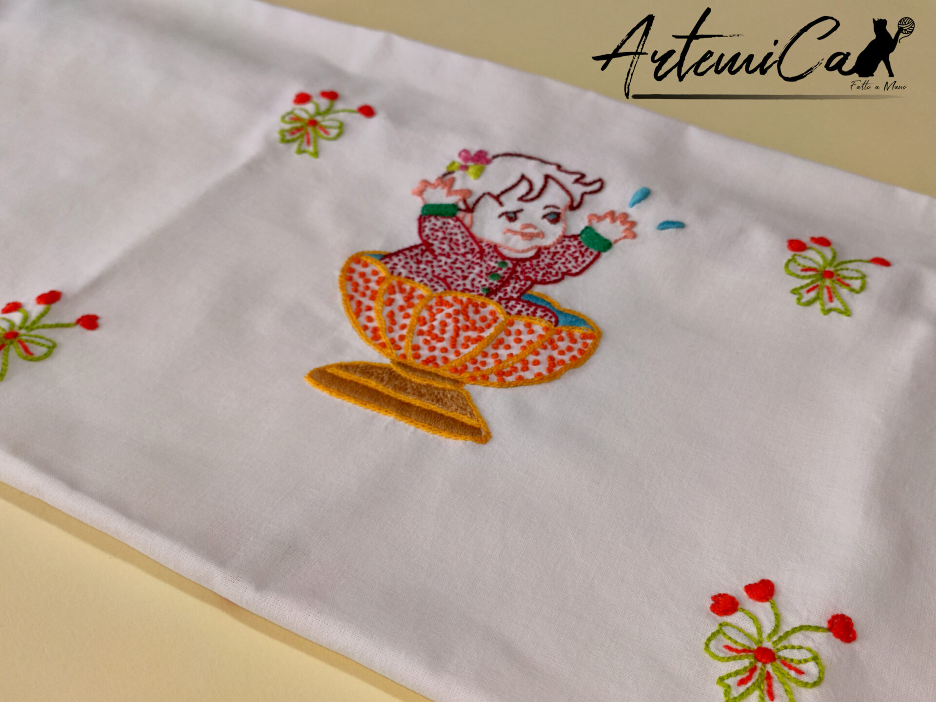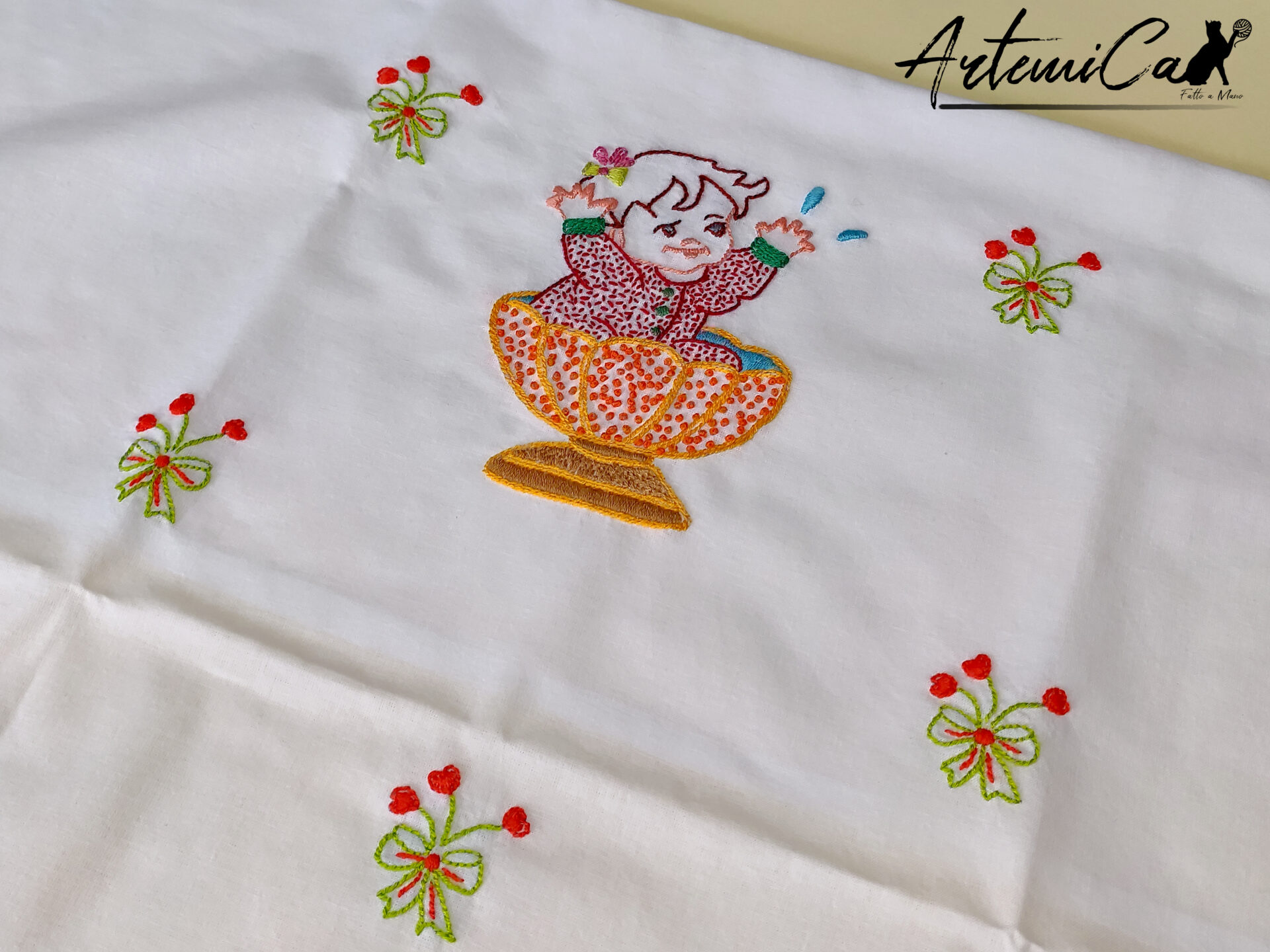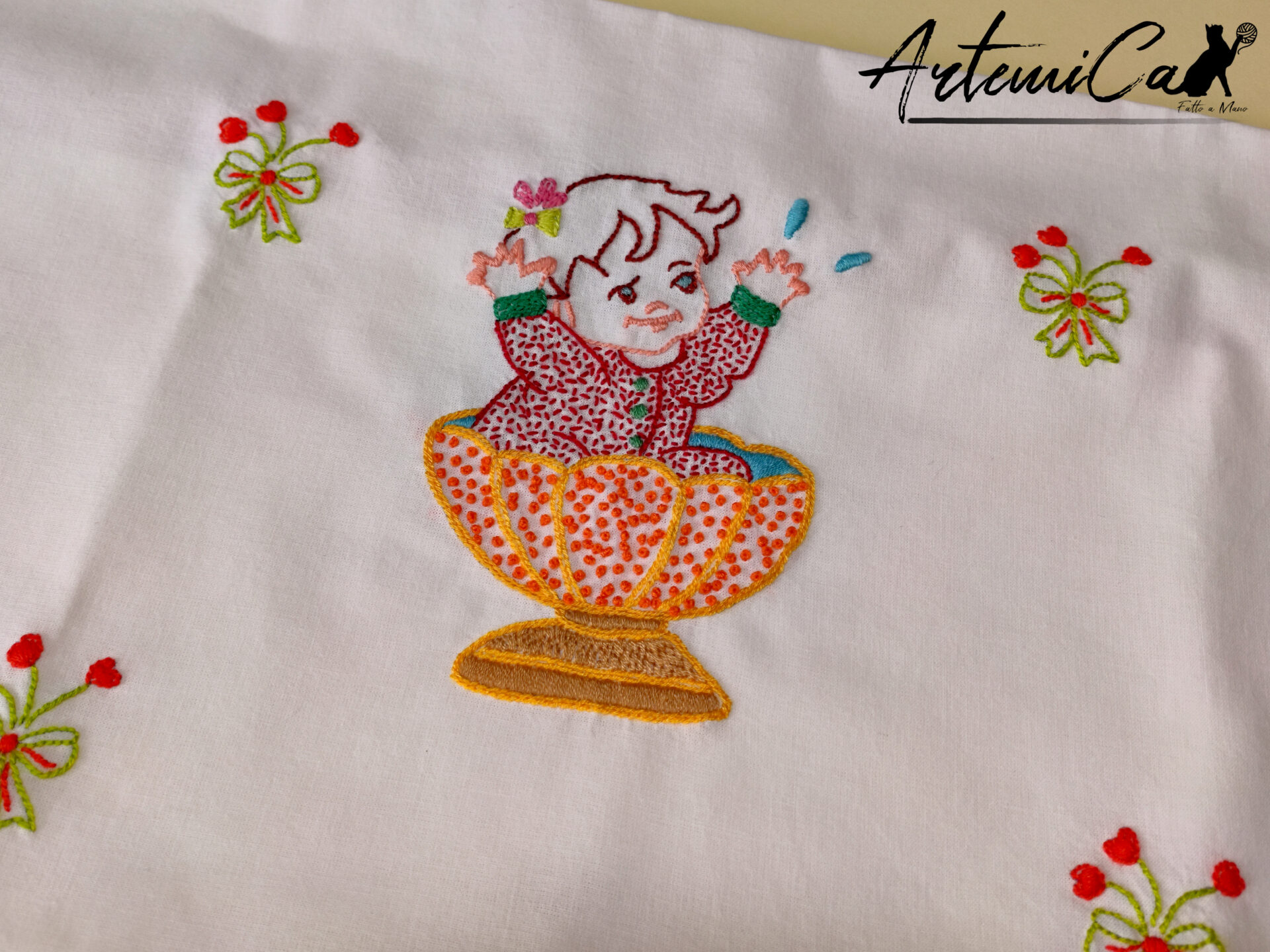 Scendiamo nei dettagli affascinanti di questa copertina unica! Ogni punto ricamato a mano racconta una storia tenera: una bimba allegra che gioca in una coppa di “latte”, circondata da mazzolini di fiori. I colori delicati catturano l’essenza della dolcezza infantile.