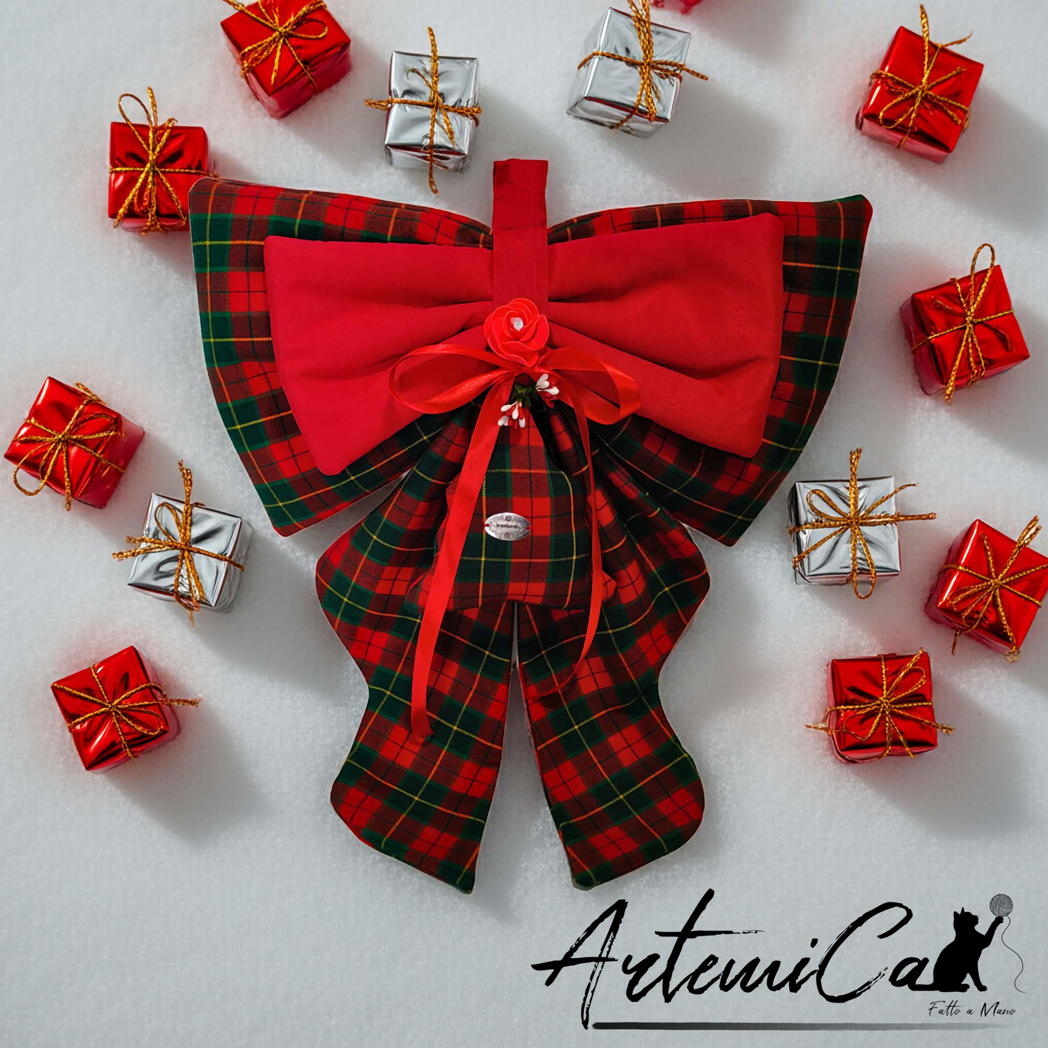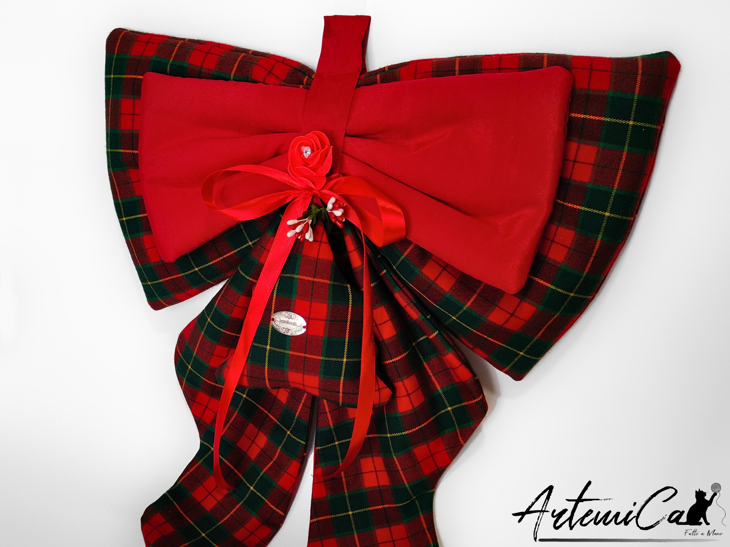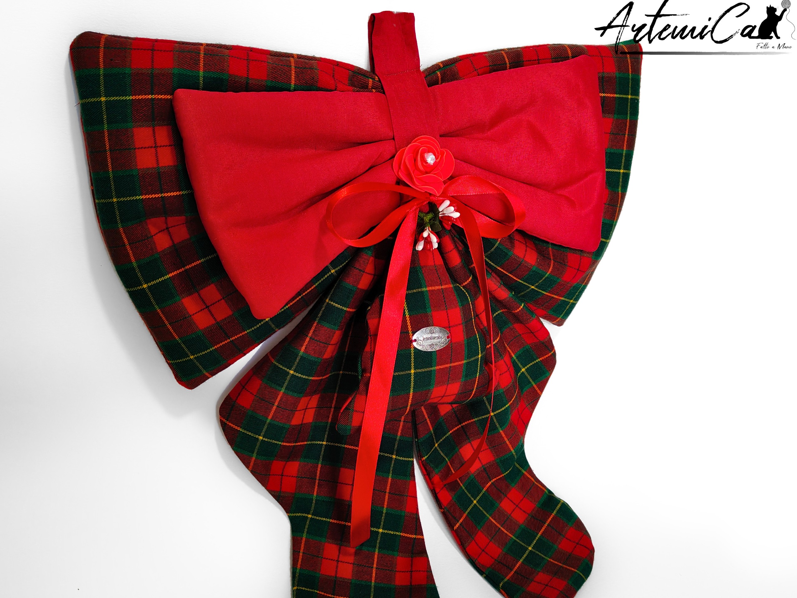 Ogni morbida piega del tartan รจ modellata a mano con cura e pazienza: non esistono due fiocchi perfettamente identici, ed รจ proprio questa unicitร che rende questa decorazione un piccolo pezzo di magia da appendere alla porta.
