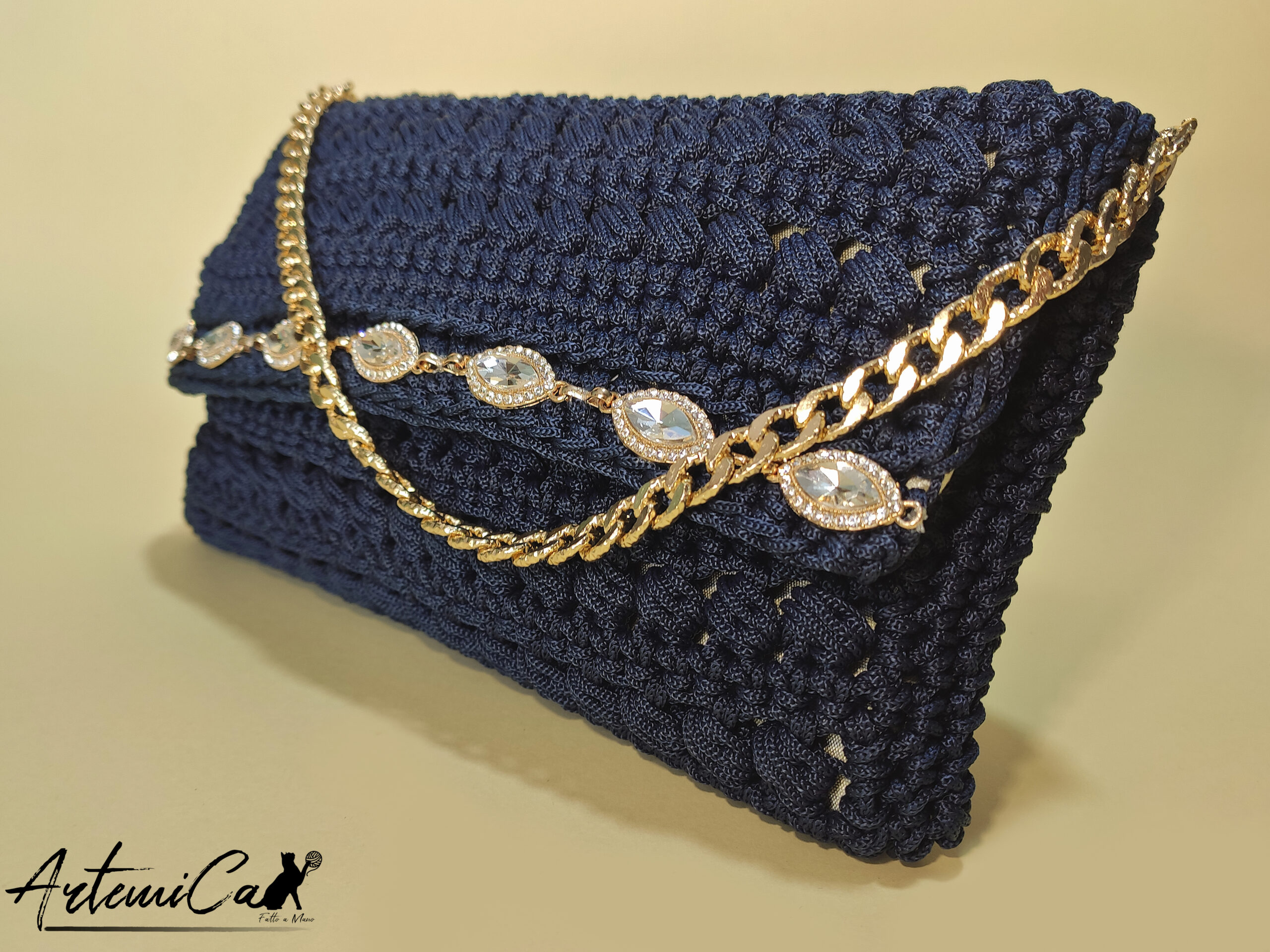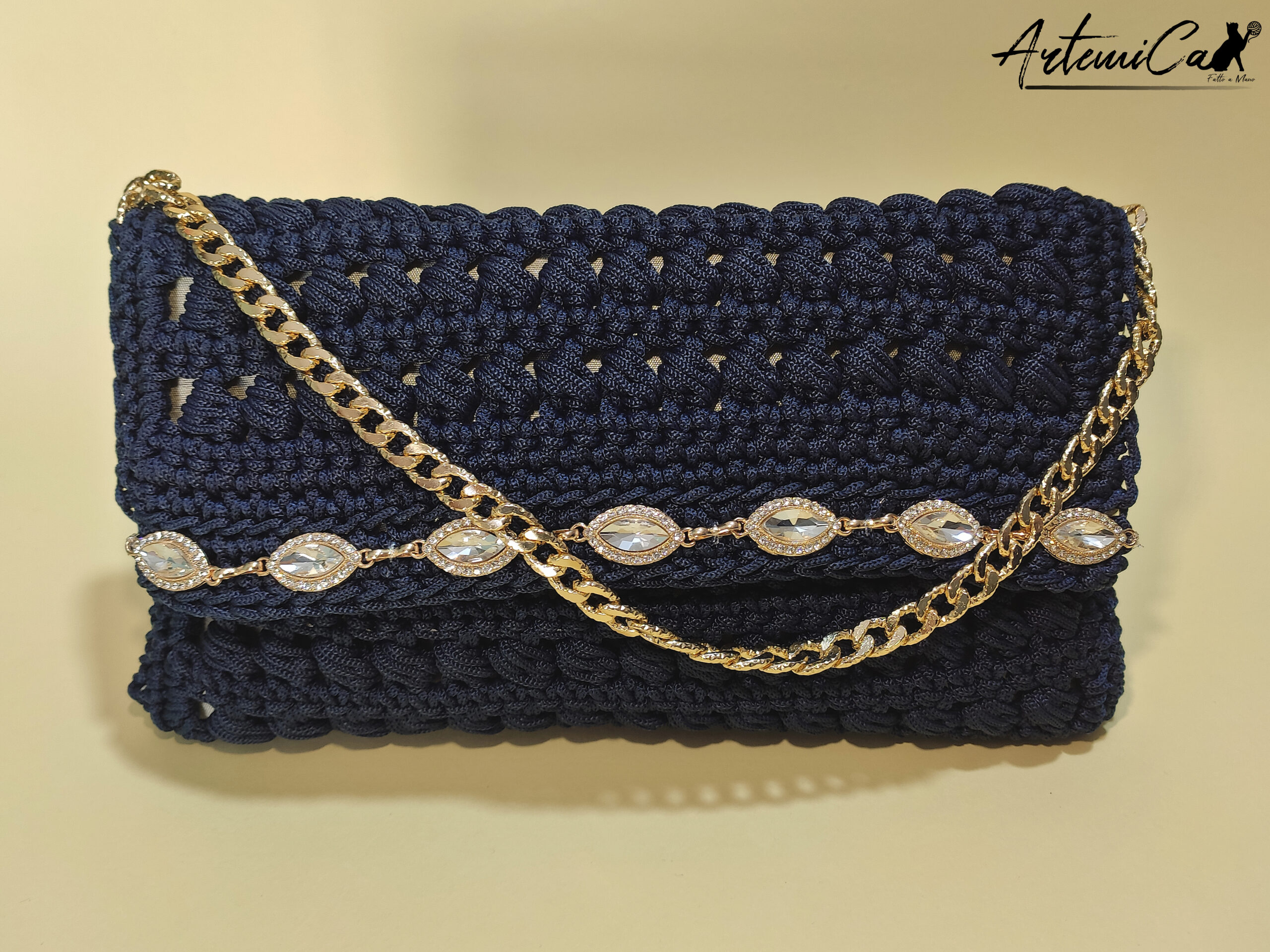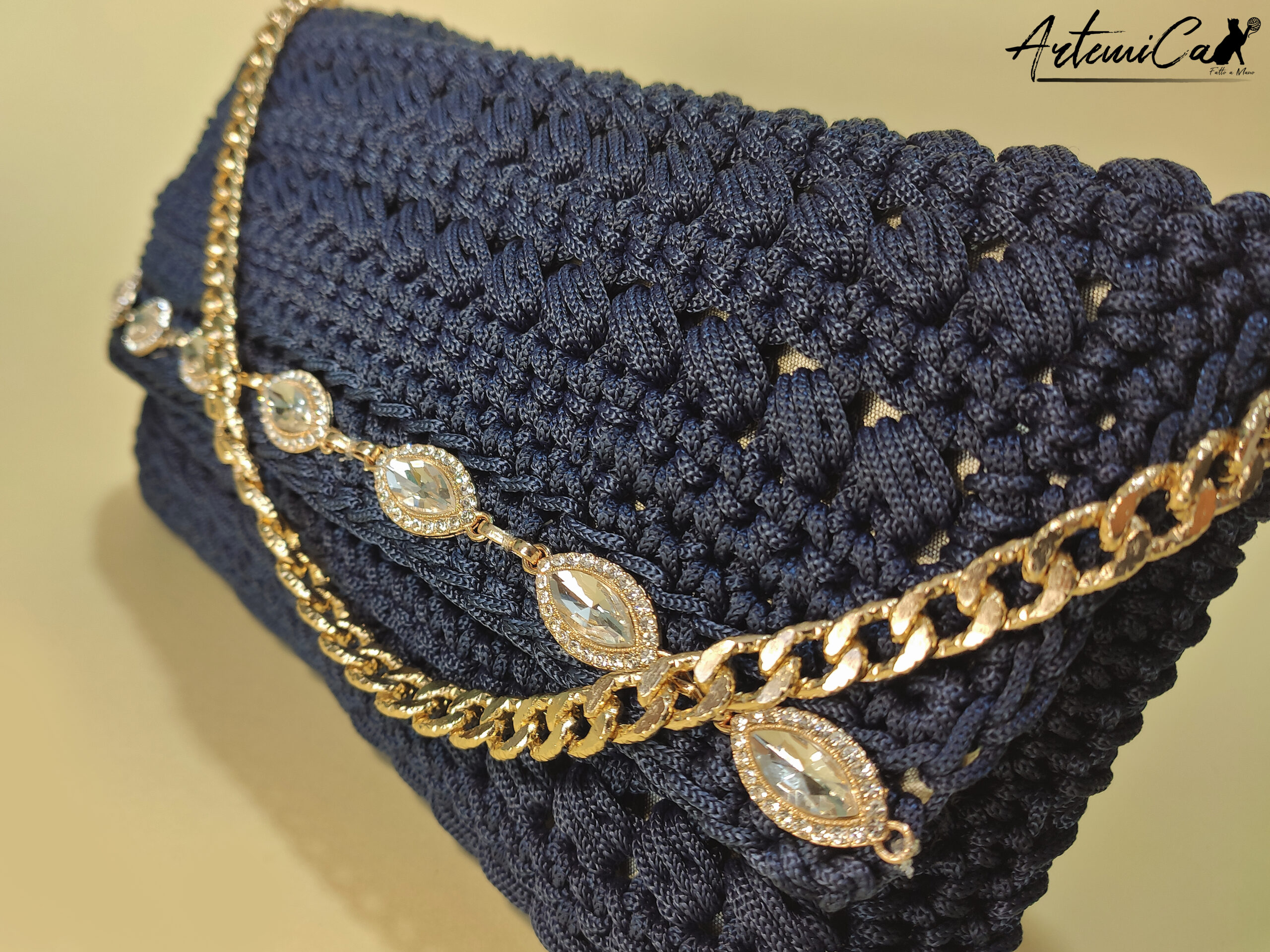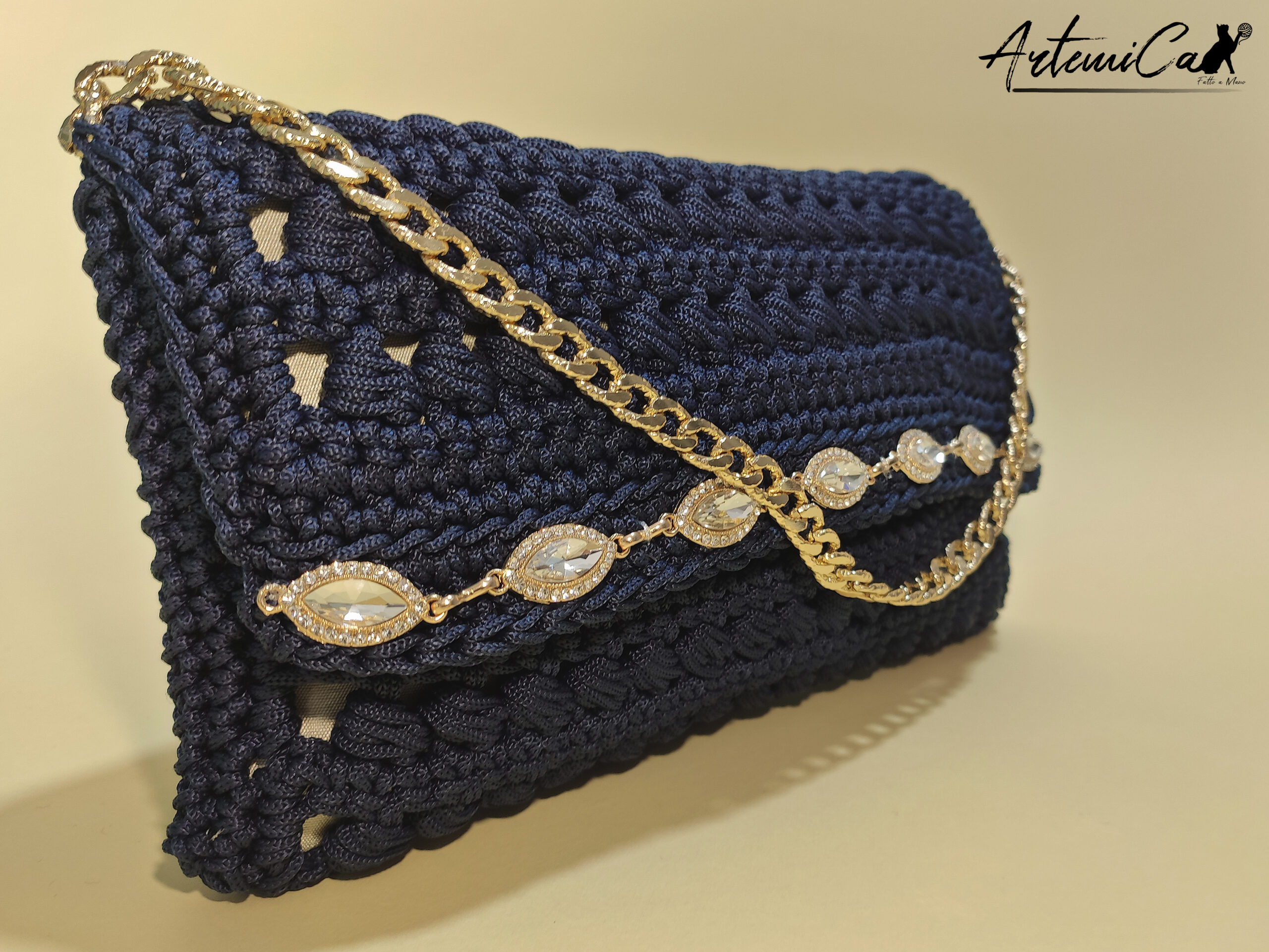 Glamour Abbagliante non รจ solo una borsa, รจ un’opera d’arte unica, realizzata a mano da abili artigiane italiane. Il morbido cordino blu notte รจ lavorato all’uncinetto con maestria, creando un motivo sinuoso e raffinato. I dettagli dorati e la fascia di cristalli e strass sono applicati con cura, impreziosendo la borsa e donandole un tocco di classe senza tempo.