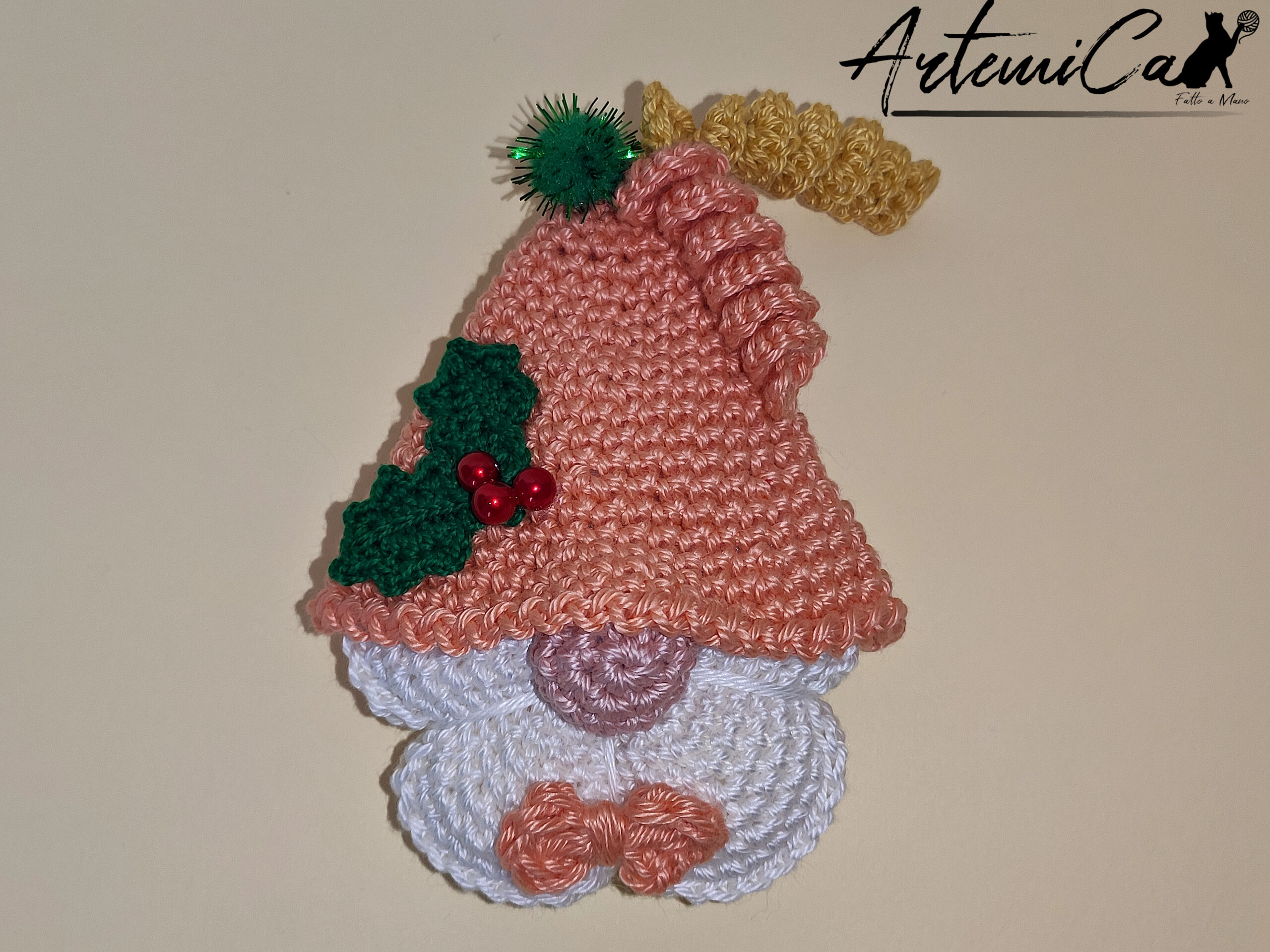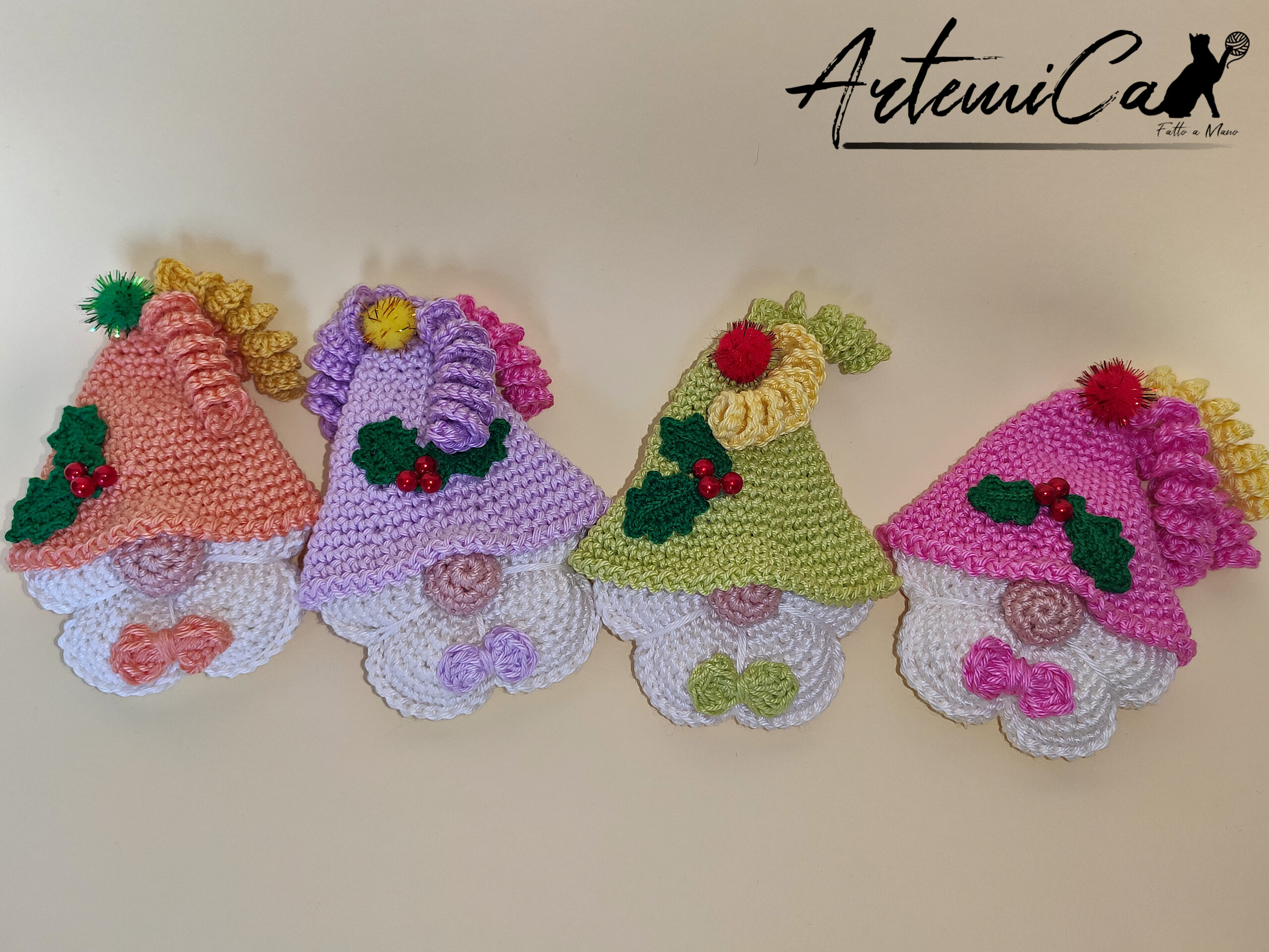 Ogni Gnomo all’uncinetto di Natale ĆØ il frutto di unāarte manuale che intreccia tradizione e creativitĆ . Realizzati completamente a mano, questi piccoli gnomi prendono vita grazie all’uso di filati pregiati e a una gamma di colori pastello che ispira dolcezza e tranquillitĆ : rosa tenue, lilla delicato, verde pistacchio e un dolce arancione che richiama il calore delle festivitĆ . Lāattenzione al dettaglio ĆØ evidente in ogni singolo gnomo, con il loro cappello a punta che ĆØ un vero e proprio protagonista. Decorato con pompon colorati, bacche di vischio e un bordo arricciato, ogni cappello ĆØ una piccola opera d’arte che aggiunge un tocco festivo e gioioso.