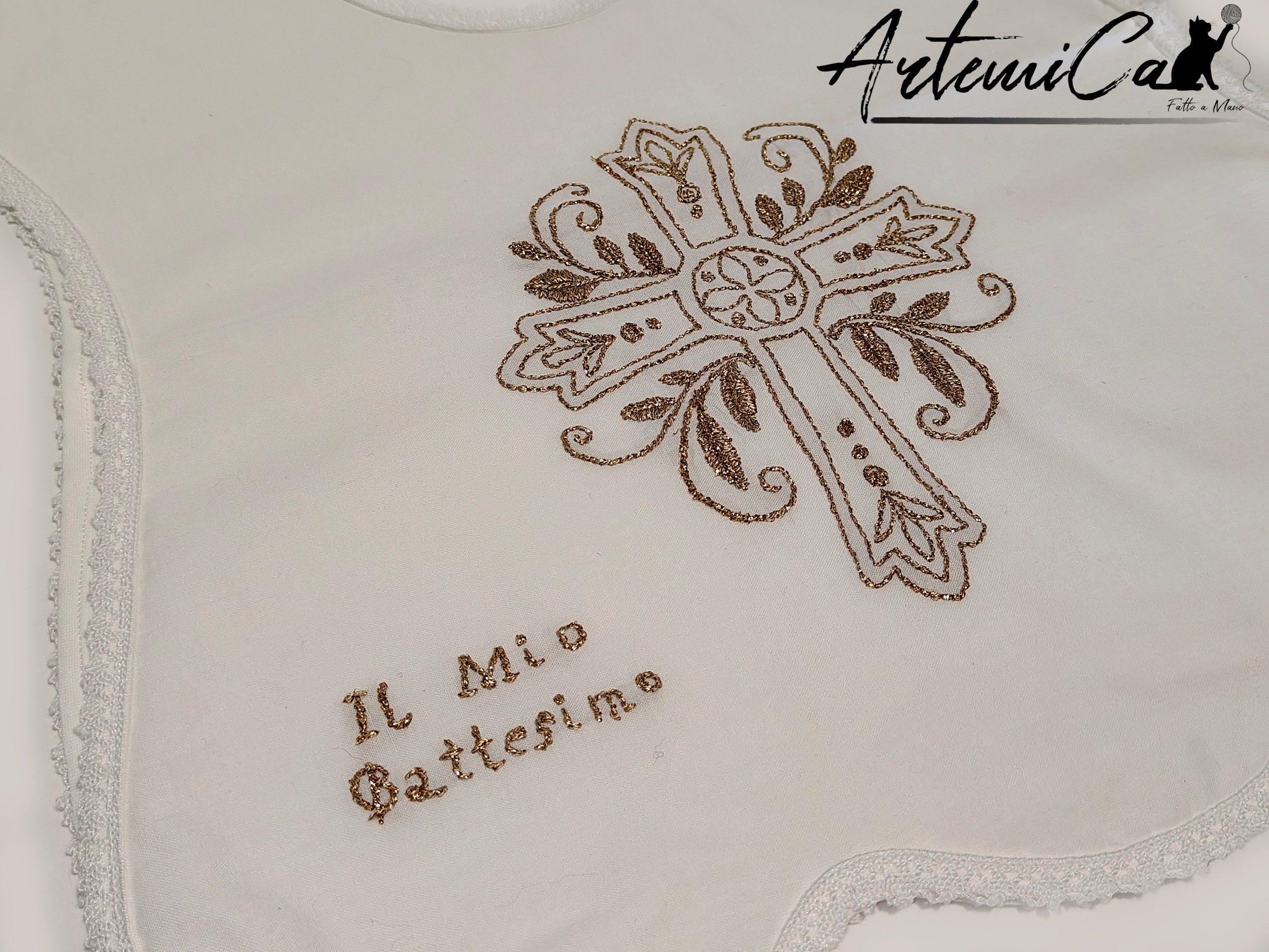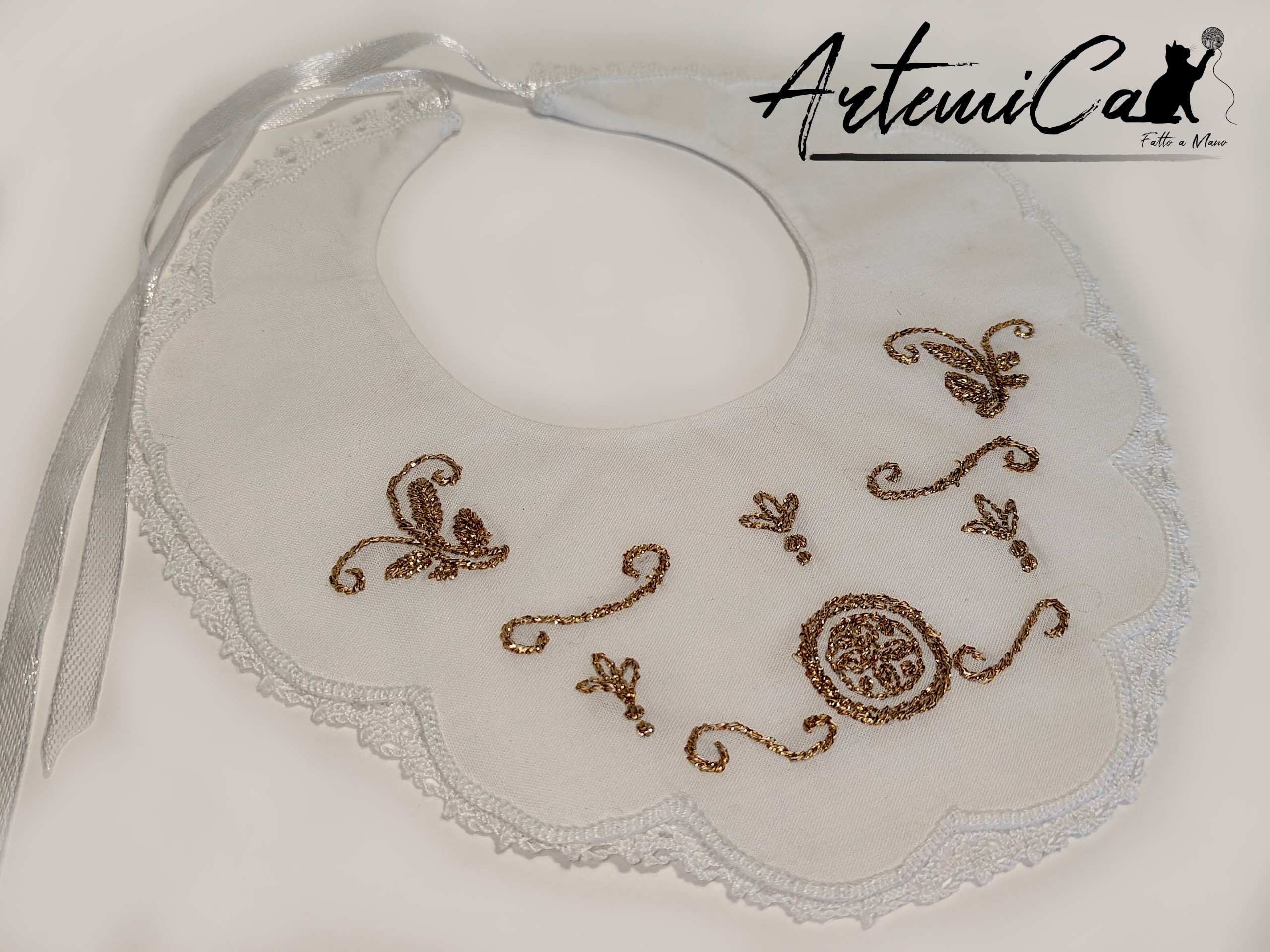 Infine, il bavaglino, con la sua forma arrotondata e con motivo ad onde lungo il bordo esterno. Si allaccia sul retro con sottili nastrini bianchi, morbidi sulla pelle delicata. Al posto della croce centrale, qui troviamo un elegante motivo ornamentale a ghirlanda, con dettagli dorati simmetrici che conferiscono al bavaglino un carattere proprio, raffinato e mai banale. Il girocollo misura 27 cm.