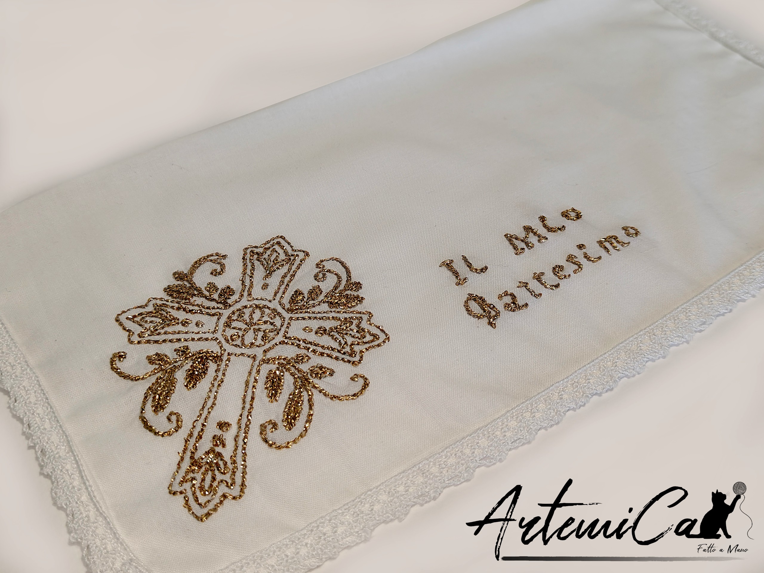 Il fazzoletto, posizionato in alto a sinistra nella composizione, รจ un quadrato di 30×30 cm bordato con la stessa passamaneria che corre lungo la veste, creando un dialogo visivo immediato tra i pezzi. In un angolo, la croce fiorita si ripete in scala ridotta, accompagnata ancora dalla dicitura “Il Mio Battesimo”: un dettaglio che fa sรฌ che ogni elemento del set parli la stessa lingua.