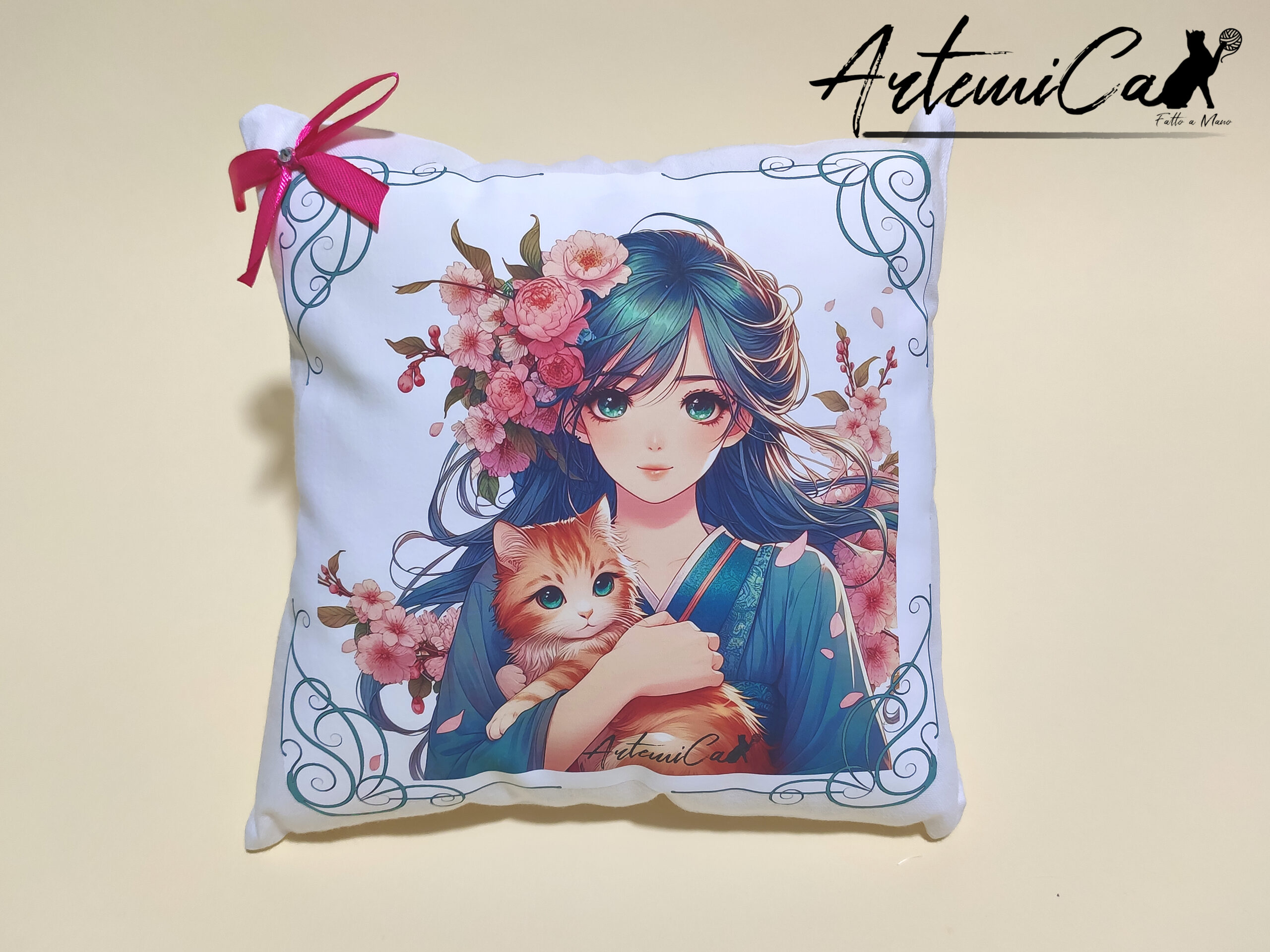 Ogni dettaglio del cuscino, che misura 20×20 cm, è pensato per evocare questa quiete: la ragazza in kimono, rappresentata con colori vivaci e precisi – viola, fucsia, verde o rosa antico – sembra quasi animarsi e raccontarti la sua storia. Il viola porta con sé il fascino del mistero e della riflessione, invitandoti a momenti di introspezione.