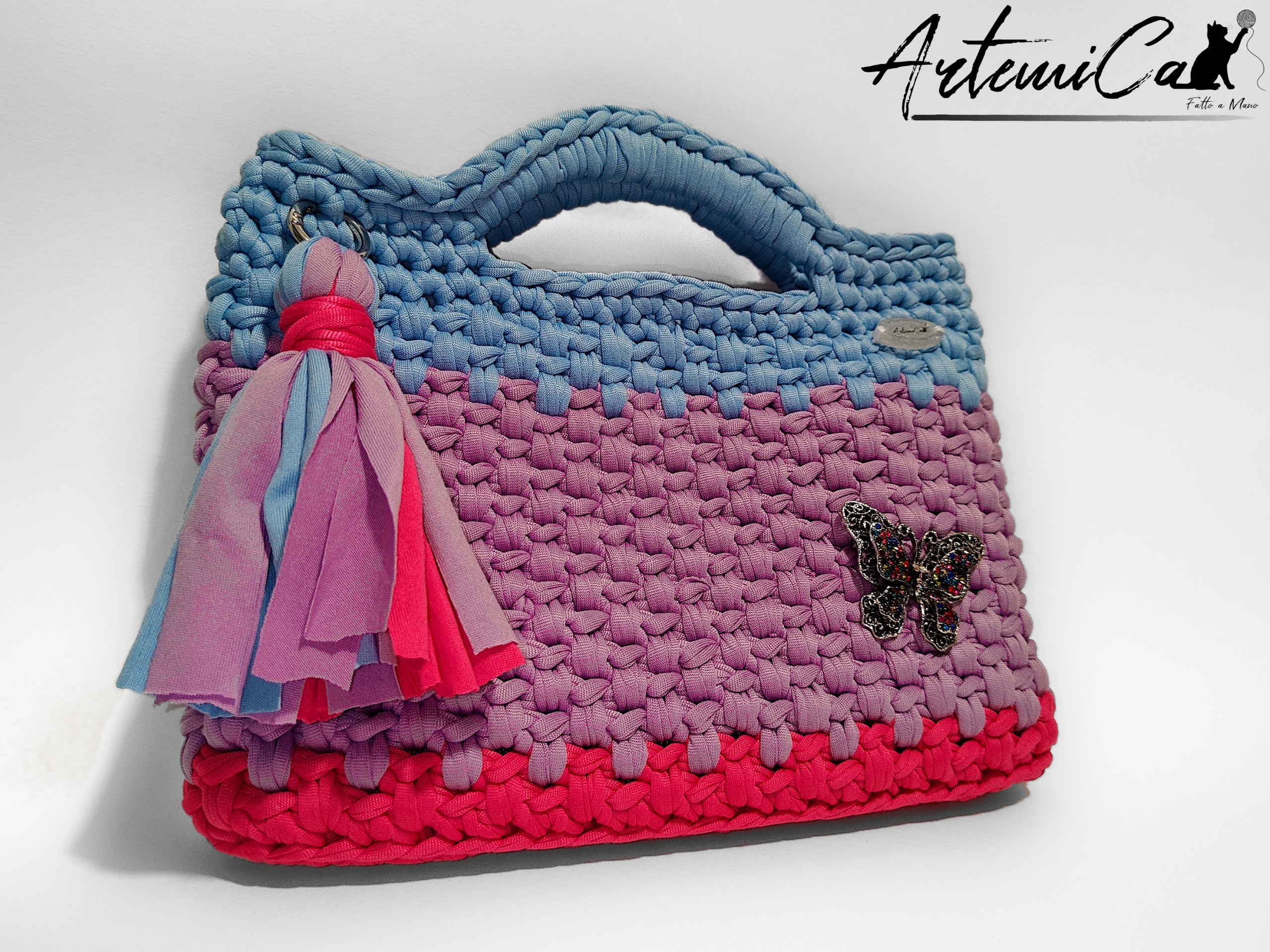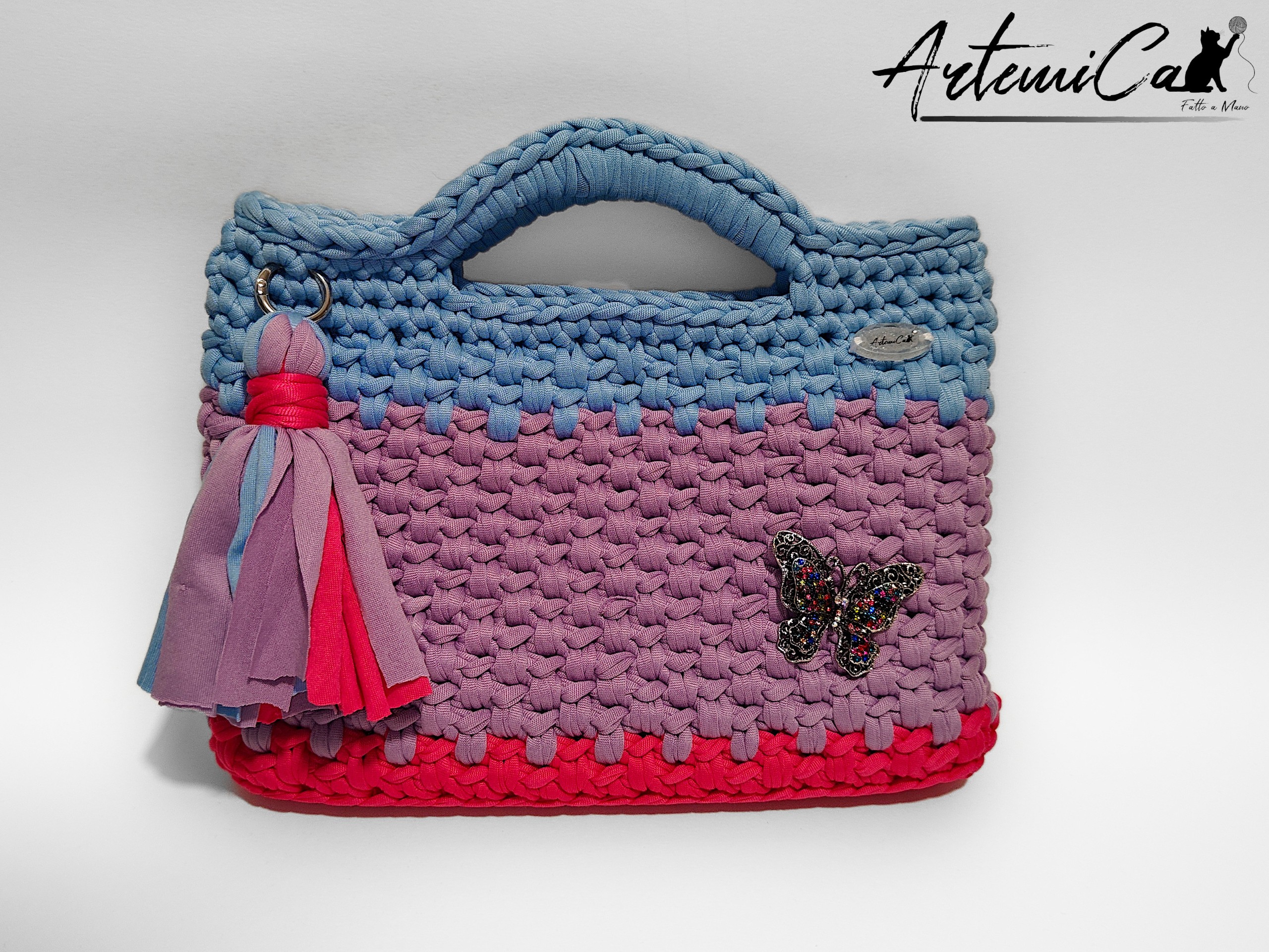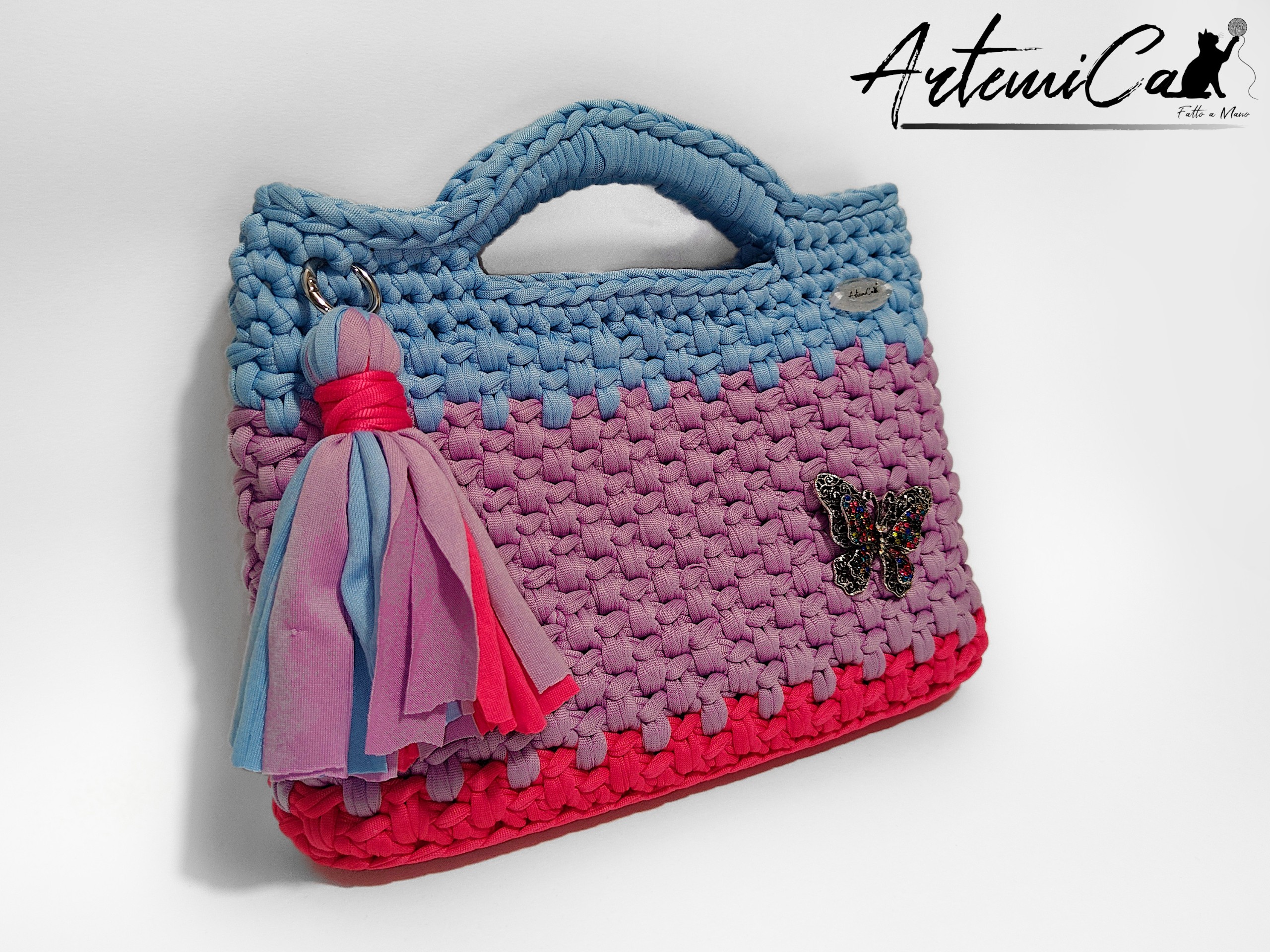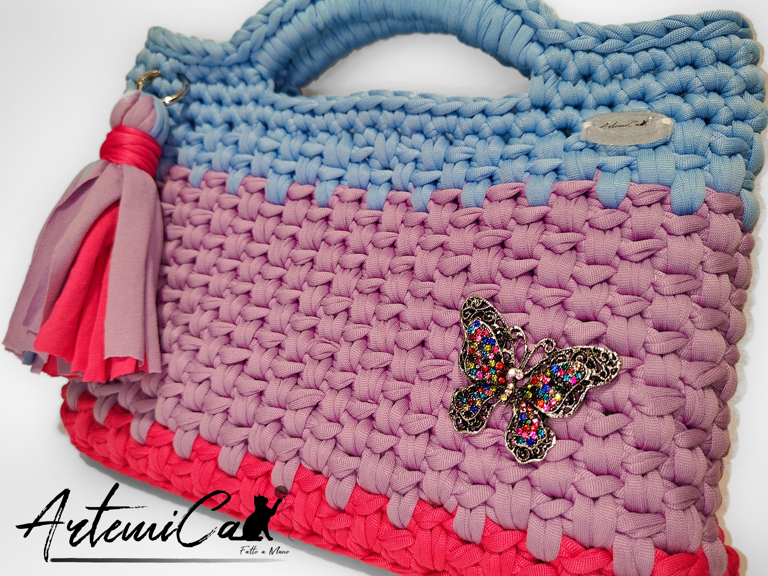Come se non bastasse, il design si arricchisce di dettagli che la rendono unica: una nappina multicolore che gioca con i contrasti cromatici, una decorazione a farfalla dai riflessi luminosi, e la placca ArtemiCat che ne certifica lโ€™autenticitร .