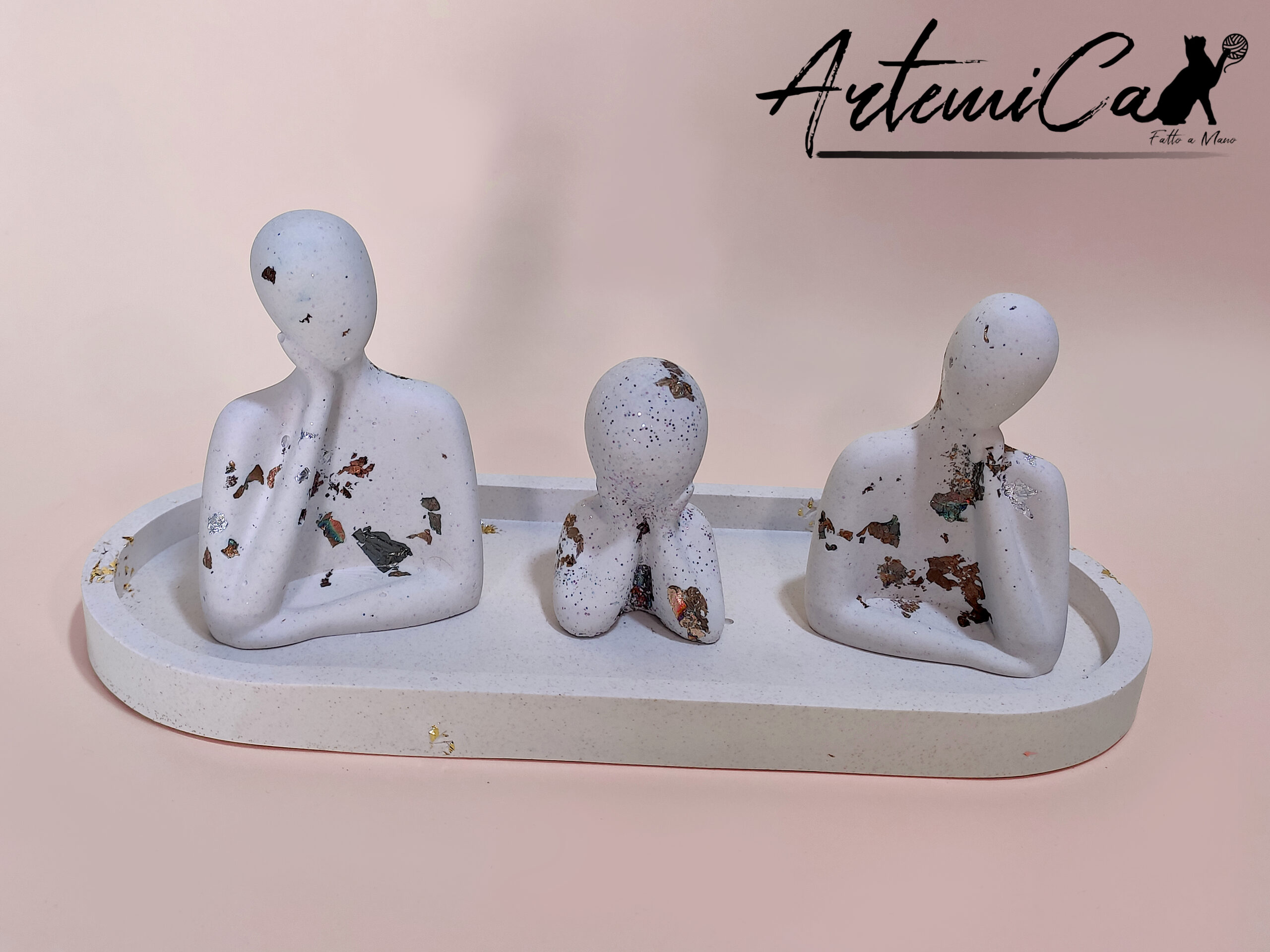 Nelle nostre foto, potrai anche vedere il vassoio accoppiato con altri pezzi della nostra collezione, come il Pensieri in Resina: Tris d’Arte – Statuette Bianche con Foglia Oro, e Aurora: Splendore Bianco e scintille d’Oro Fatta a Mano, che possono essere acquistati separatamente.