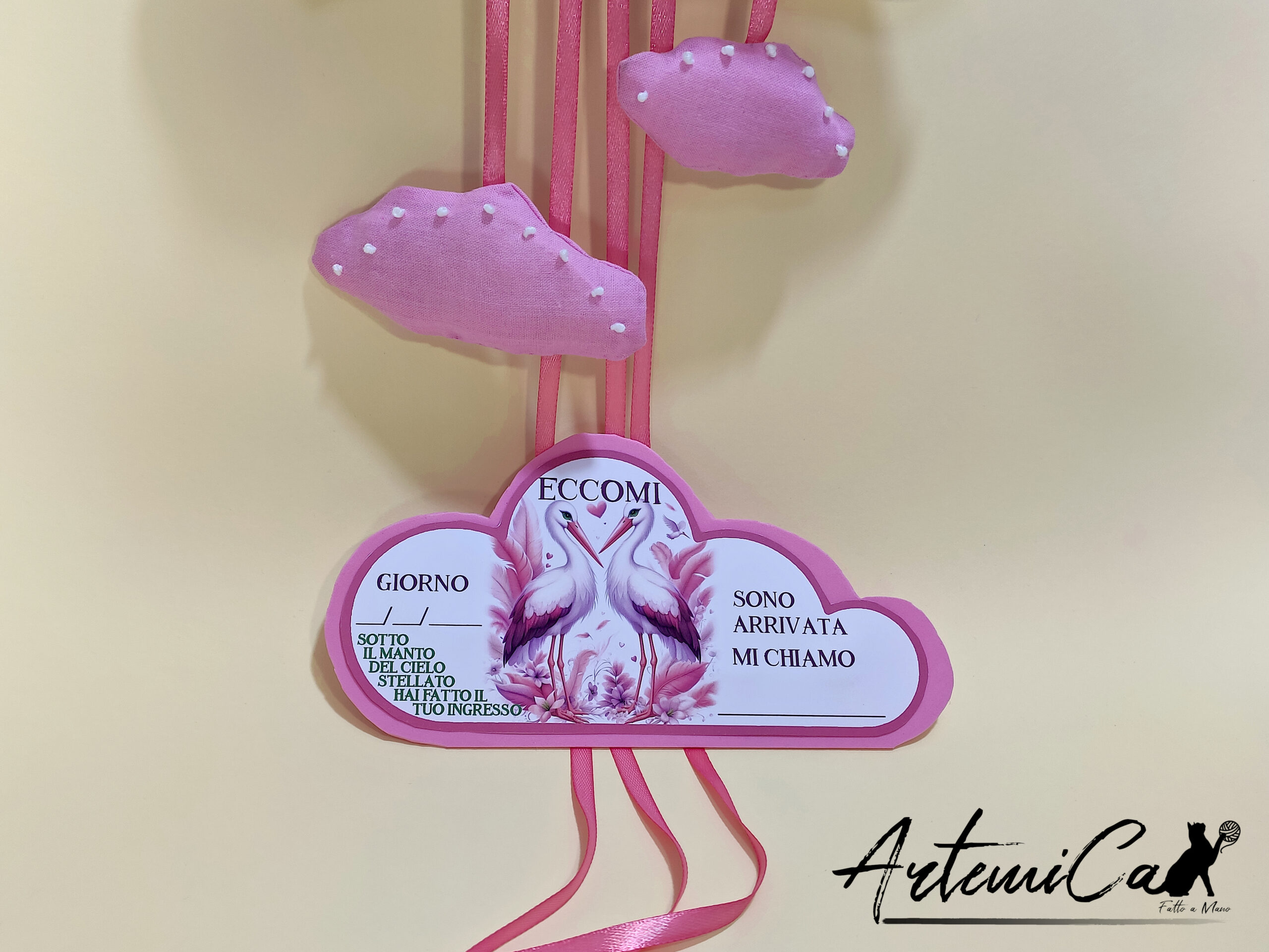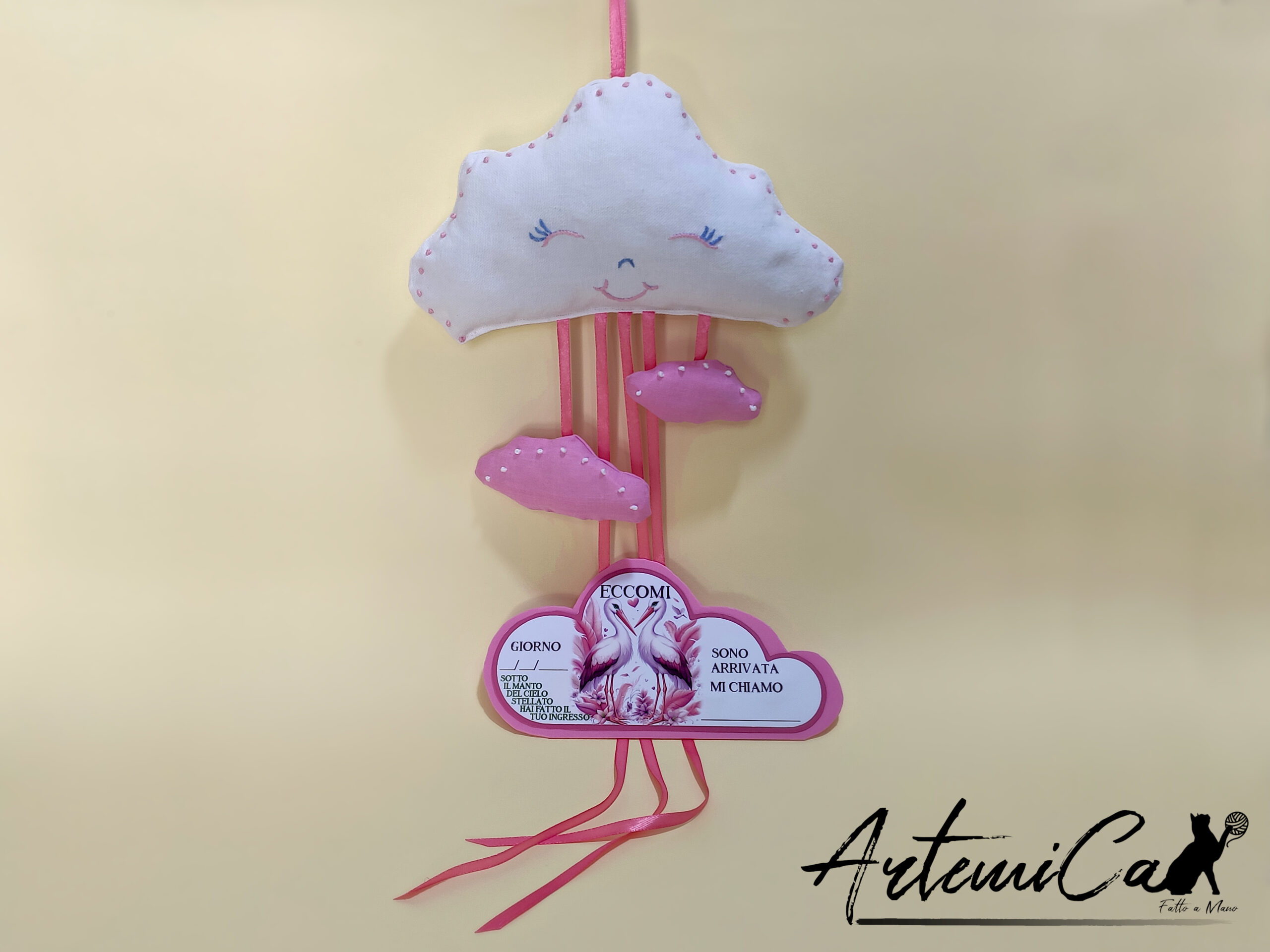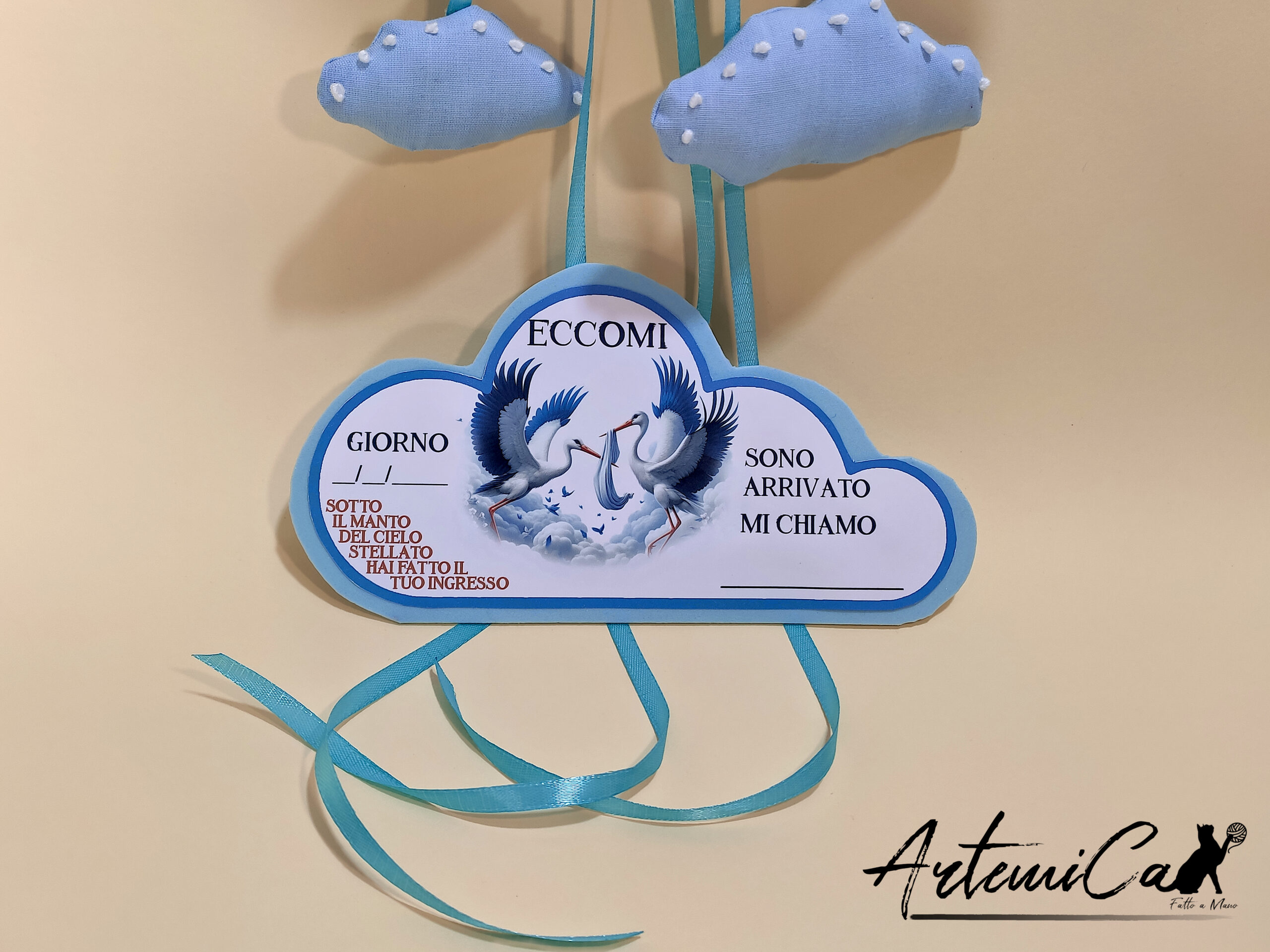 Ogni fiocco nascita Nuvole in Festa è un pezzo unico e irripetibile, realizzato con amore e passione da mani esperte. Un regalo prezioso che il tuo bambino conserverà per sempre come un dolce ricordo dei suoi primi giorni di vita.