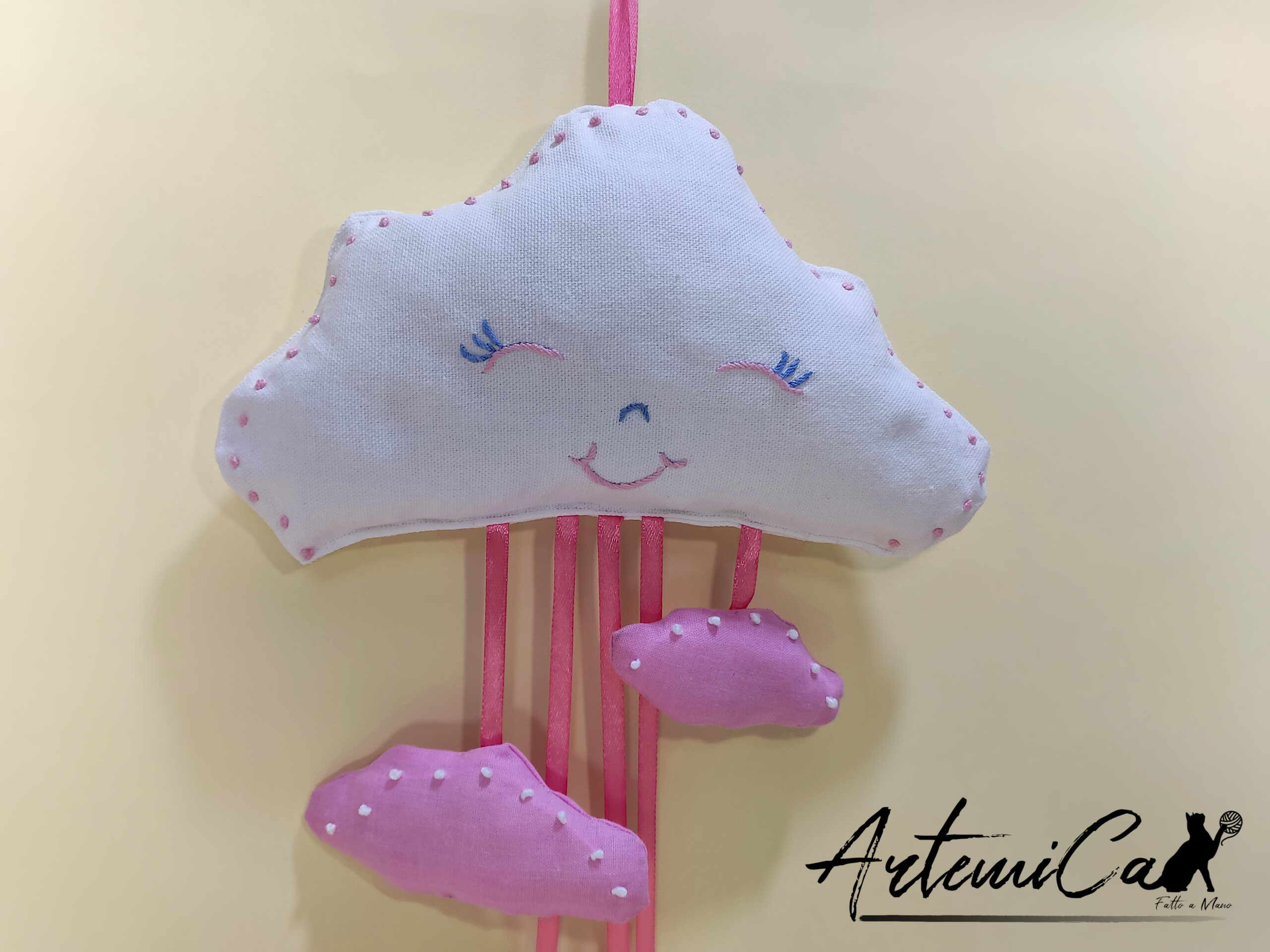 Nuvole in Festa non è solo un semplice fiocco nascita, ma un vero e proprio sogno ad occhi aperti. Le tre nuvolette tridimensionali, ricamate a mano con filati di altissima qualità, sono soffici come batuffoli di cotone e si rincorrono in un gioco di colori delicati. Il bianco candido e il rosa cipria o azzurro si fondono in un abbraccio cromatico che evoca la purezza e la dolcezza dell’infanzia.