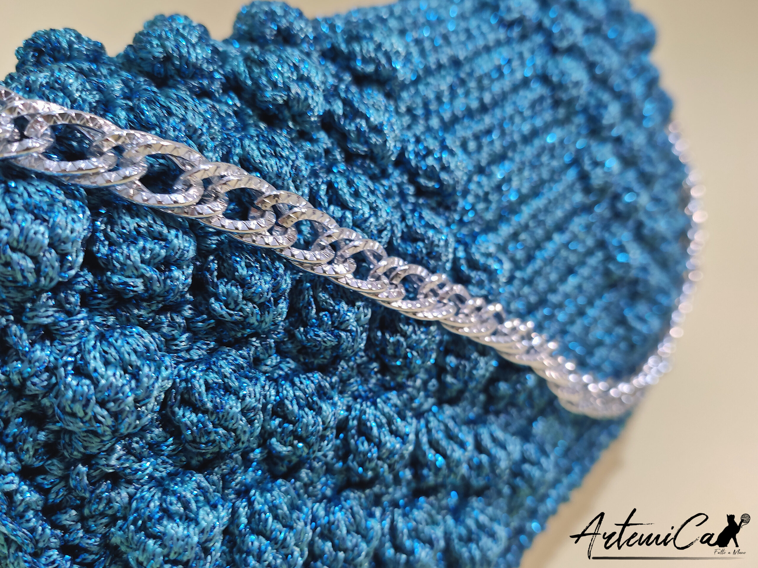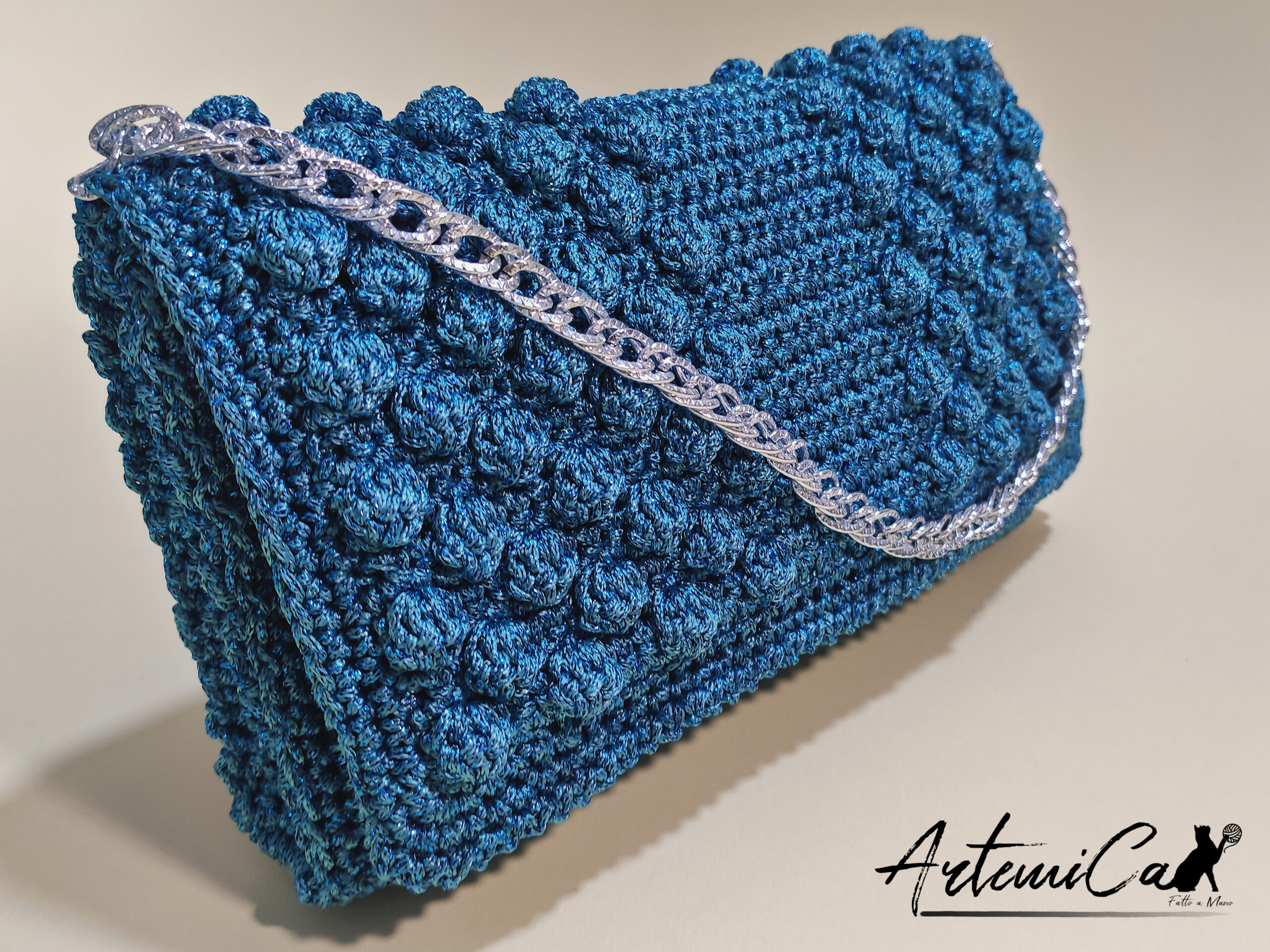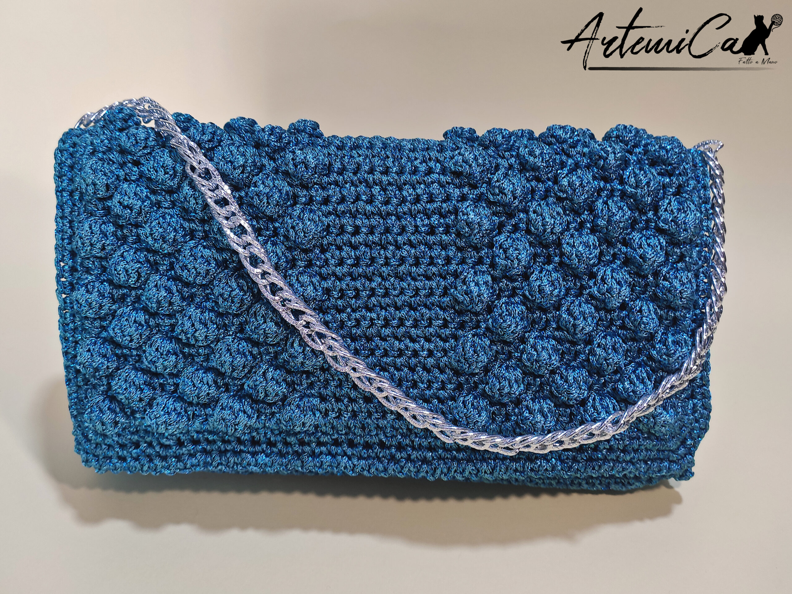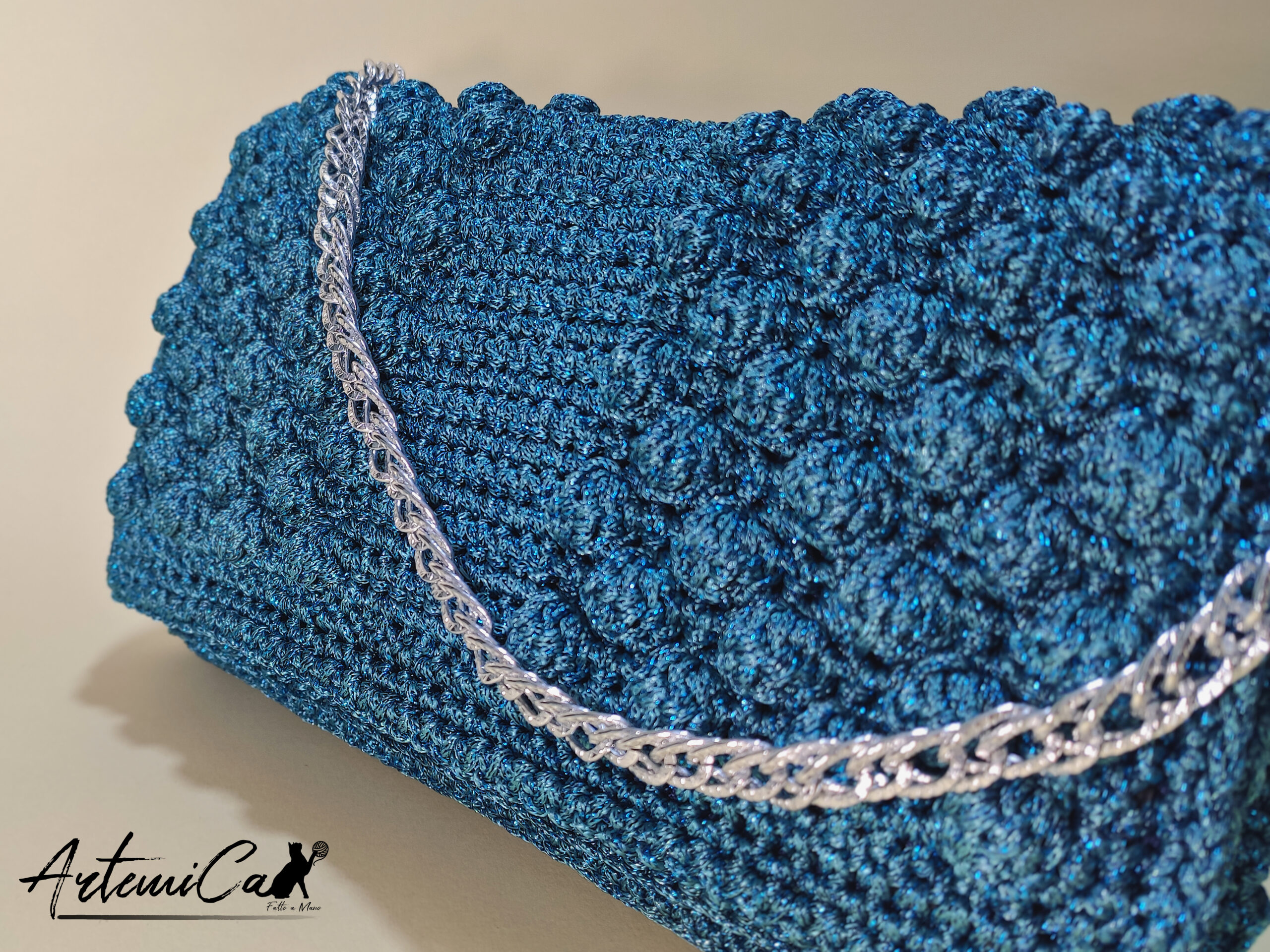 Il filato di alta qualità accarezza la tua pelle, mentre la lavorazione a mano crea un effetto trapuntato che esalta il colore blu petrolio. Un tocco di morbidezza che conquista al primo sguardo. La pochette misura 25×15 cm, una dimensione perfetta per portare con te l’essenziale senza rinunciare allo stile.