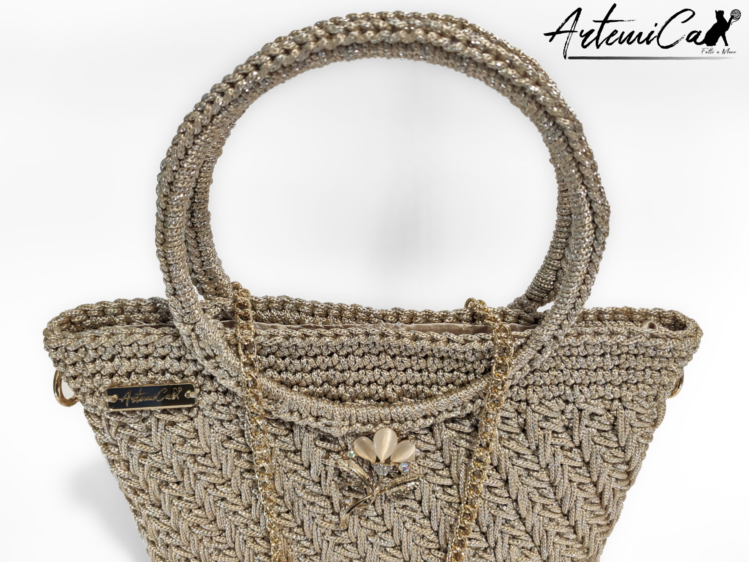 - Il manico rigido, sapientemente lavorato all’uncinetto, crea un elegante arco strutturato, che dona carattere e raffinatezza.