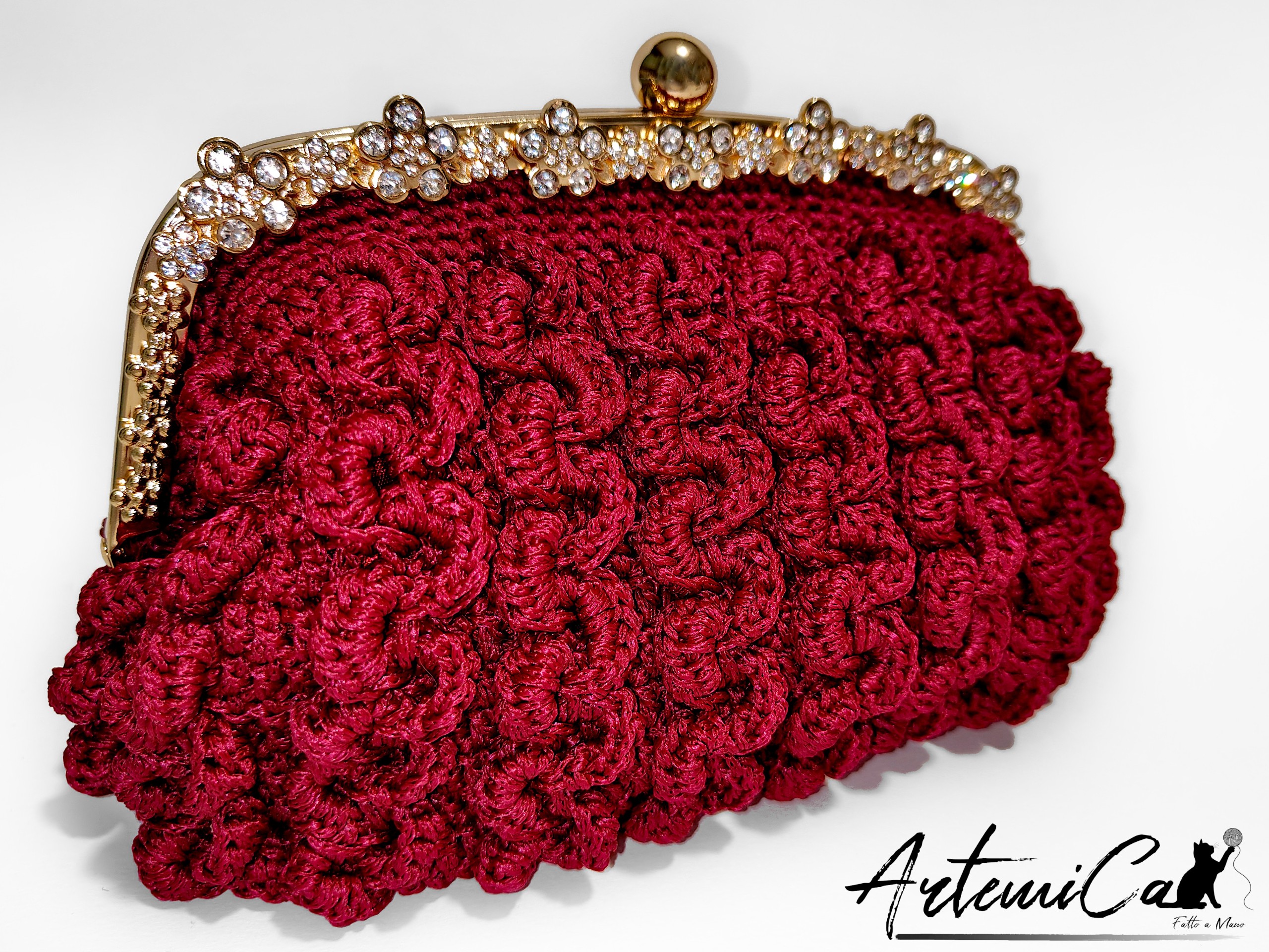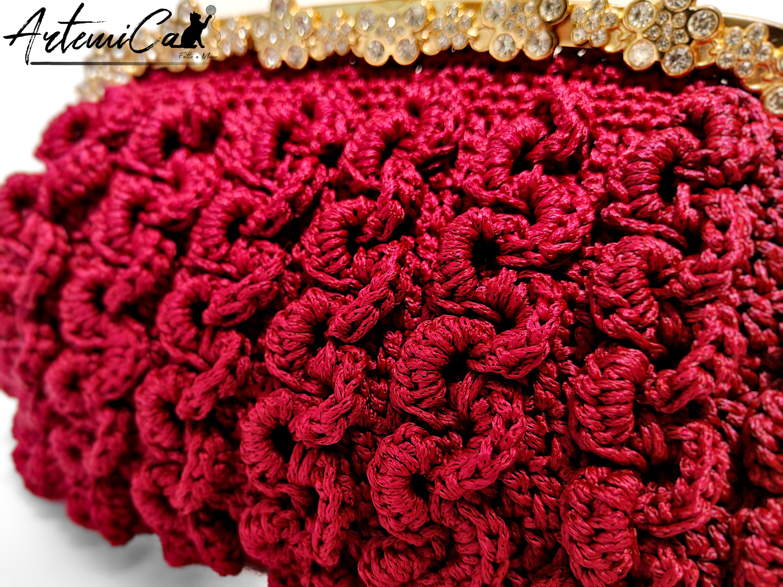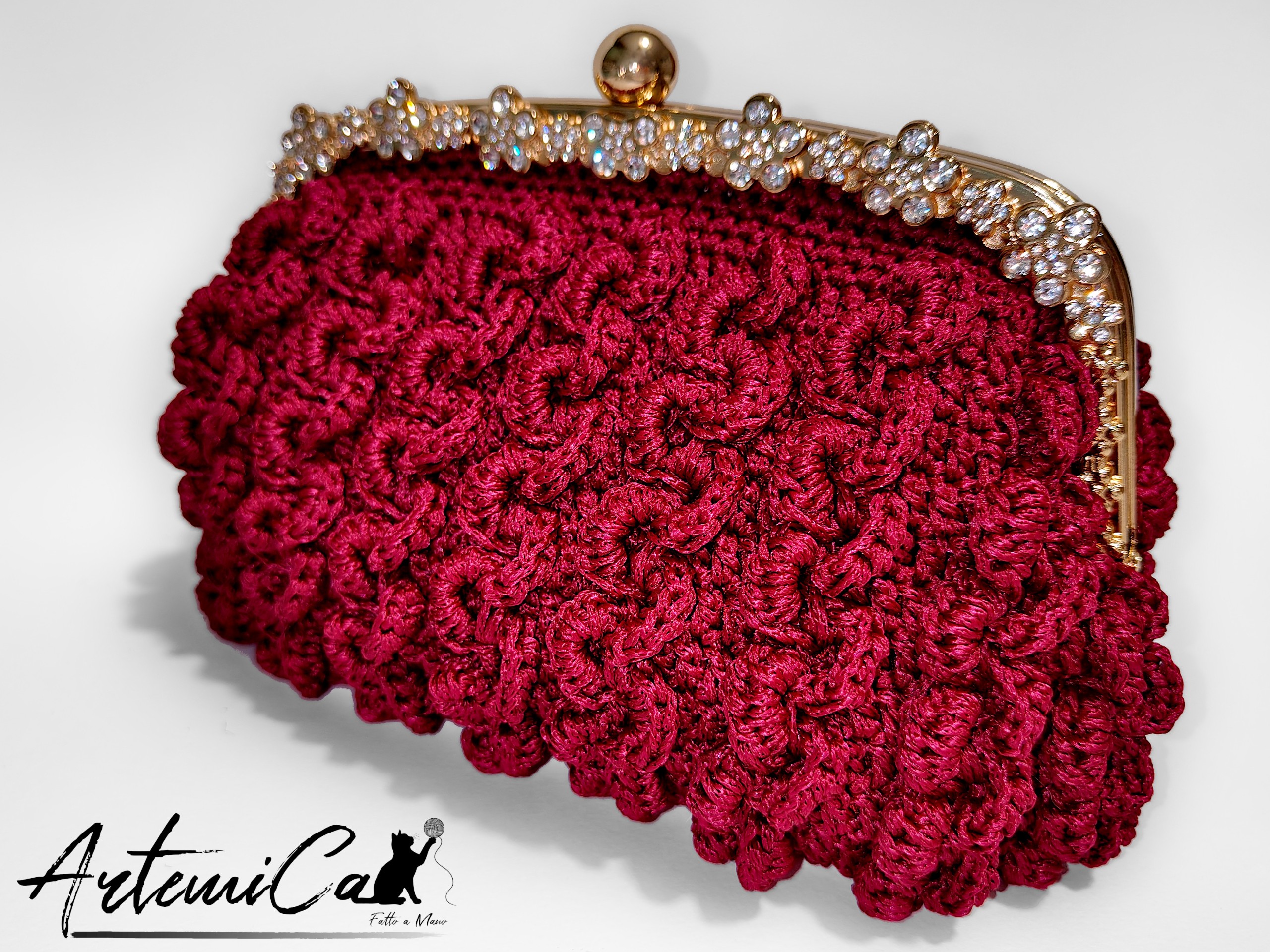 Capriccio Speziato è una pochette bordeaux in cordino fatta a mano, lavorata con un punto a rilievo che crea una trama morbida e vibrante, quasi una piccola architettura tessile. Il cordino dona consistenza e presenza, mentre la scelta cromatica – un bordeaux intenso e caldo – avvolge lo sguardo con eleganza naturale. Al tatto rivela subito la cura artigianale: ogni rilievo, ogni curva della trama trasmette la sensazione del fatto a mano autentico, con quelle micro-variazioni che rendono ogni pezzo davvero unico.