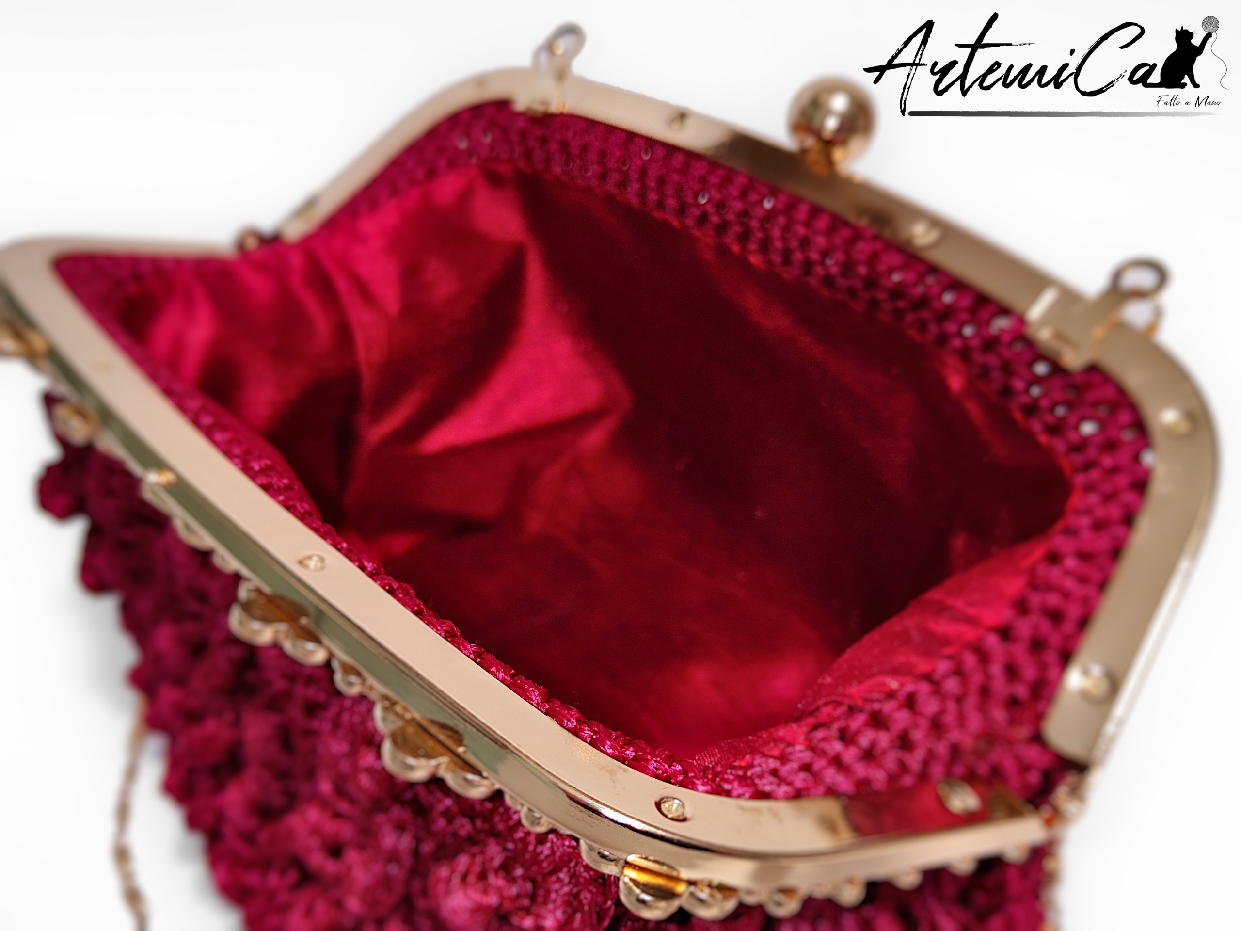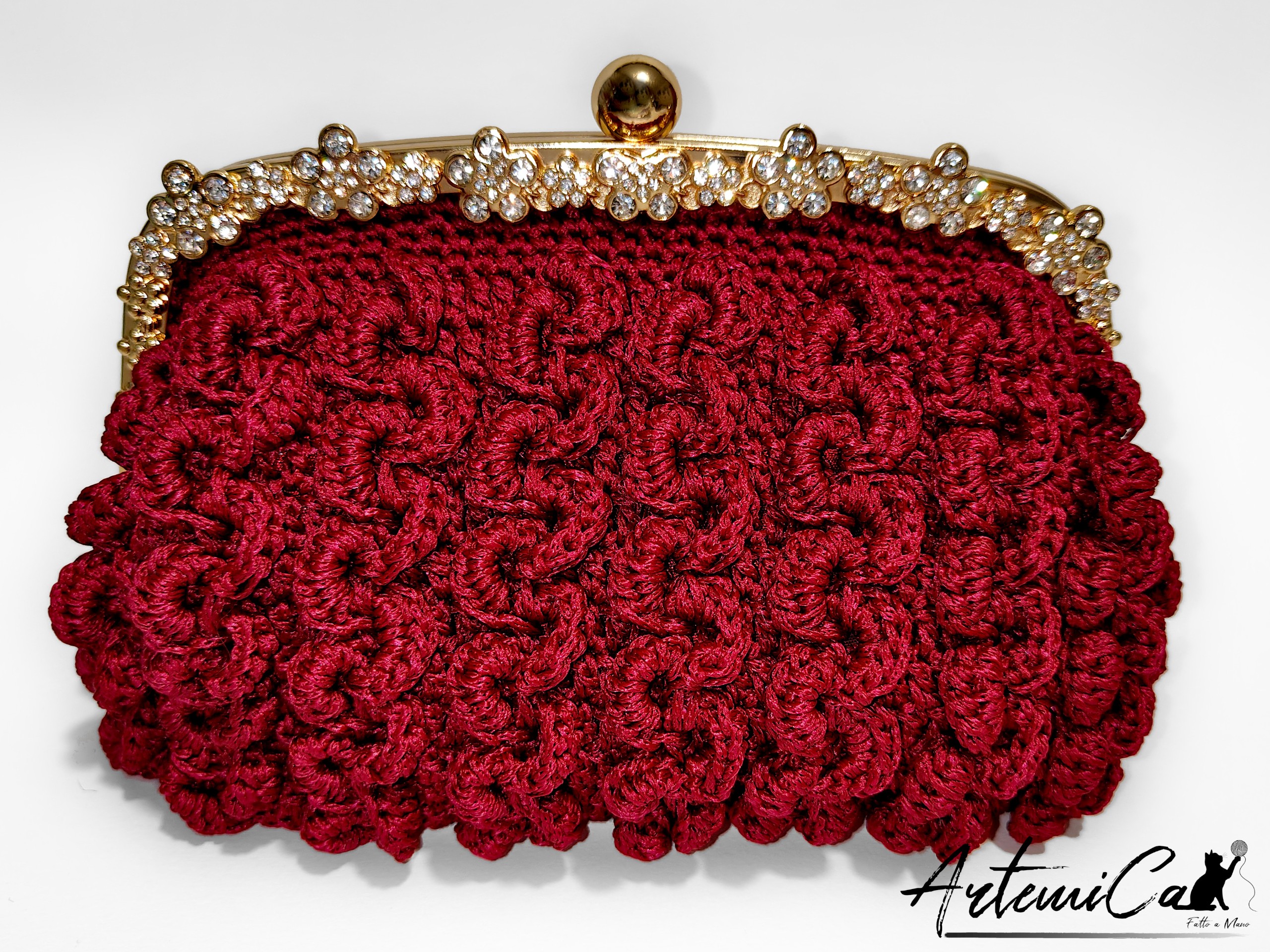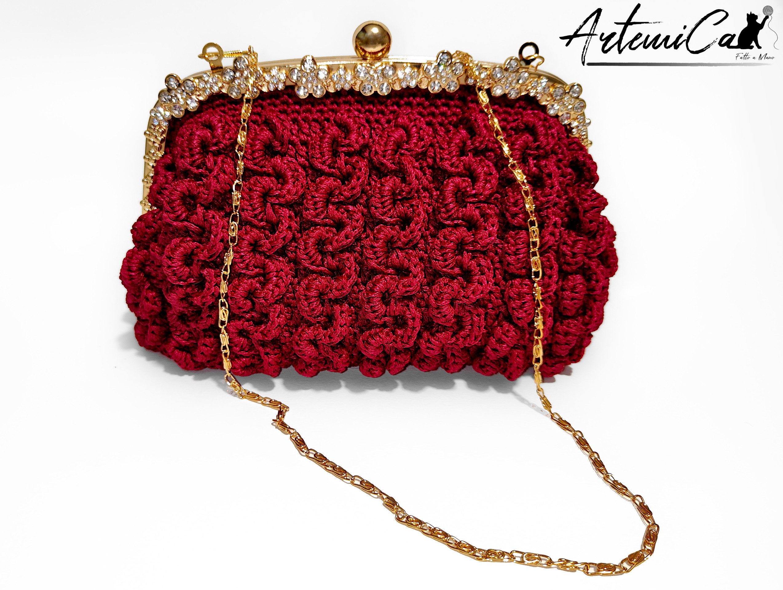 Capriccio Speziato è una pochette bordeaux in cordino fatta a mano, lavorata con un punto a rilievo che crea una trama morbida e vibrante, quasi una piccola architettura tessile. Il cordino dona consistenza e presenza, mentre la scelta cromatica – un bordeaux intenso e caldo – avvolge lo sguardo con eleganza naturale. Al tatto rivela subito la cura artigianale: ogni rilievo, ogni curva della trama trasmette la sensazione del fatto a mano autentico, con quelle micro-variazioni che rendono ogni pezzo davvero unico.