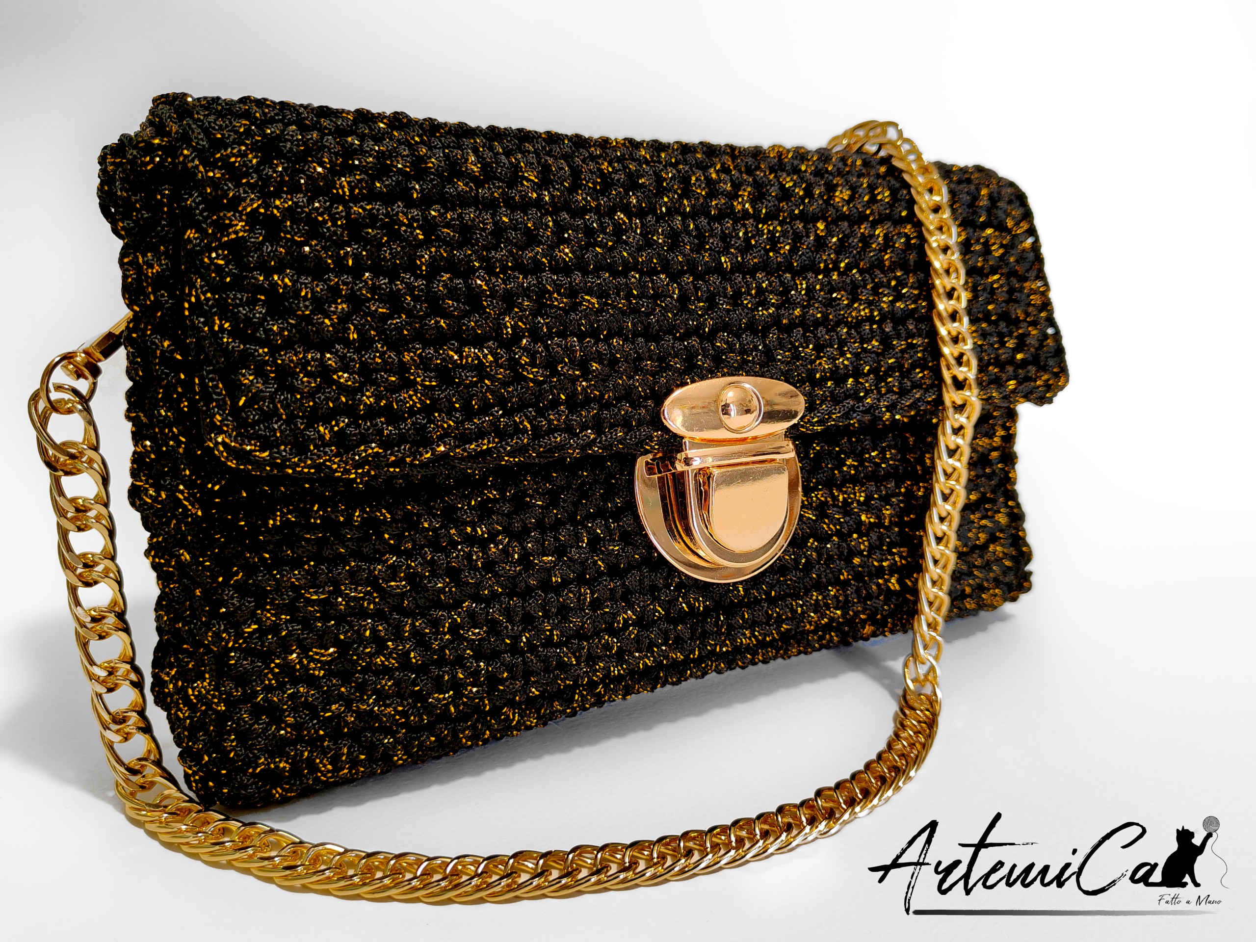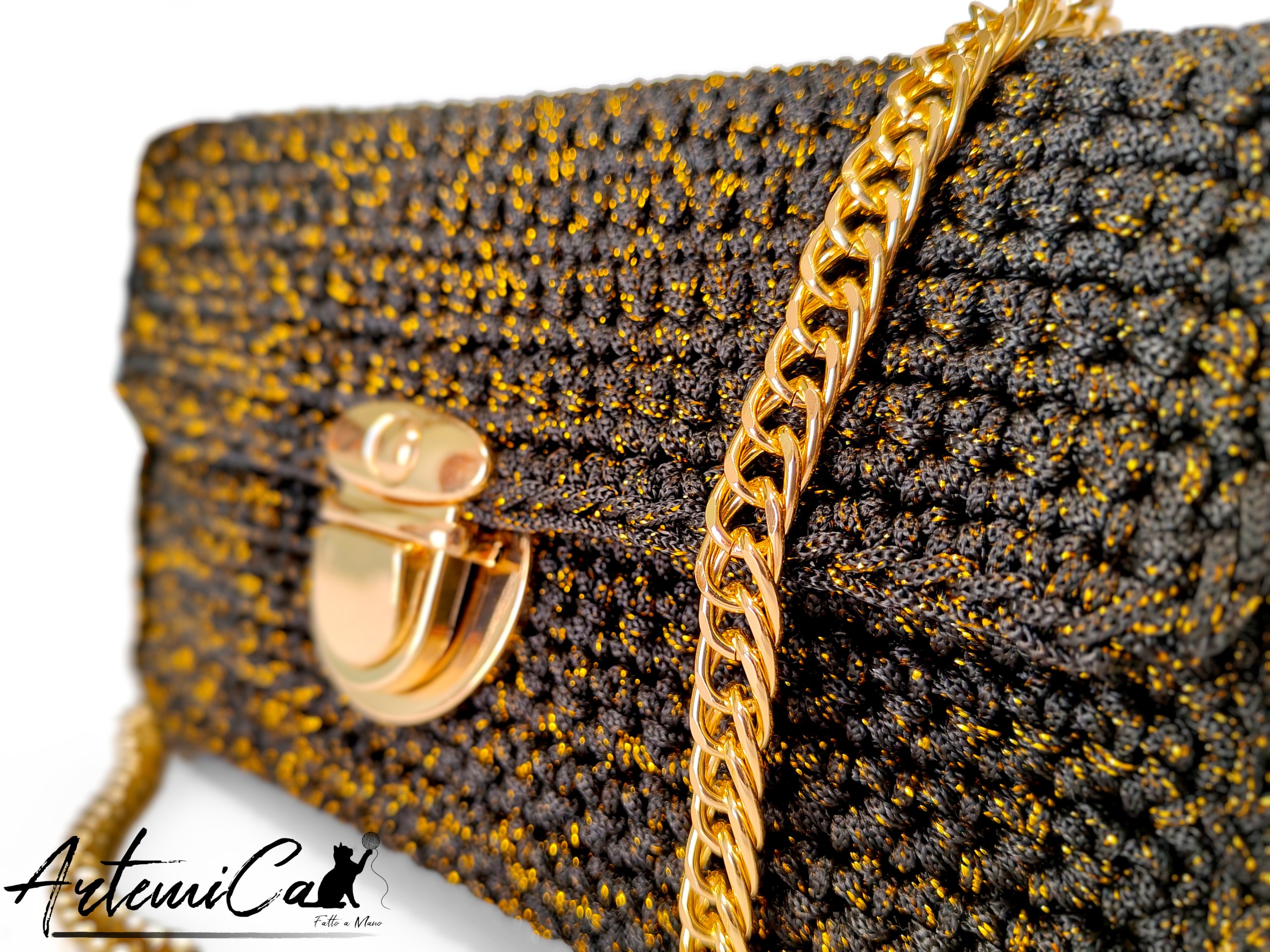 La Pochette Regina della Notte: Borsa fatta a mano all’Uncinetto nera elegante con dettagli oro è un piccolo viaggio visivo. Avvicinando lo sguardo al cordino, scopri una superficie viva: il nero profondo costruisce la base, mentre il lurex oro si intreccia come minuscoli lampi di luce che emergono a ogni movimento. La lavorazione a uncinetto, rigorosamente fatta a mano, dona una trama compatta, morbida e preziosamente irregolare — quella bella irregolarità che racconta del tempo, della cura e dell’attenzione di chi l’ha creata.