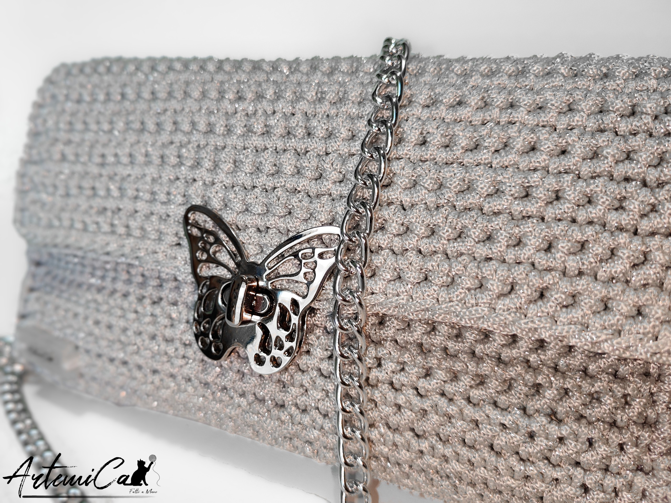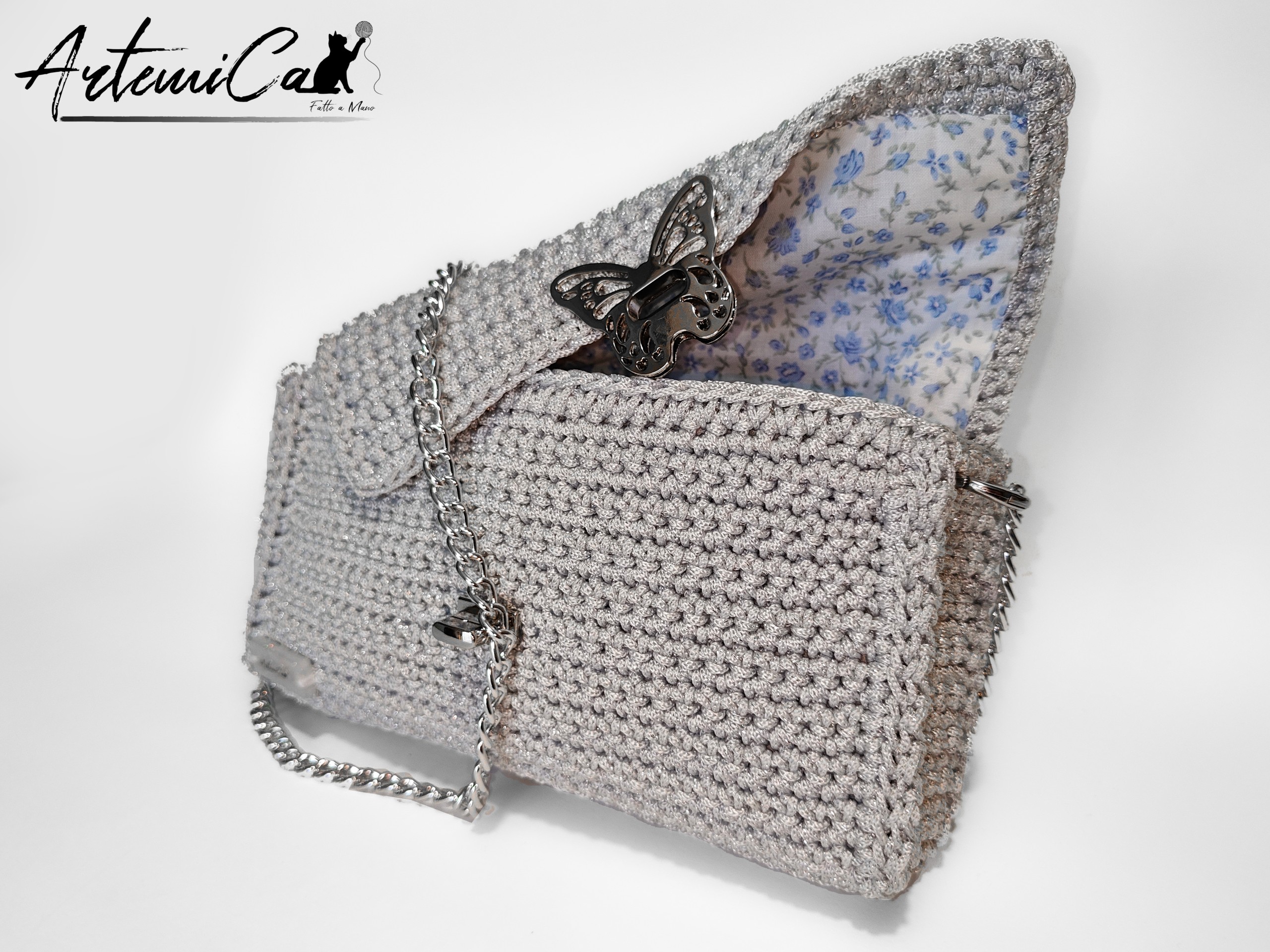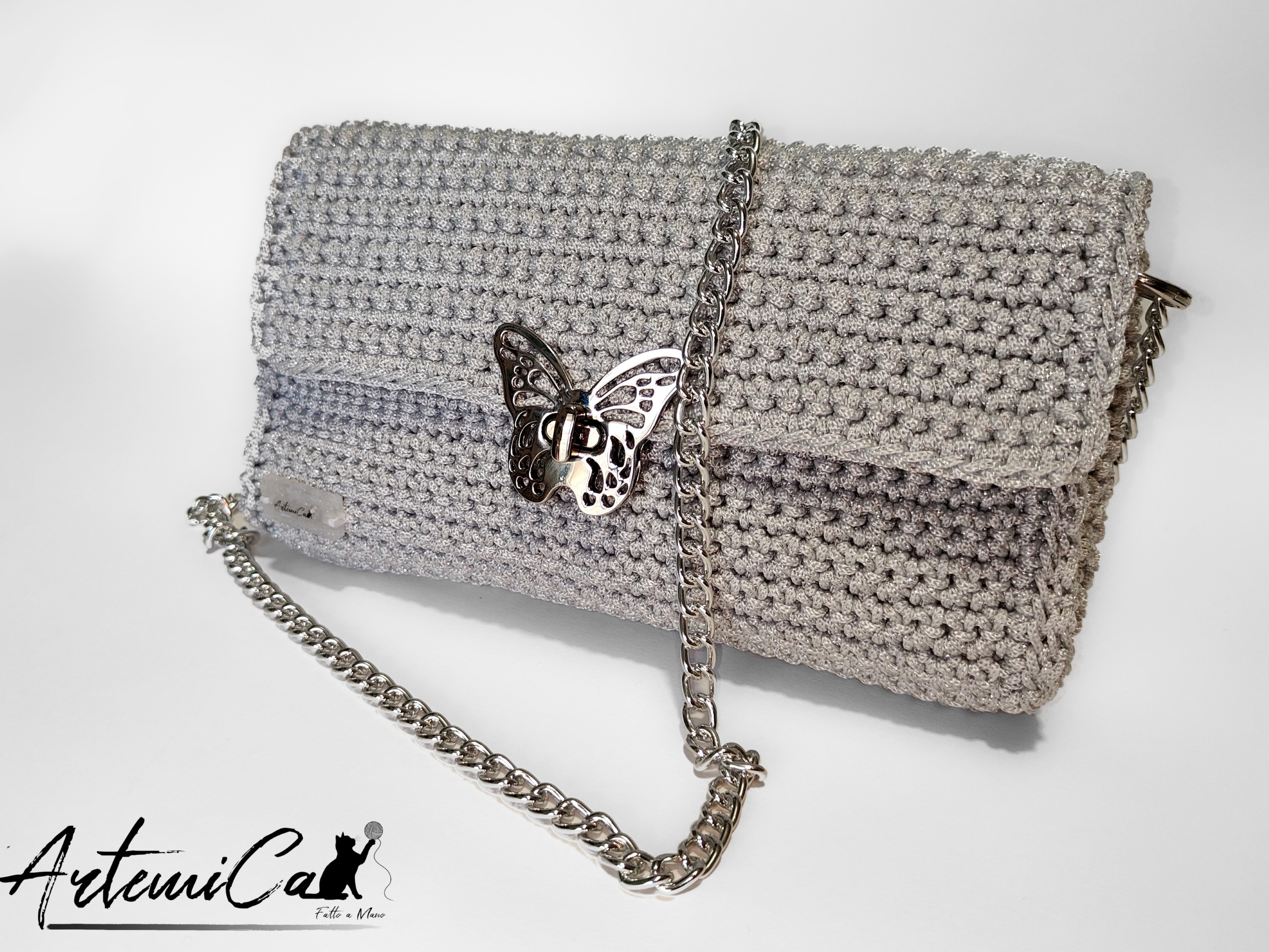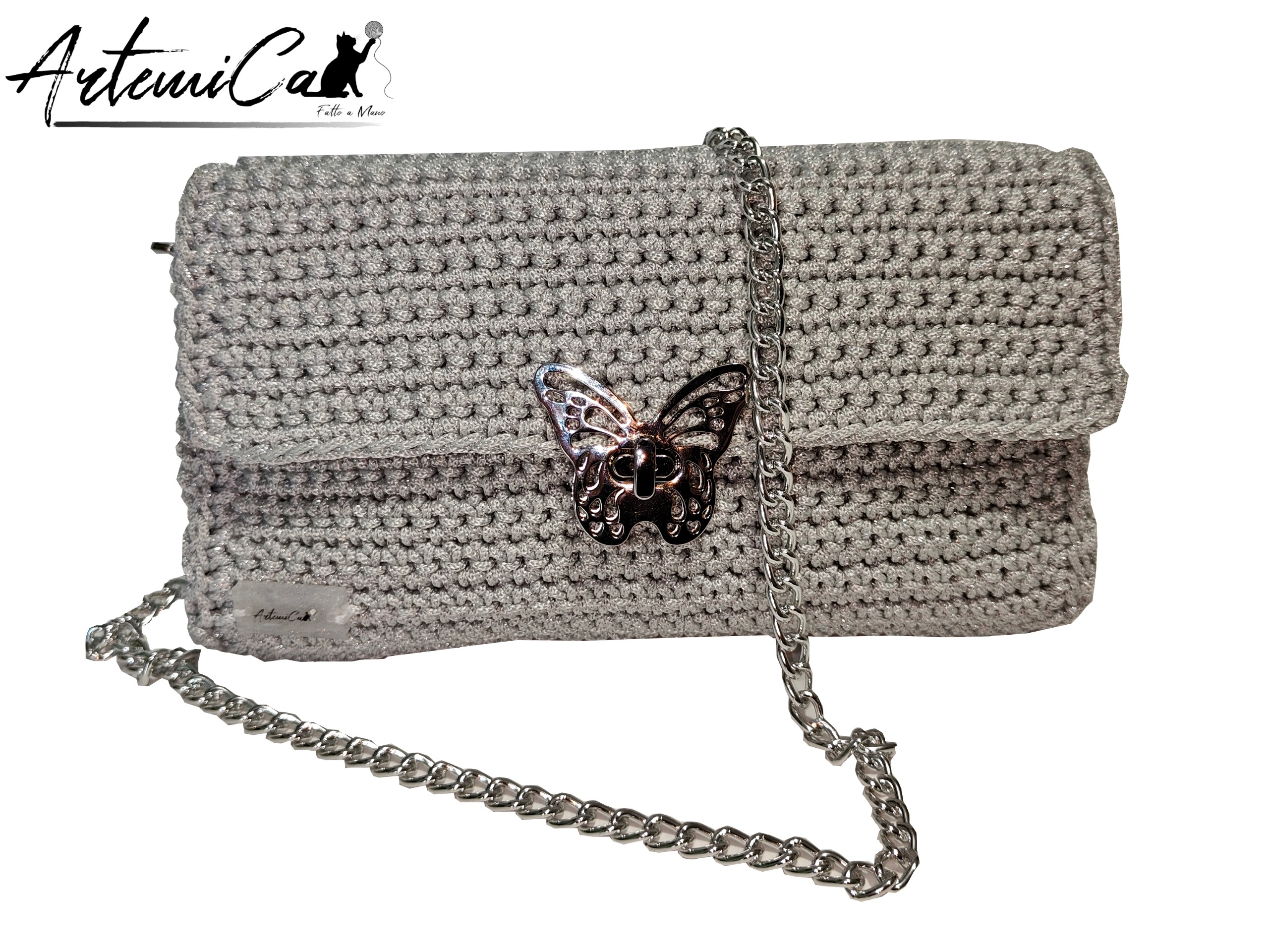 Il cuore pulsante del design è la chiusura a clip a forma di farfalla, in metallo argentato lucido, finemente lavorata: un piccolo gioiello che unisce funzionalità e poesia. La tracolla in catena metallica argentata, lunga 110 cm, completa il look con un tocco moderno, rendendola perfetta anche come mini bag da sera.