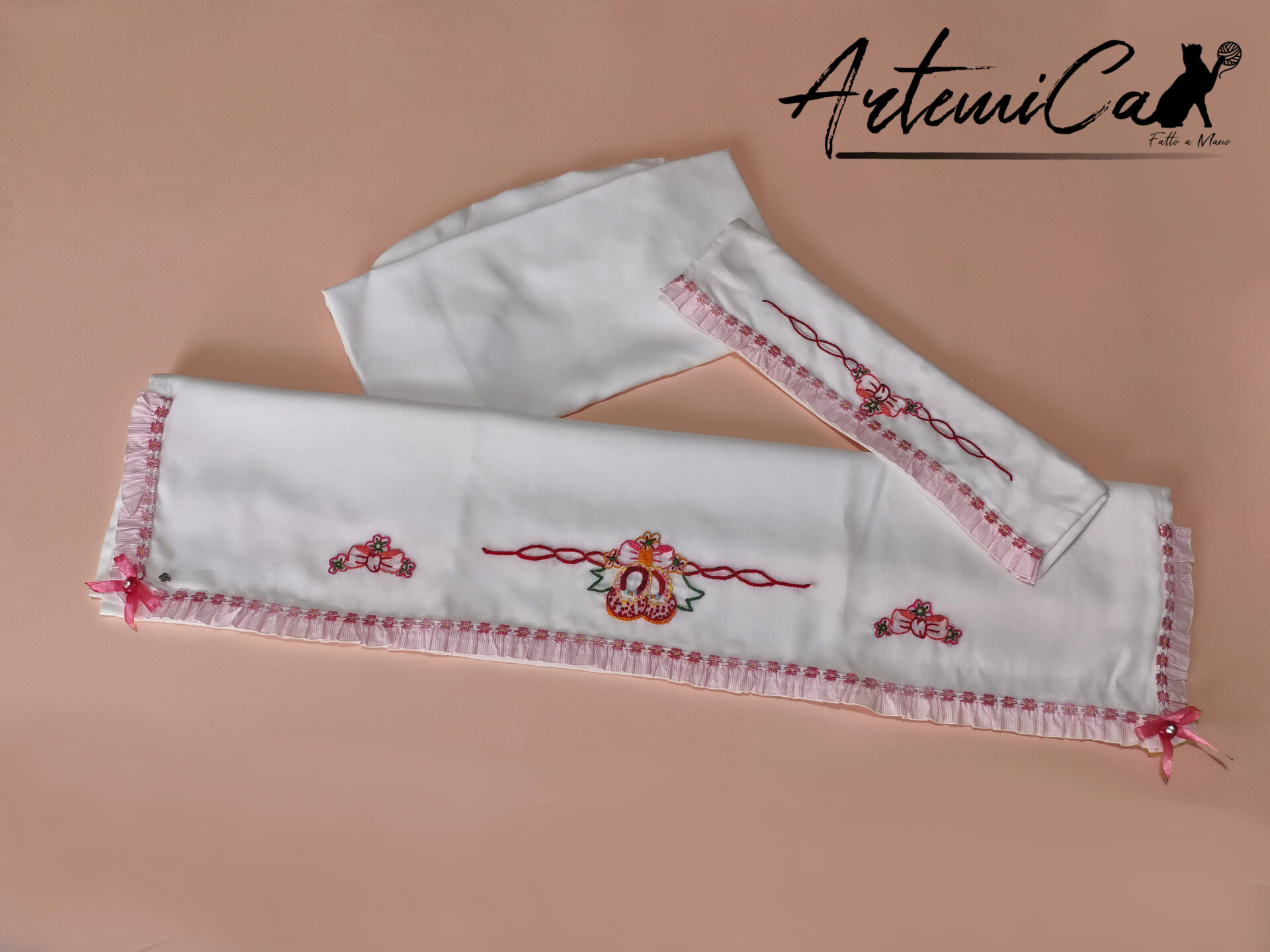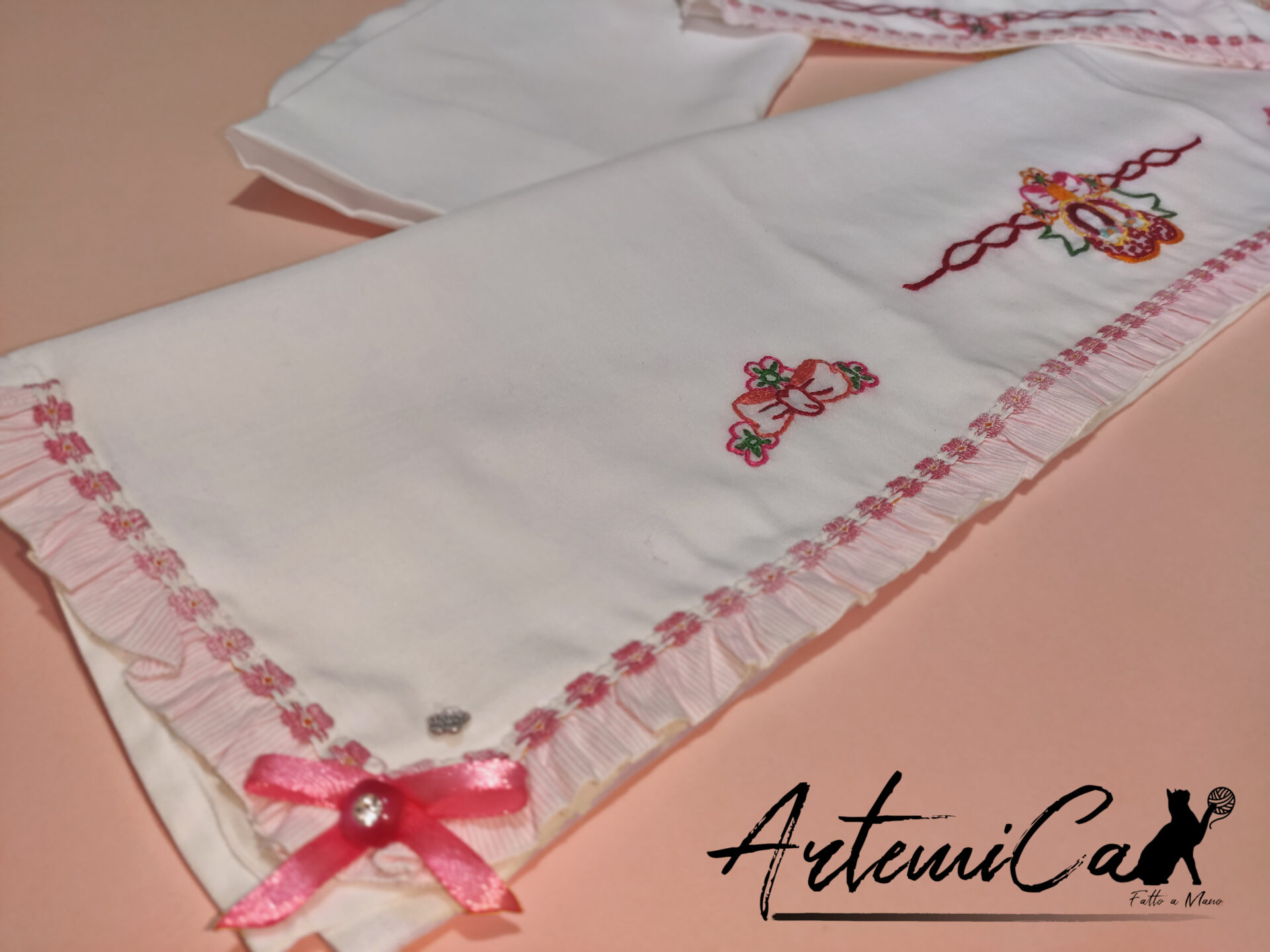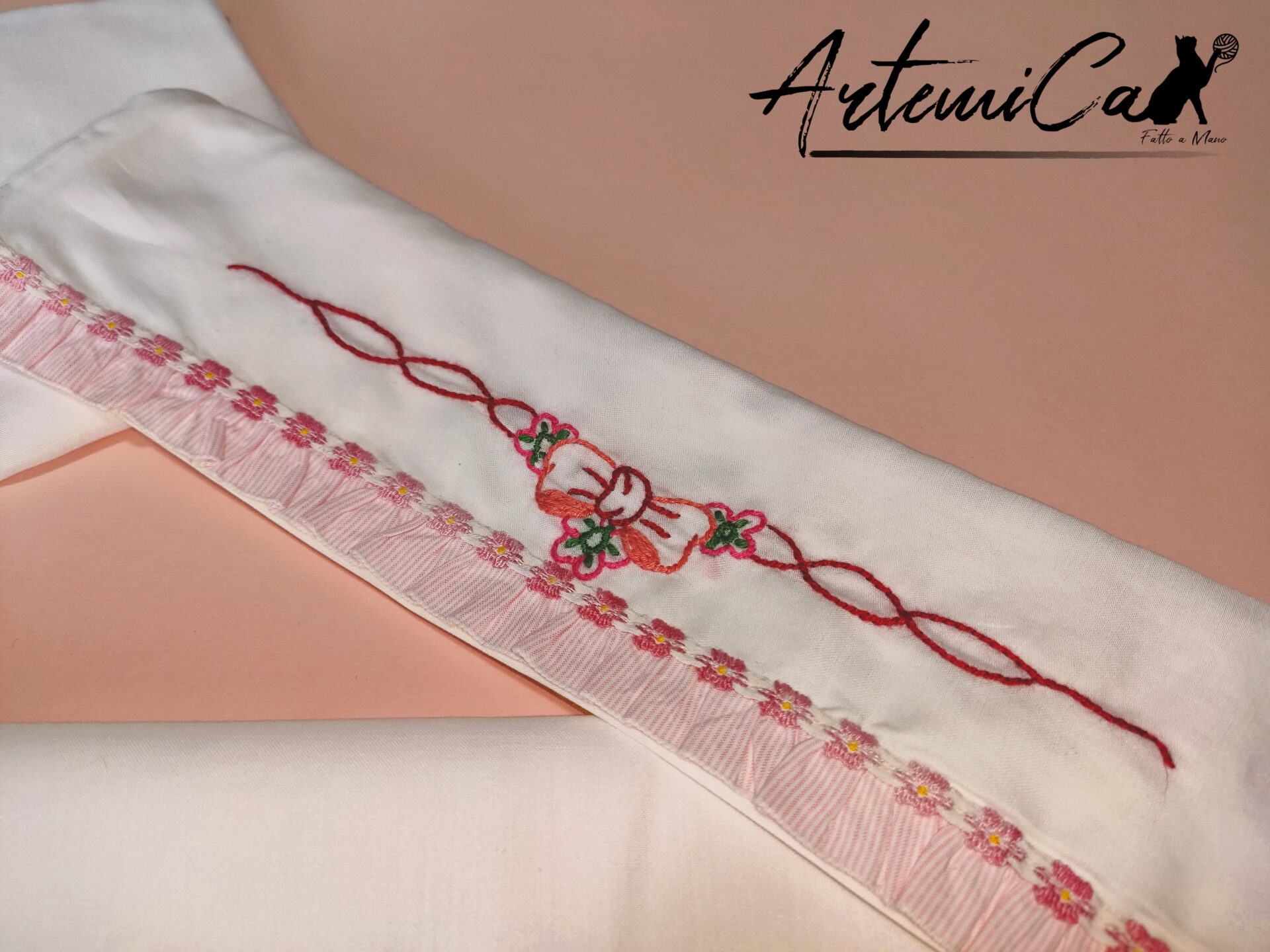 Ma ciรฒ che rende questo set di lenzuola davvero unico sono i dettagli raffinati. La passamaneria rosa, con i suoi delicati ornamenti floreali rossi, conferisce un tocco di eleganza e romanticismo al set. Questo prezioso bordino volant aggiunge un elemento di grazia e raffinatezza alle lenzuola, rendendo ogni istante trascorso nel lettino del vostro bambino un’esperienza di puro incanto.