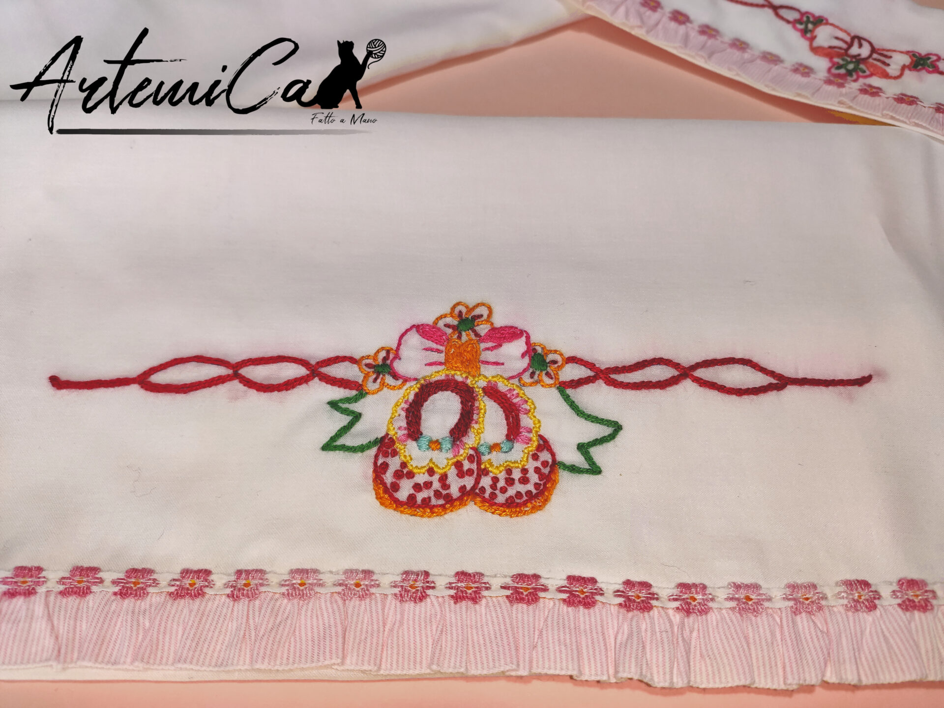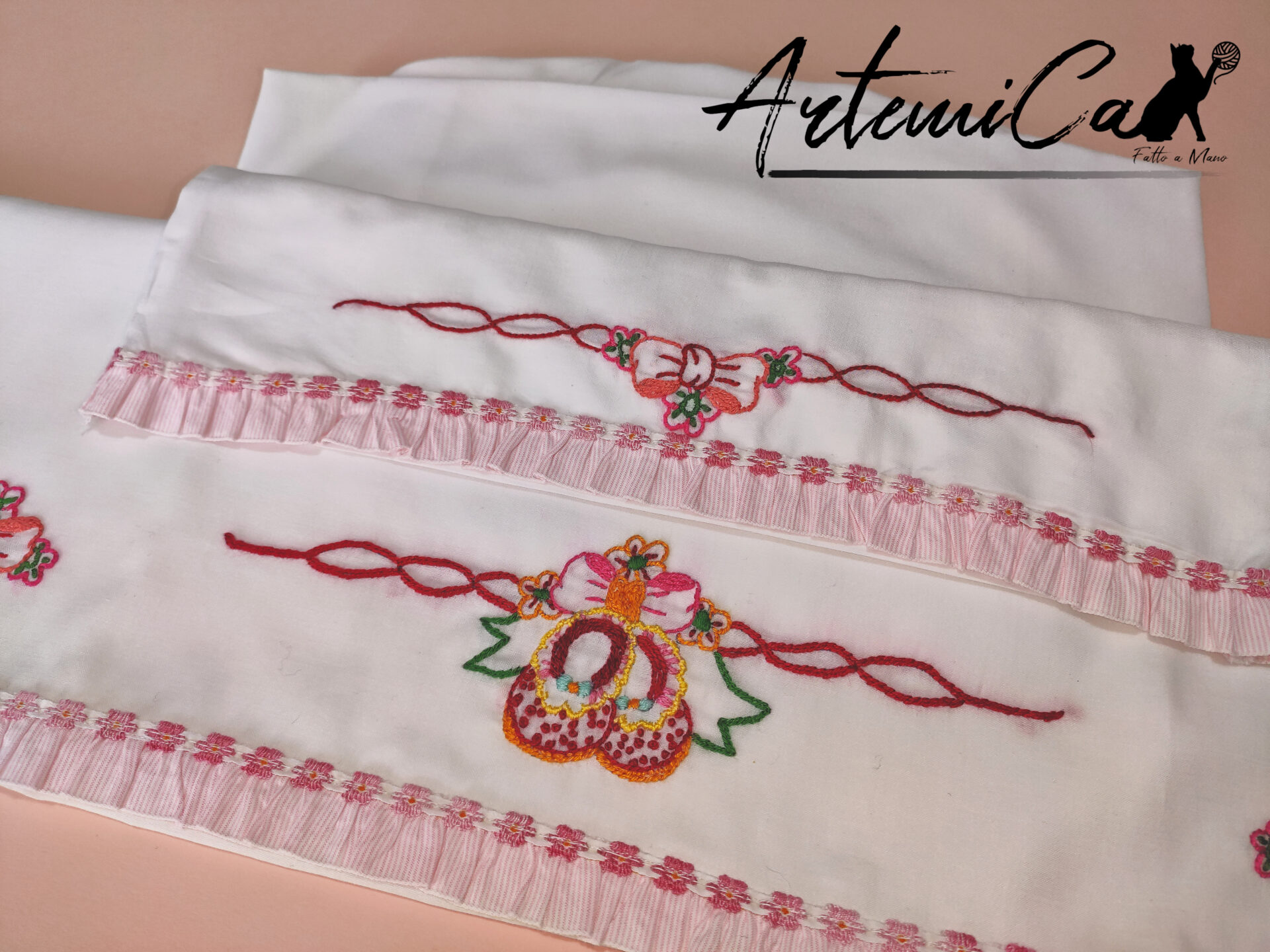 Il nostro set di lenzuola ricamate a mano in cotone per carrozzina รจ un vero e proprio sogno che si avvera per ogni mamma e papร . Il design principale รจ un incantevole paio di scarpette rosse e nastri, che trasmettono un senso di gioia e allegria. Questo motivo ricamato con maestria cattura lo sguardo e aggiunge un tocco di dolcezza al lettino del vostro piccolo.