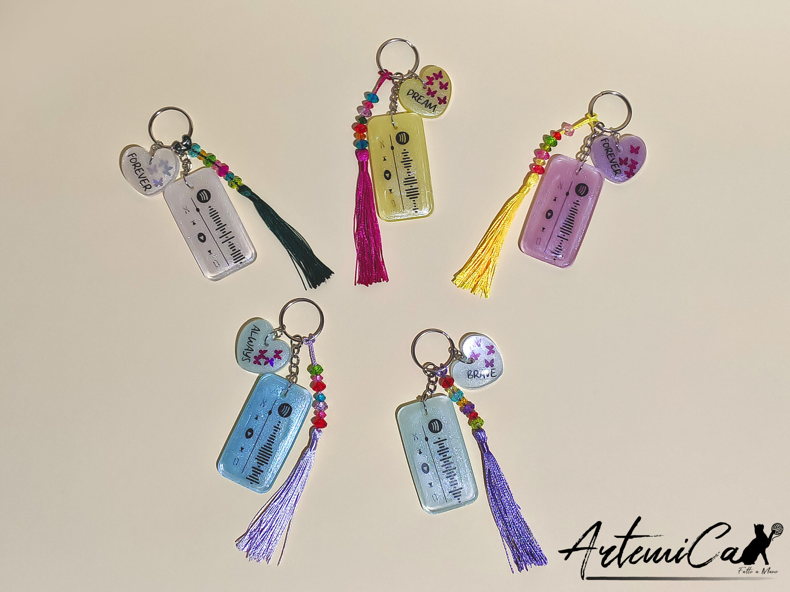Il Portachiavi MySong รจ completamente personalizzabile in ogni suo aspetto. Puoi scegliere il colore della resina che meglio si abbina al tuo stile, la parola che incarna il tuo spirito, e naturalmente, la canzone che desideri portare sempre con te. Dopo l’acquisto, verrai ricontattato per definire insieme ogni dettaglio, assicurandoci che il portachiavi rispecchi esattamente i tuoi desideri. Il portachiavi personalizzato Spotify non รจ solo un oggetto, ma una piccola, grande espressione di te stesso, un ricordo tangibile che ti accompagna in ogni momento della giornata, pronto a raccontare la tua storia e a ispirarti lungo il cammino. Un regalo perfetto per te o per chi vuoi sorprendere con qualcosa di davvero unico e significativo.