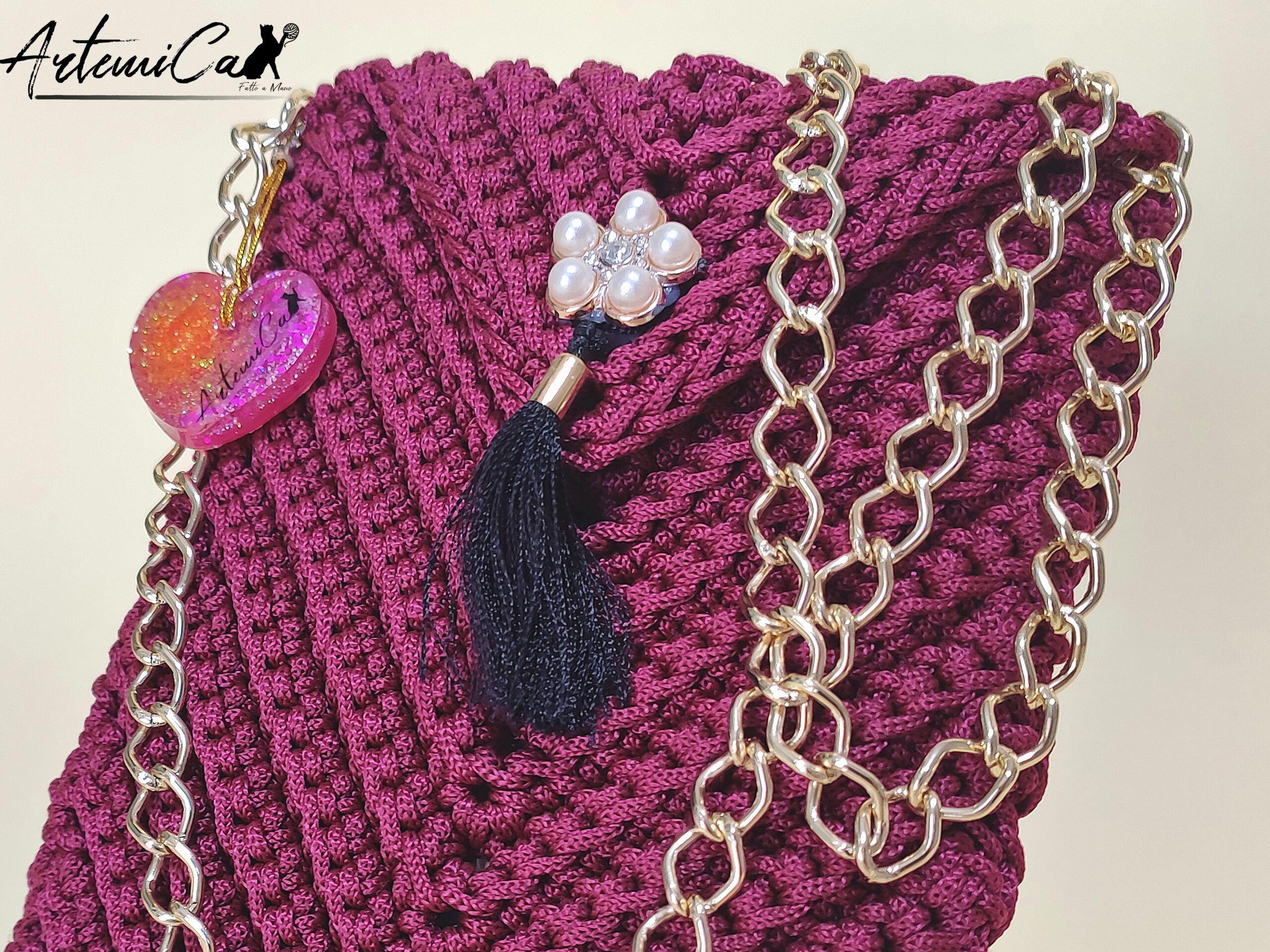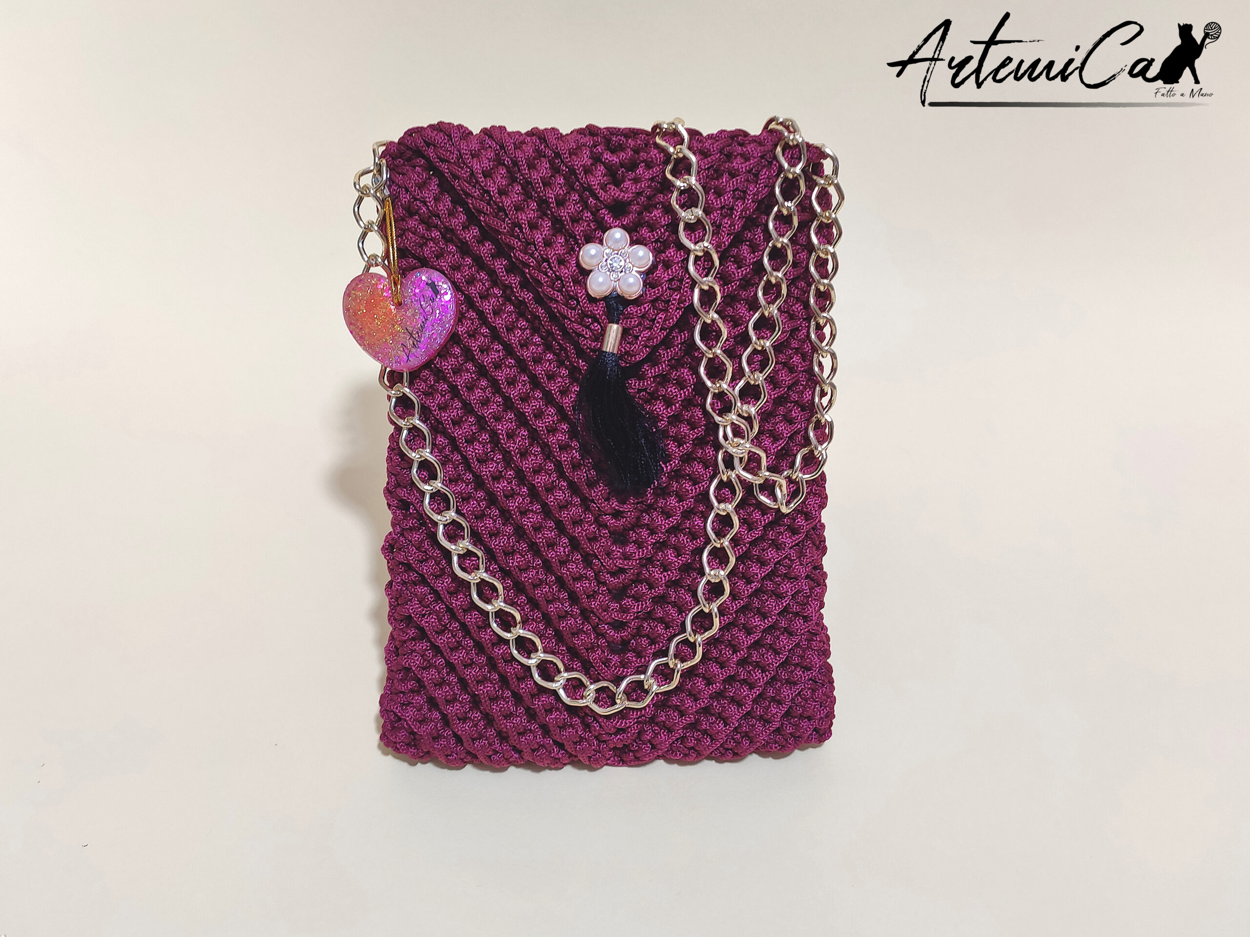 Il “Riflessi Bordeaux” non è solo un portacellulare; è un vero capolavoro artigianale all’uncinetto che racconta una storia di stile e cura dei dettagli. Con le sue dimensioni di 14×19 cm, si adatta perfettamente a ogni smartphone, abbracciandolo con la sua eleganza. L’accostamento dei colori è pensato per affascinare: il ricco bordeaux del cordino all’uncinetto evoca una sensazione di calore e raffinatezza, mentre il pompon nero aggiunge un tocco di mistero e divertimento. Sotto il delicato fiore di perle, che sprigiona una grazia senza tempo, si nasconde una chiusura magnetica sicura ma discreta. La lunga catena dorata, con il suo scintillio delicato, è perfetta per chi ama avere le mani libere ma non vuole rinunciare a un tocco glamour. E come dimenticare il ciondolo a forma di cuore rosa, con i suoi dettagli brillanti che catturano la luce e l’attenzione. Un piccolo tesoro da portare sempre con sé, che riflette la tua personalità luminosa e sofisticata.