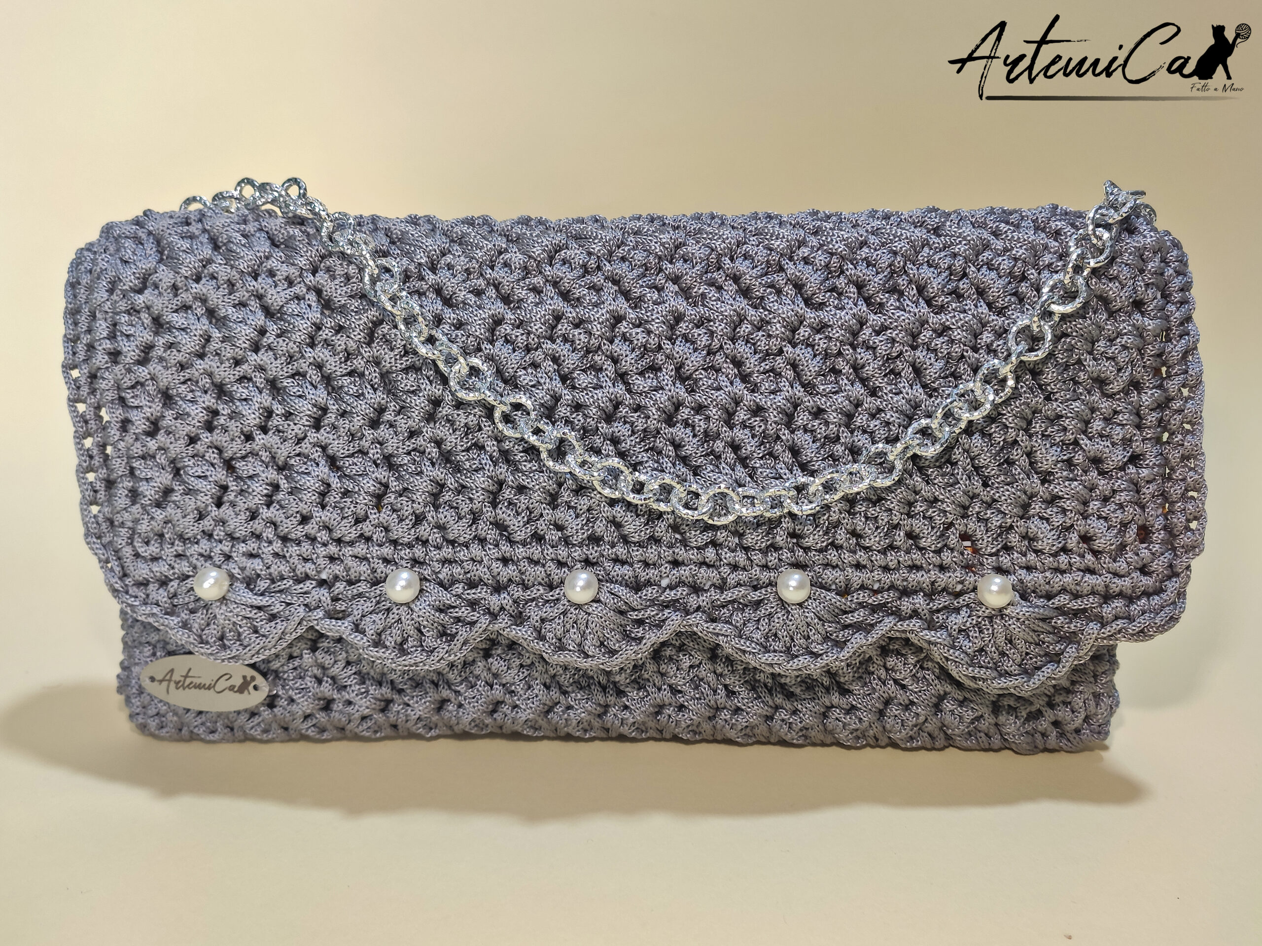 Sospiro di Perla non รจ solo un semplice accessorio, ma un vero e proprio capolavoro di artigianalitร . La sua lavorazione all’uncinetto, frutto di un’attenta e paziente dedizione, valorizza le qualitร del filato di pregio, donando vita a una texture morbida e piacevole al tatto. La patella frontale presenta un’accurata decorazione a ventaglietto con perle applicate a mano, una a una, con minuziosa precisione. Le perle, di una delicata tonalitร bianco perla, creano un motivo di grande fascino e luminositร , che cattura lo sguardo e conquista l’ammirazione. Il manico in argento martellato si distingue per la sua superficie irregolare che crea giochi di luce e aggiunge un tocco di modernitร al design.