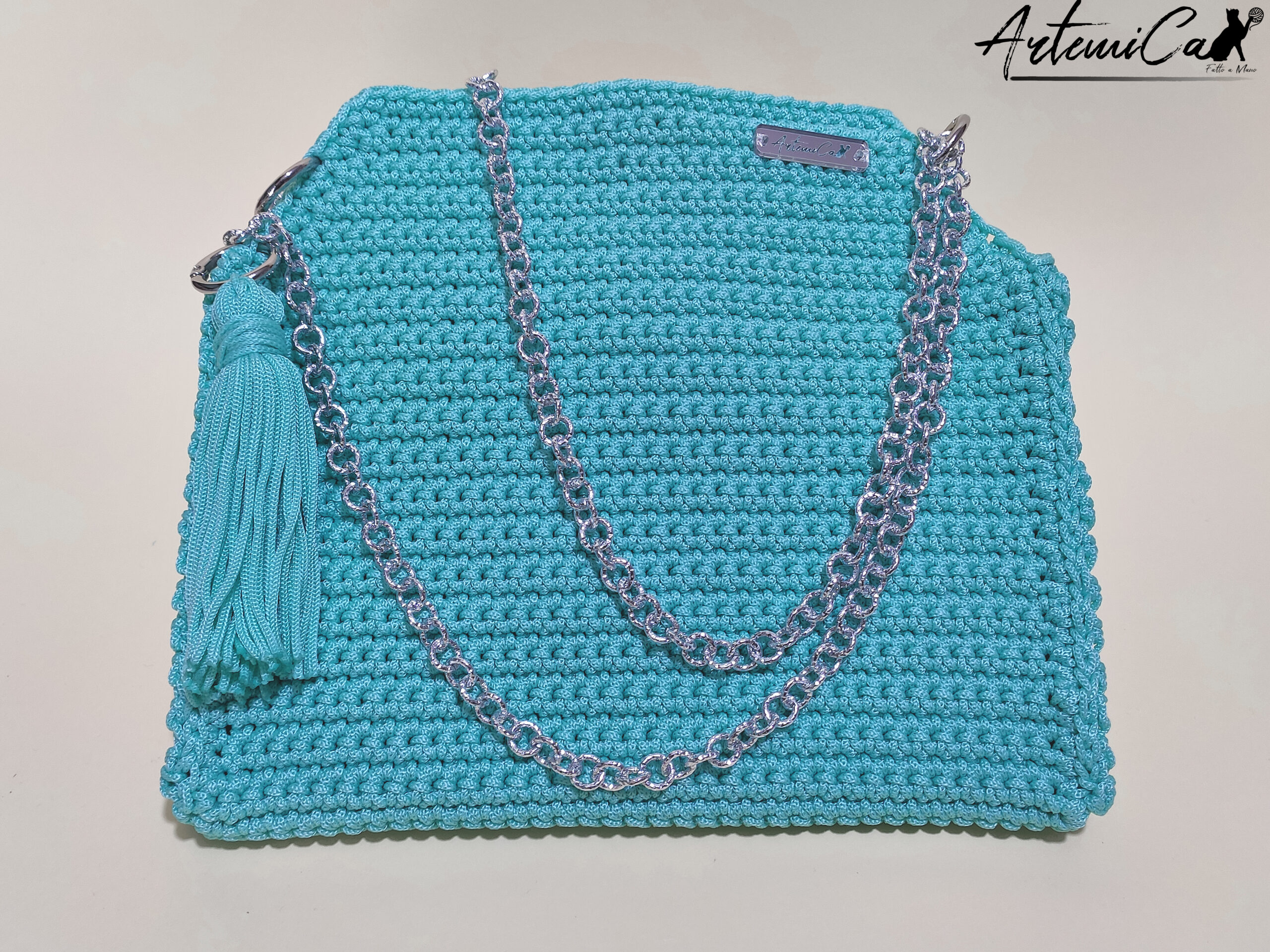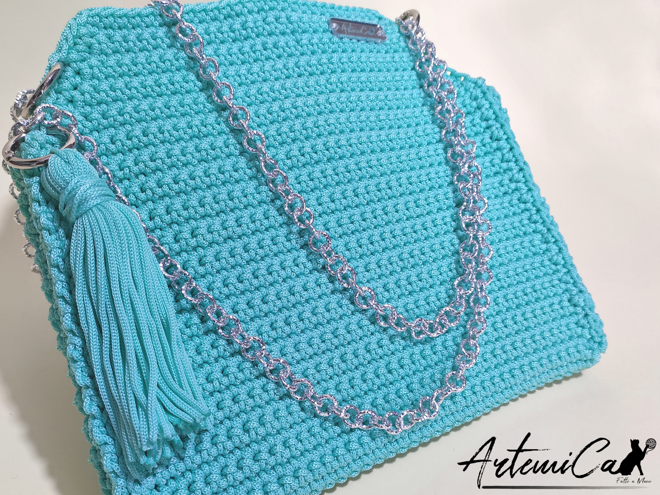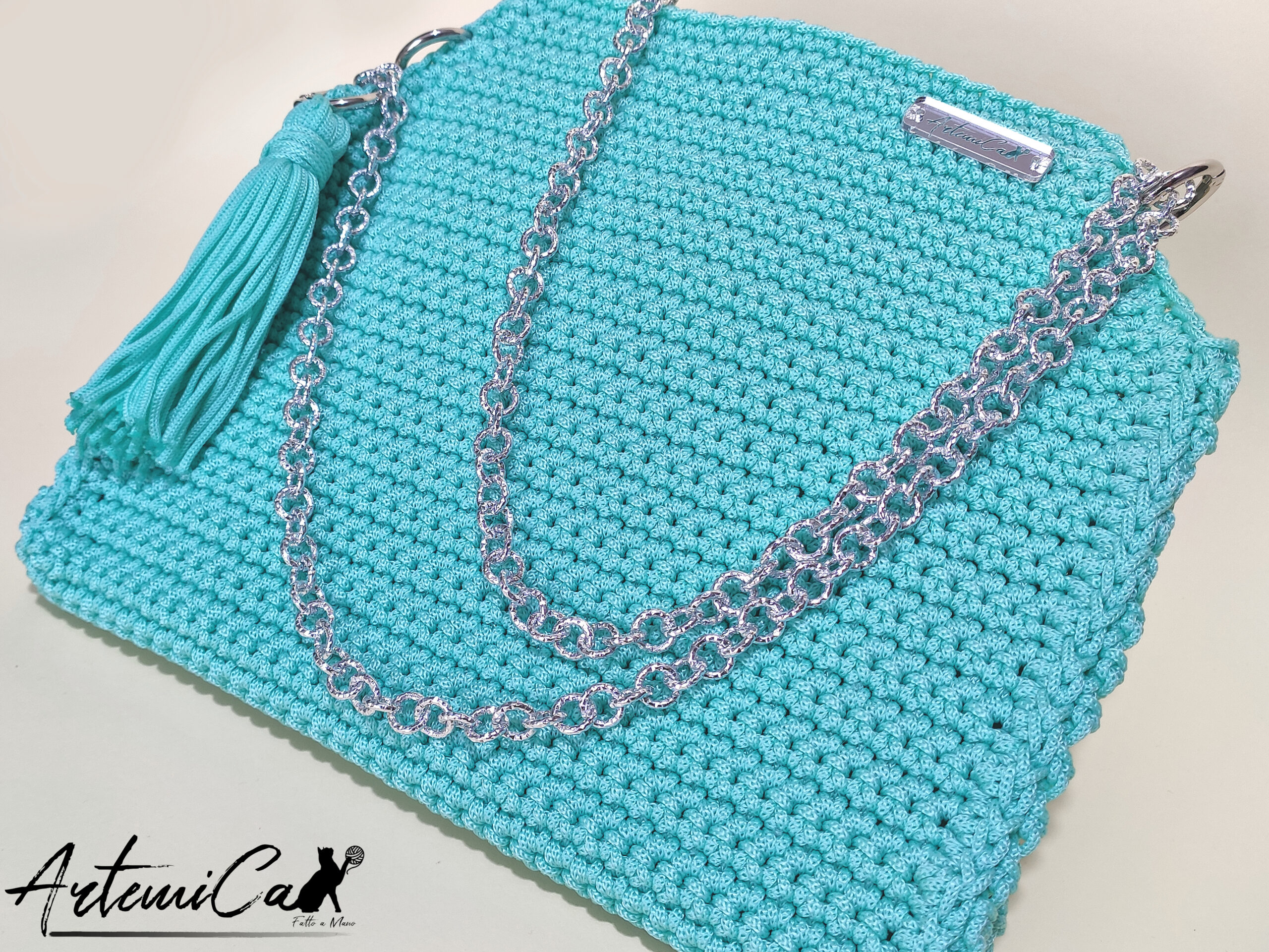 Scopri la magia di una creazione che fonde l’arte dell’uncinetto con il glamour moderno: la Tiffany Glow è un trionfo di eleganza e maestria artigianale, ispirata alla celebre Falabella di Stella McCartney. Realizzata a mano con una fettuccia color tiffany, questa clutch è un’opera d’arte che gioca con la luce e il colore, regalando a chi la indossa una sofisticata aura di classe. Il vivace tono tiffany è avvolgente e rinfrescante, un’onda di colore che cattura l’occhio e solleva l’umore. Ogni punto dell’uncinetto è stato intrecciato con passione e precisione, creando una texture ricca e avvolgente che si fa notare senza essere invadente.