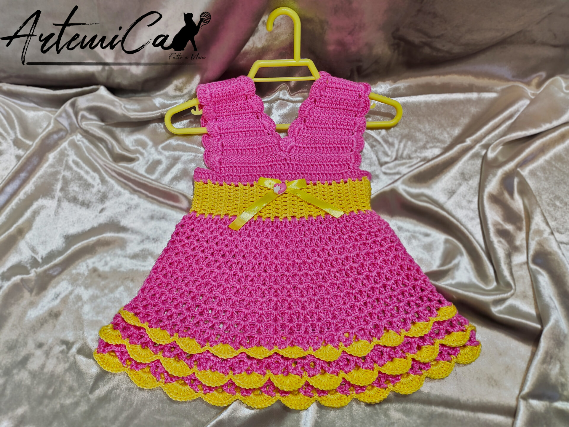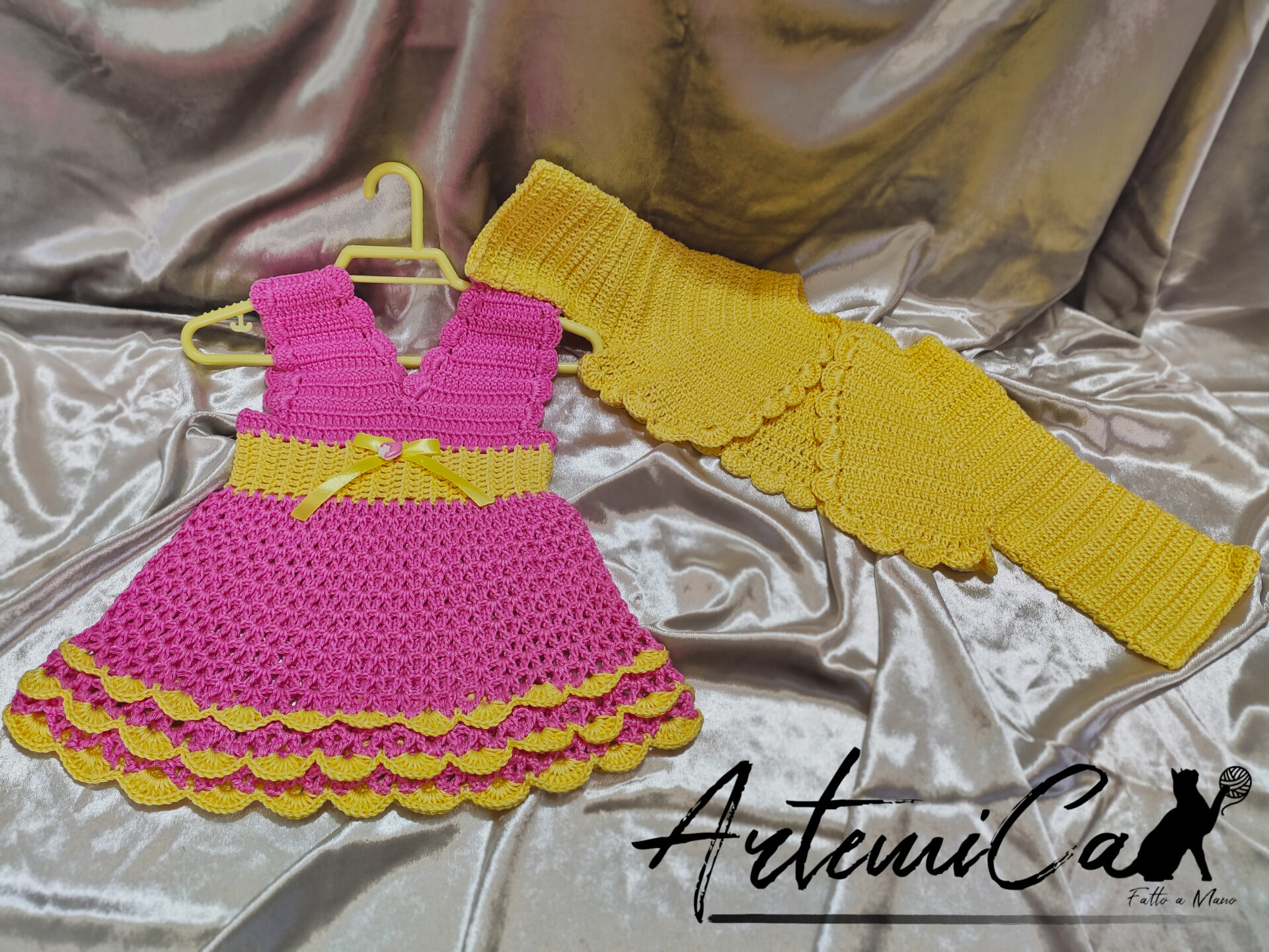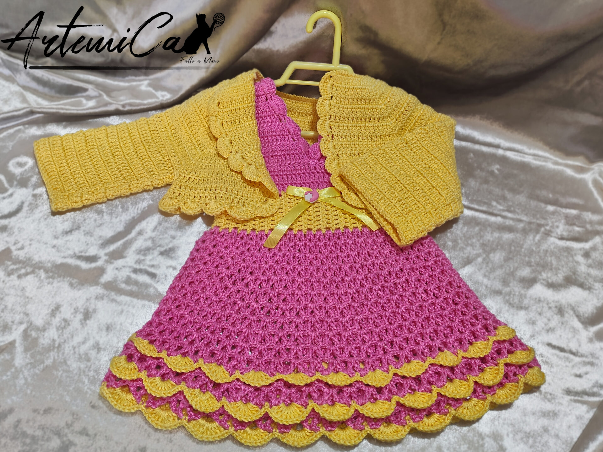 Questo vestitino giallo e fucsia per bimbi da 0 a 3 mesi è perfetto per le occasioni estive, come feste di compleanno, picnic o semplicemente per una passeggiata al parco.