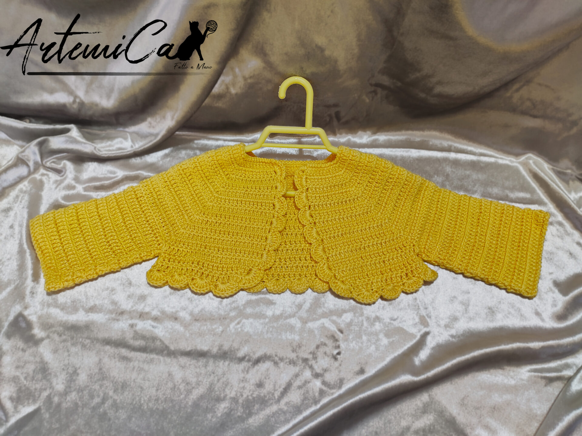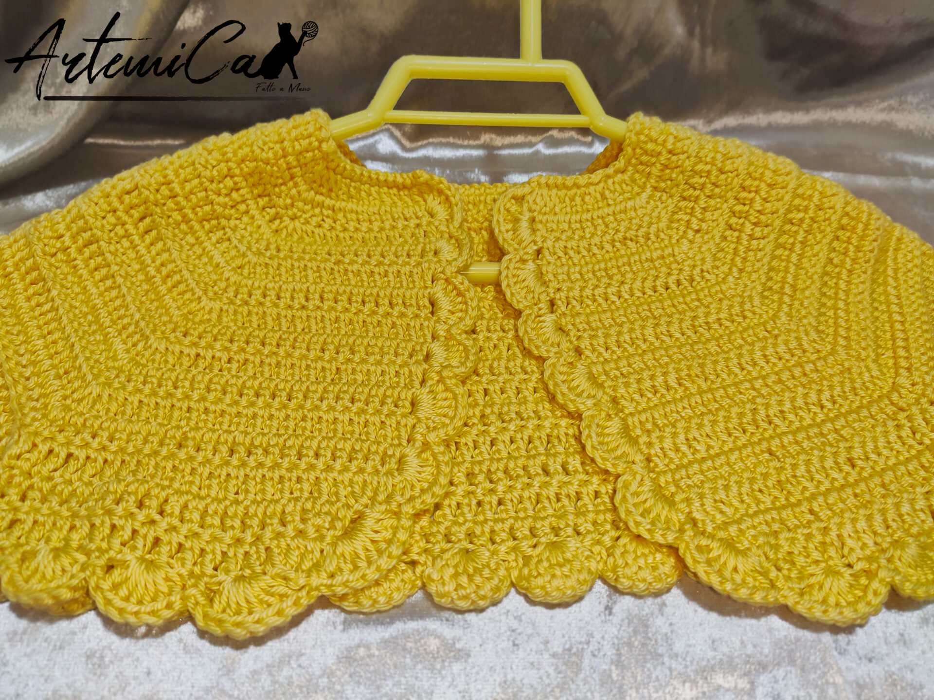 Il coprispalla giallo cattura l’attenzione con il suo colore vivace e allegro. La lavorazione a mano all’uncinetto conferisce una piacevole texture al capo. Le maniche lunghe del coprispalla offrono un tocco di calore e comfort nelle giornate più fresche, inoltre è dotato di un delizioso bottoncino a forma di cuore fucsia e bianco per un tocco extra di dolcezza e stile che lo rende facile da indossare e togliere. I bordi sono rifiniti con cura, garantendo una vestibilità confortevole e una durata duratura.