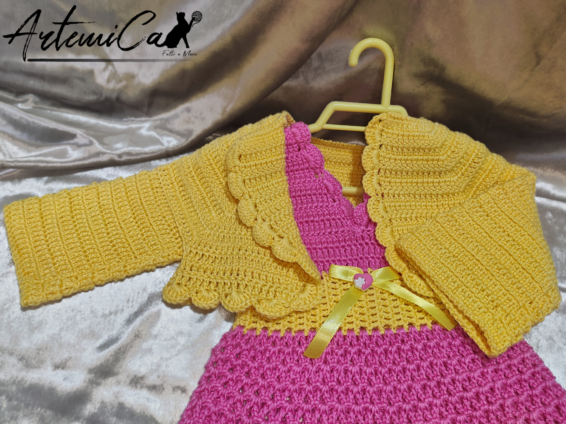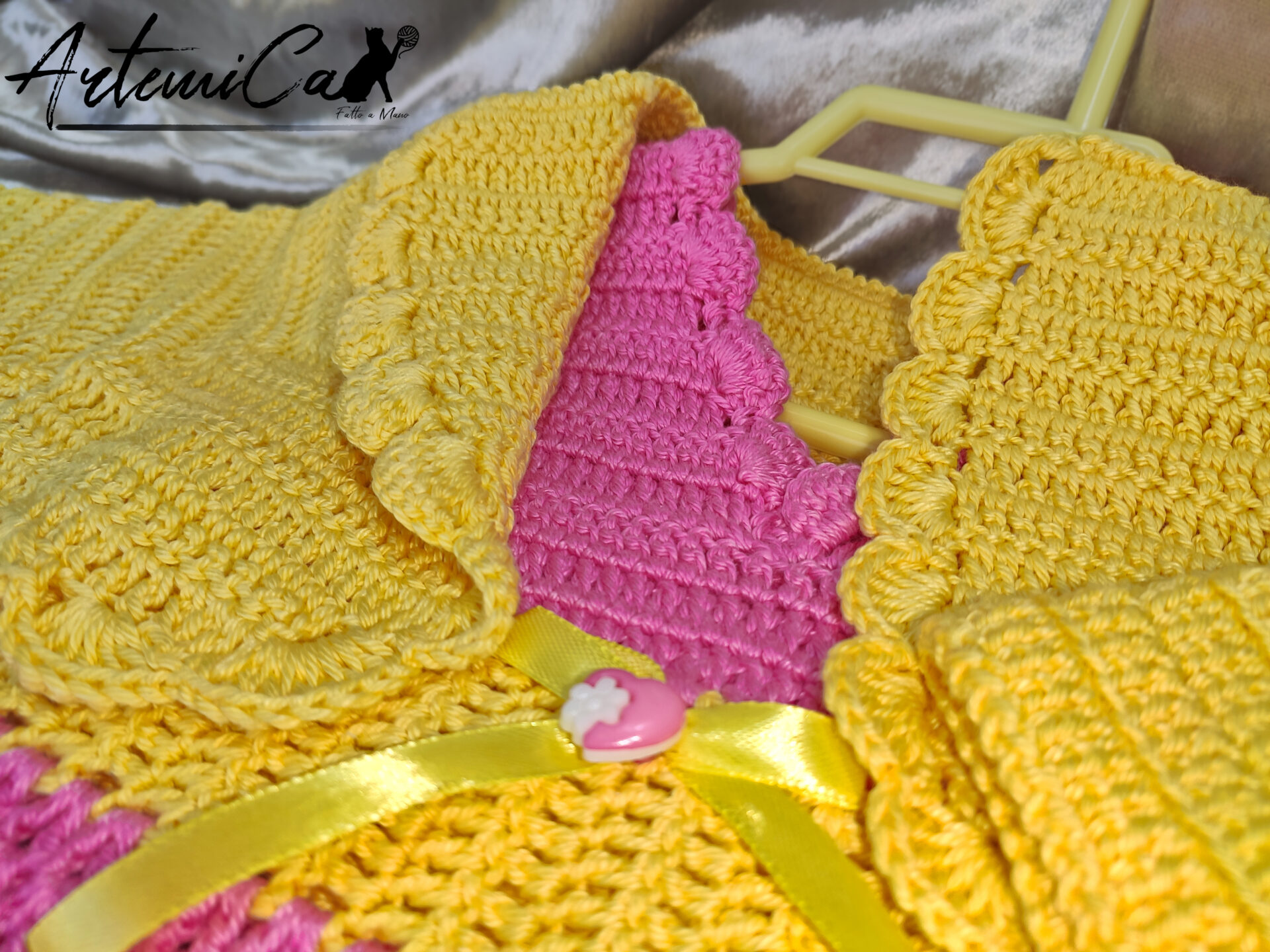 Splendore estivo per i più piccoli! Vestitino per neonati da 0 a 3 mesi. Questo set unico è composto da un coprispalla giallo e uno scamiciato fucsia e giallo, entrambi realizzati a mano con cura e maestria all’uncinetto.