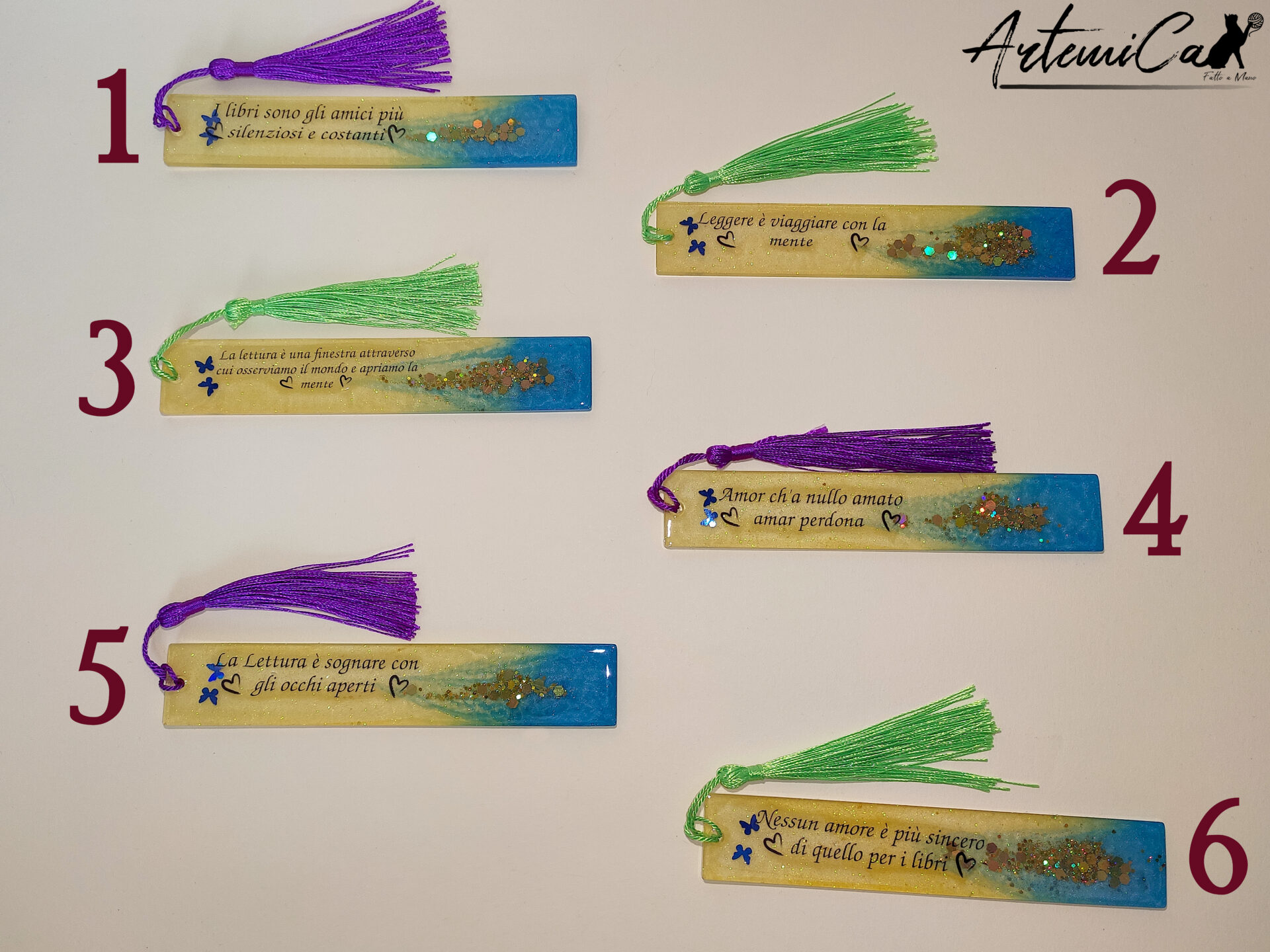 Ora entriamo nei dettagli scintillanti di questo fantastico segnalibro fatto a mano in resina. Immagina un mix di giallo e blu, arricchito da brillantini dorati che catturano la luce in modo incantevole. Farfalle blu e cuoricini stilizzati danzano sulla sua superficie, regalando un tocco di dolcezza e romanticismo.